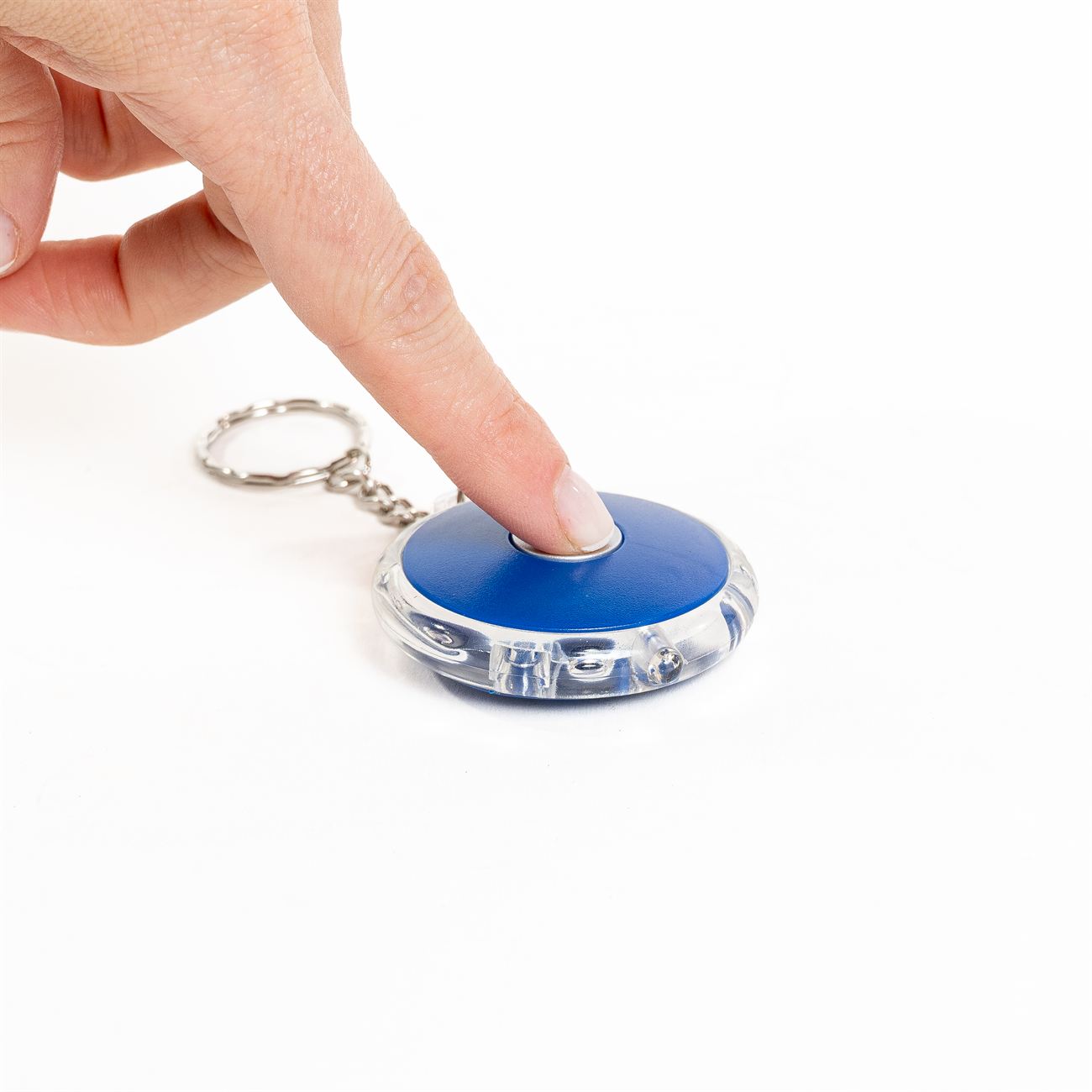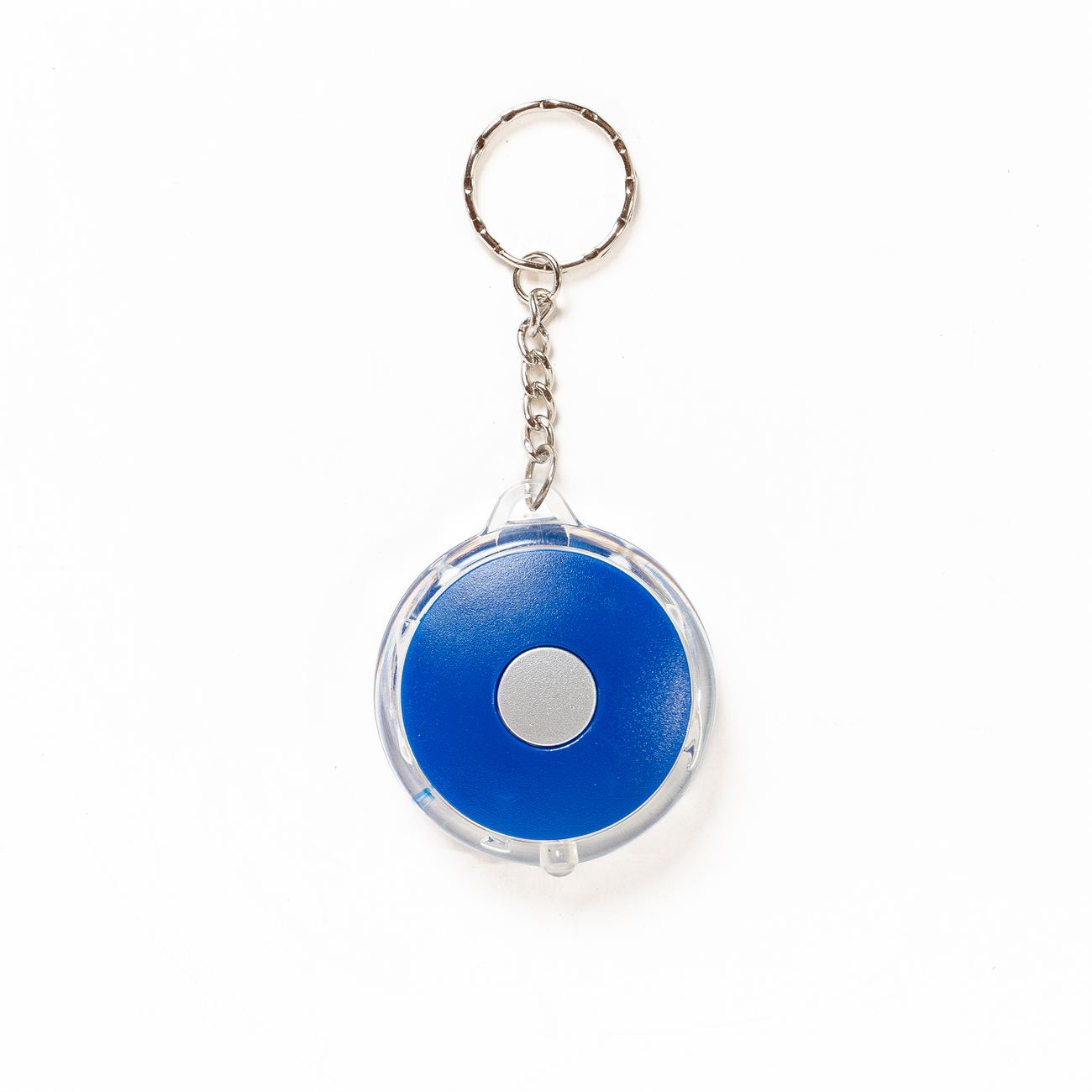 Llavero con Luz Circular Descripción: Llavero con luz circular. Material: plástico. Dimensiones: 5cm de diámetro, superficie de impresión 4cm.