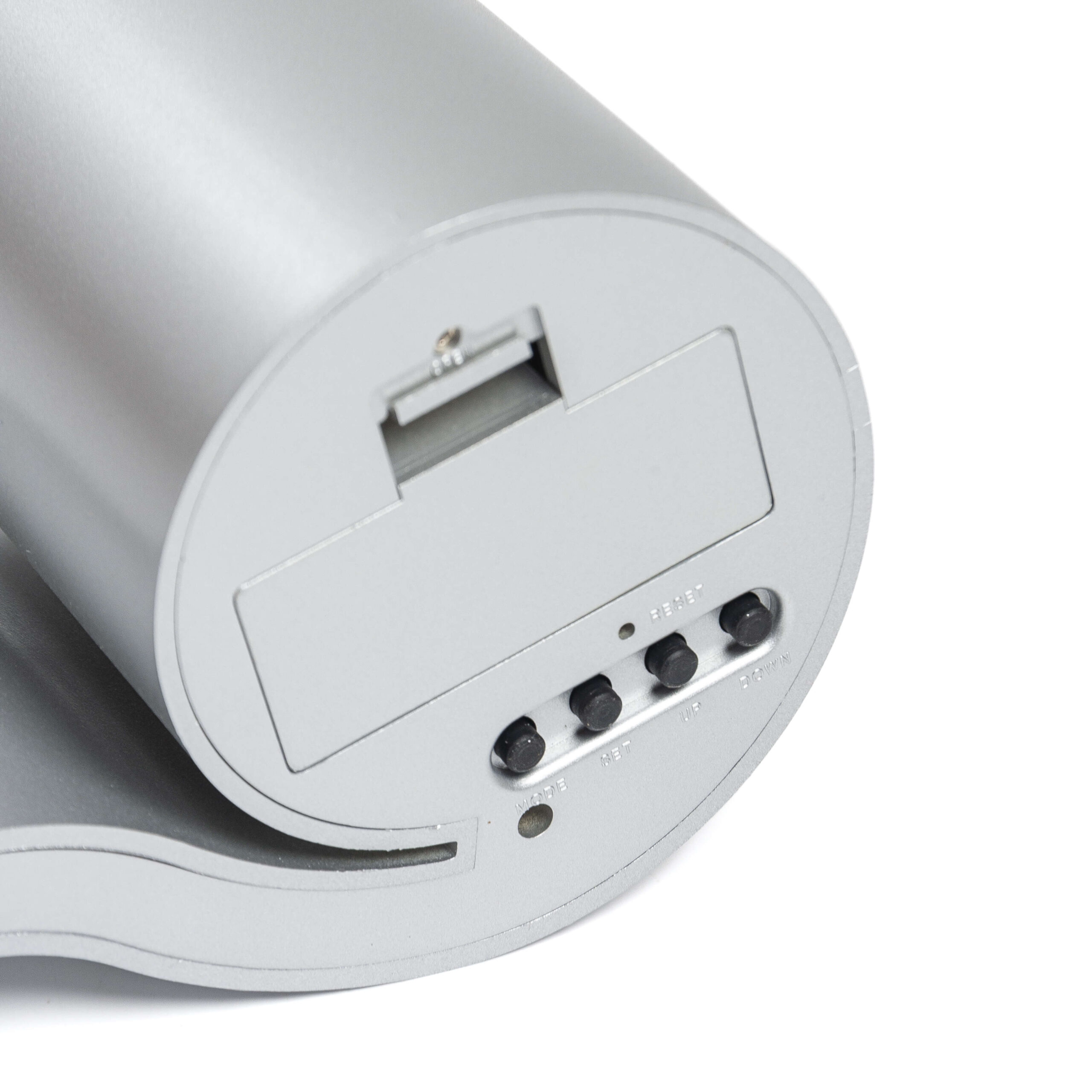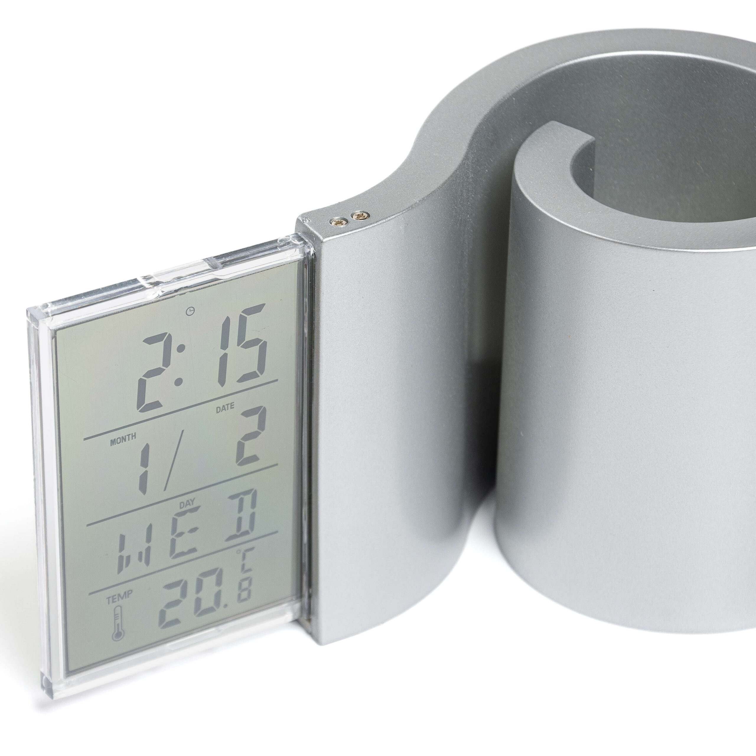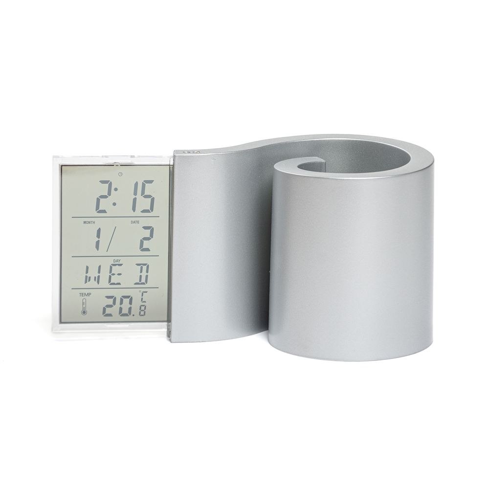Descripción: Portalápiz con reloj de escritorio, indicador de hora, fecha, día y temperatura. Requiere dos pilas AAA. Caja contenedora de cartón gris e instrucciones.
