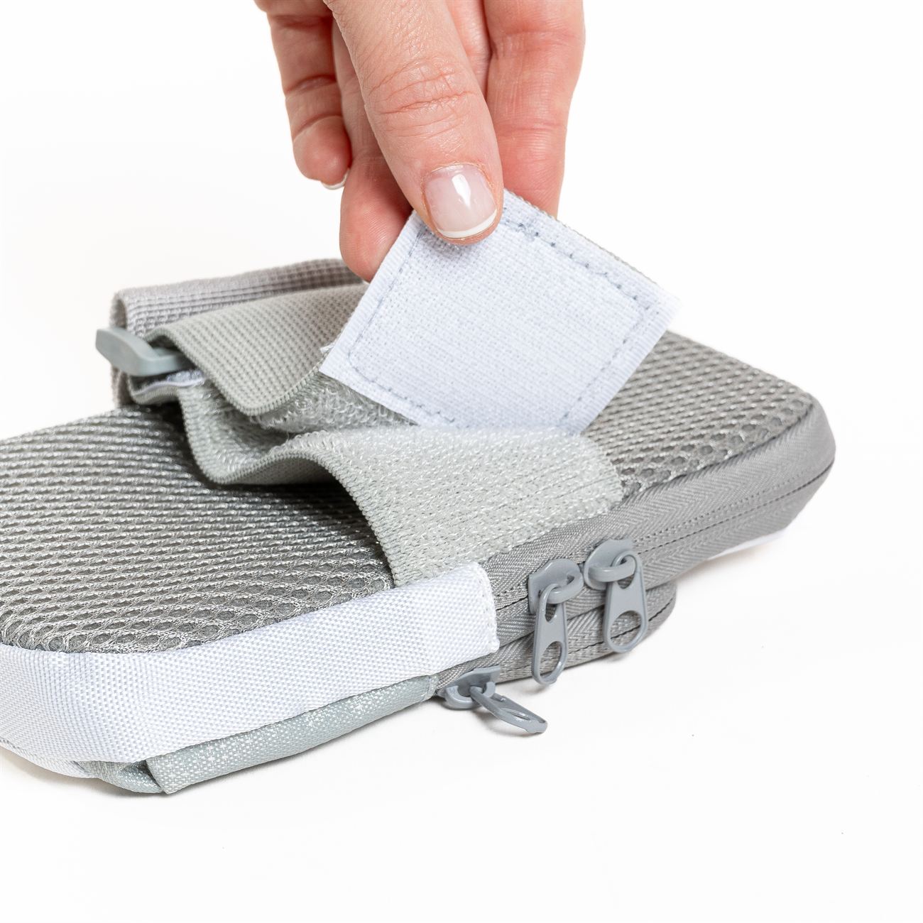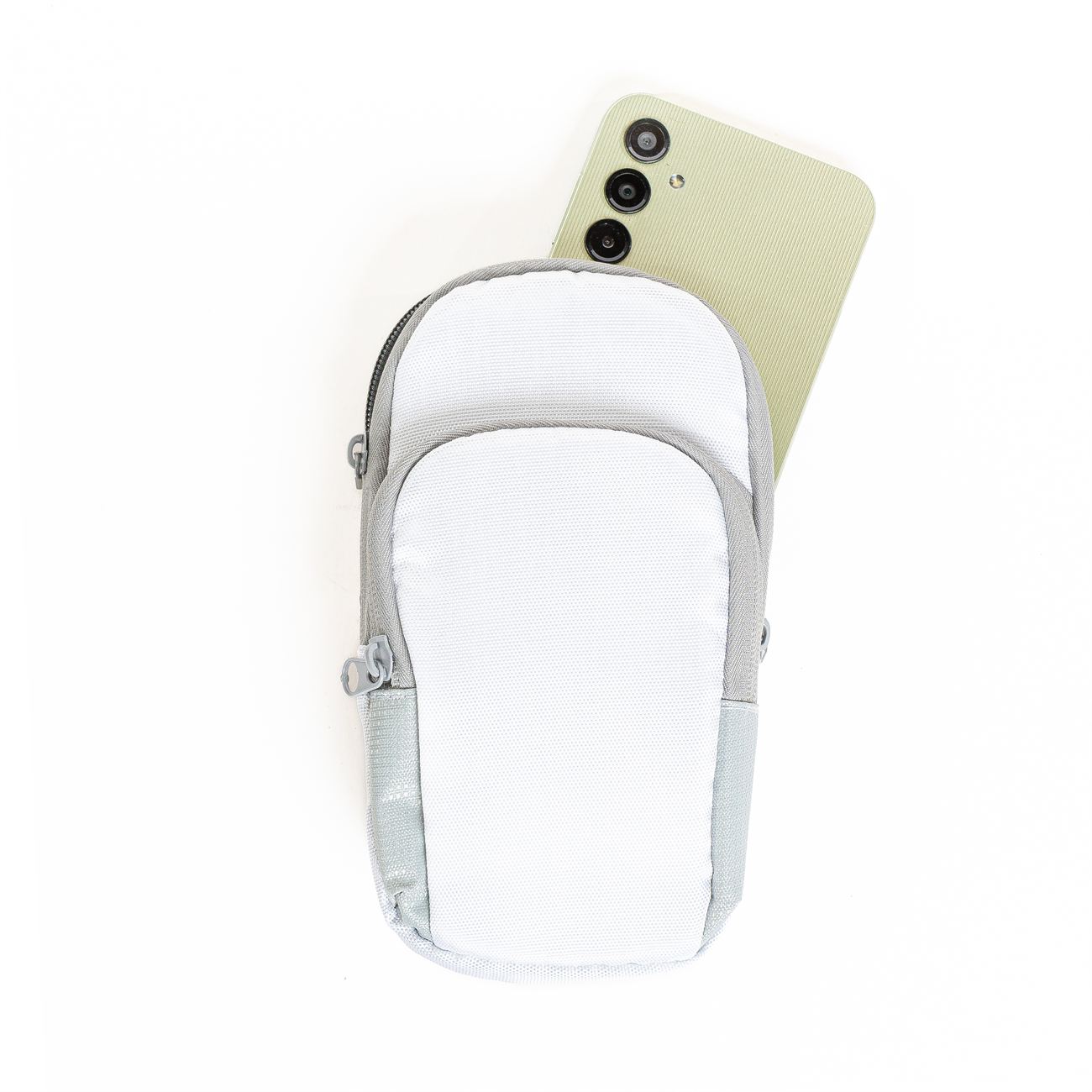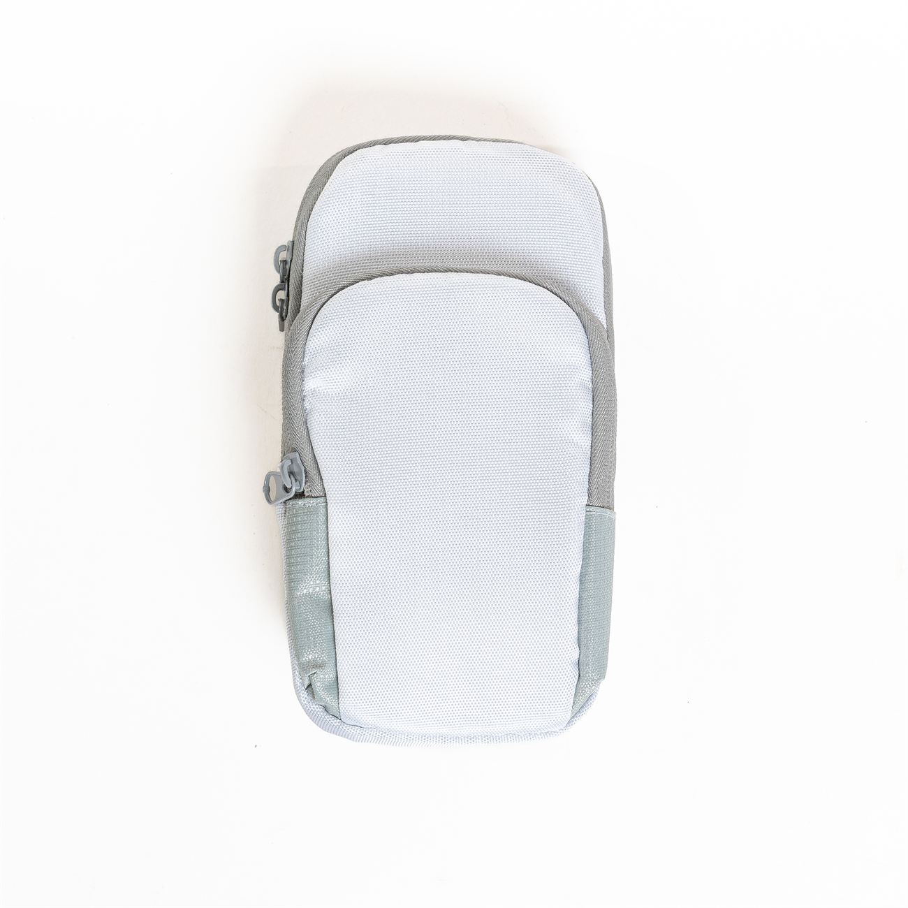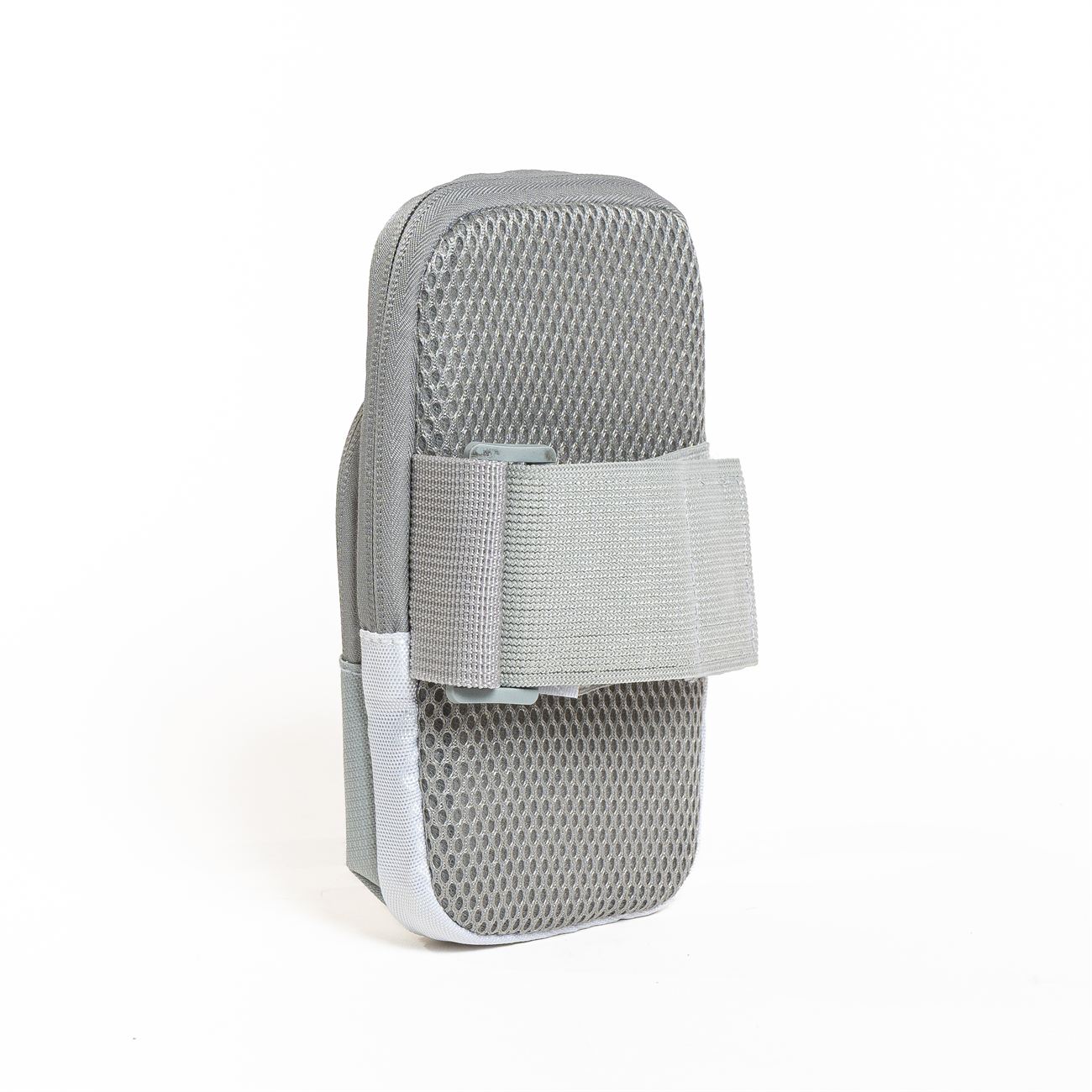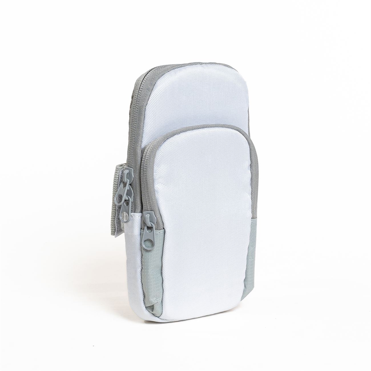 Descripción: Brazalete porta celular. Bolsillo contenedor para el celular de 18cm x 9cm con cierre doble, bolsillo frontal de 14cm x 8cm con cierre. Sector interno de contacto con red, interiores forrados, paredes acolchadas. Cinta del brazalete regulable elástica con velcro.