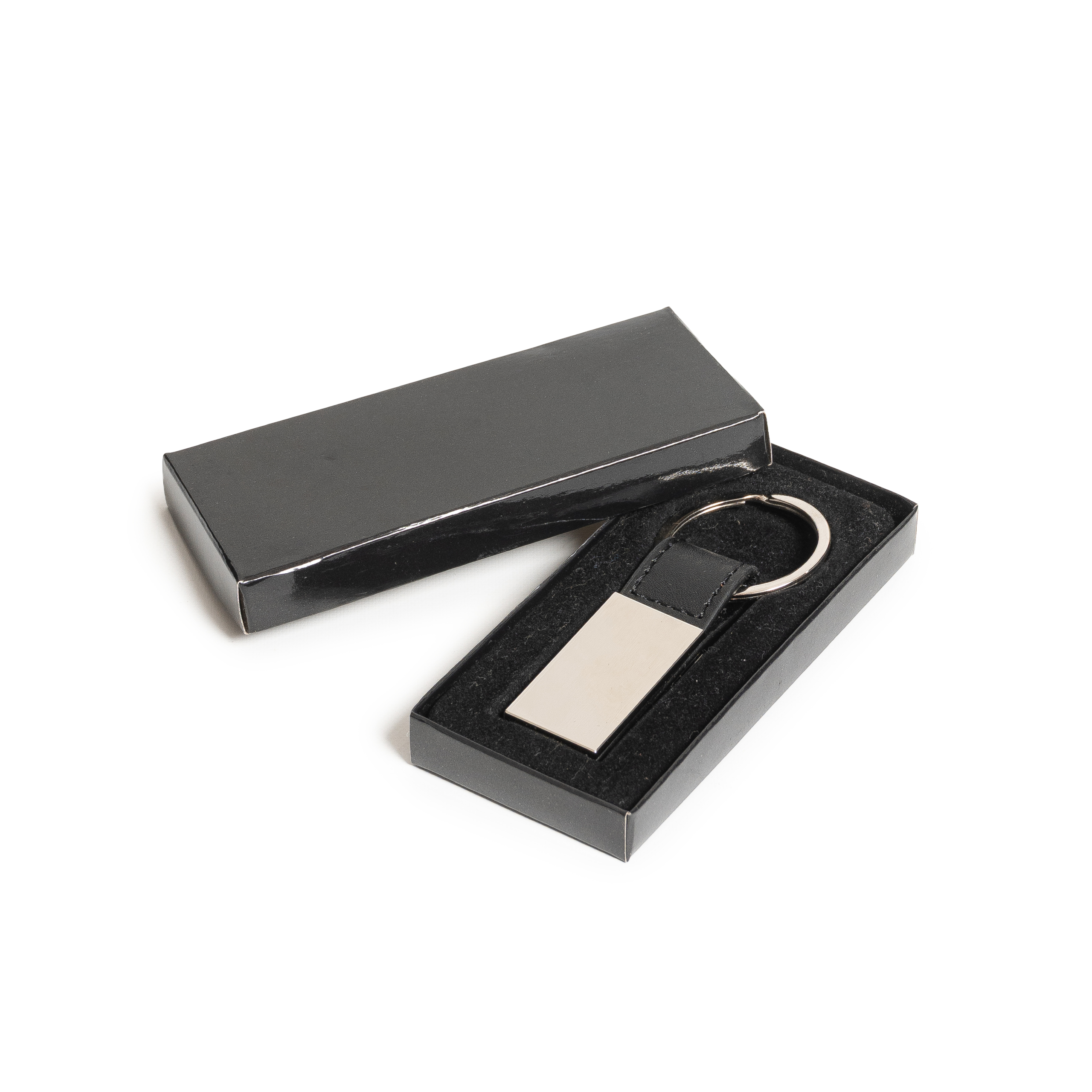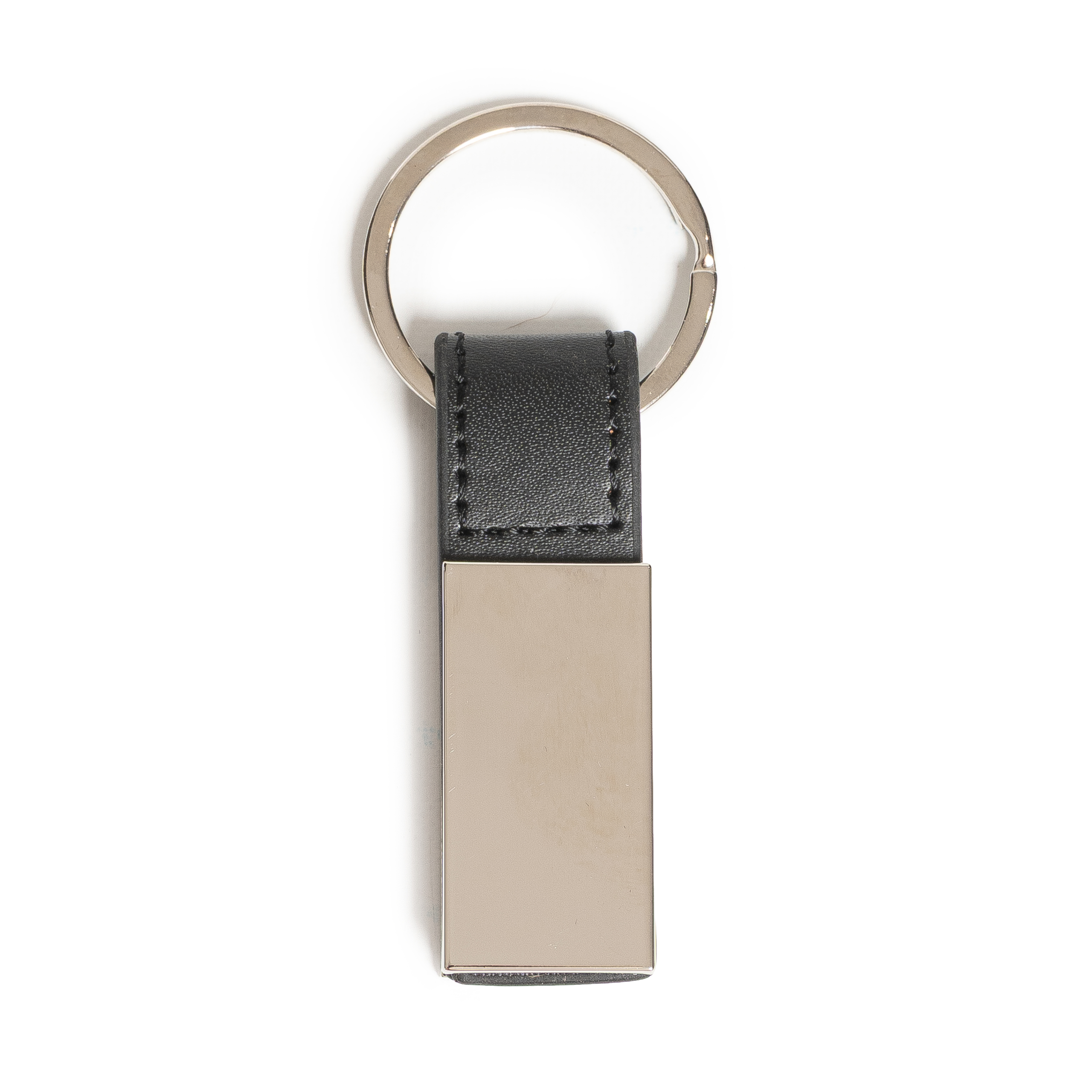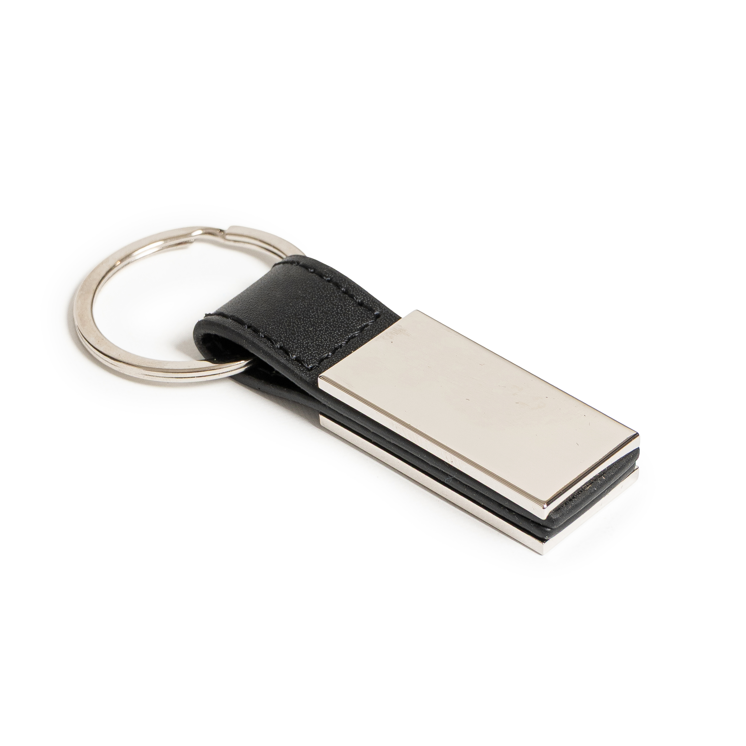 Llavero metálico brillante Con accesorio de cuero corto. Dimensiones: Area impresión 4cm x 2 cm.