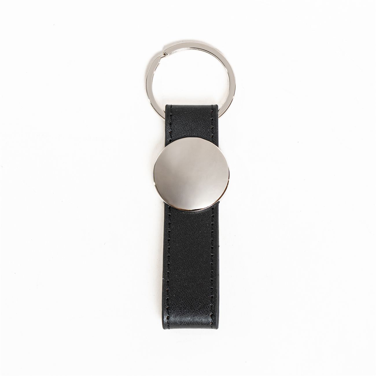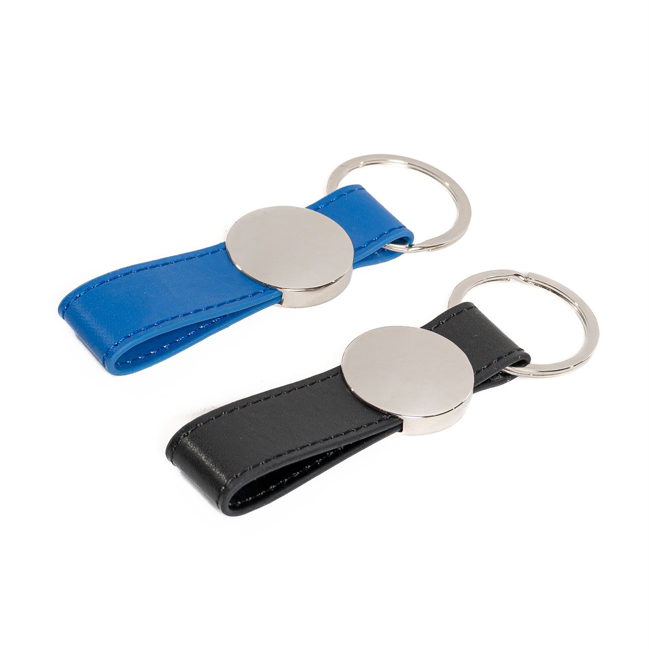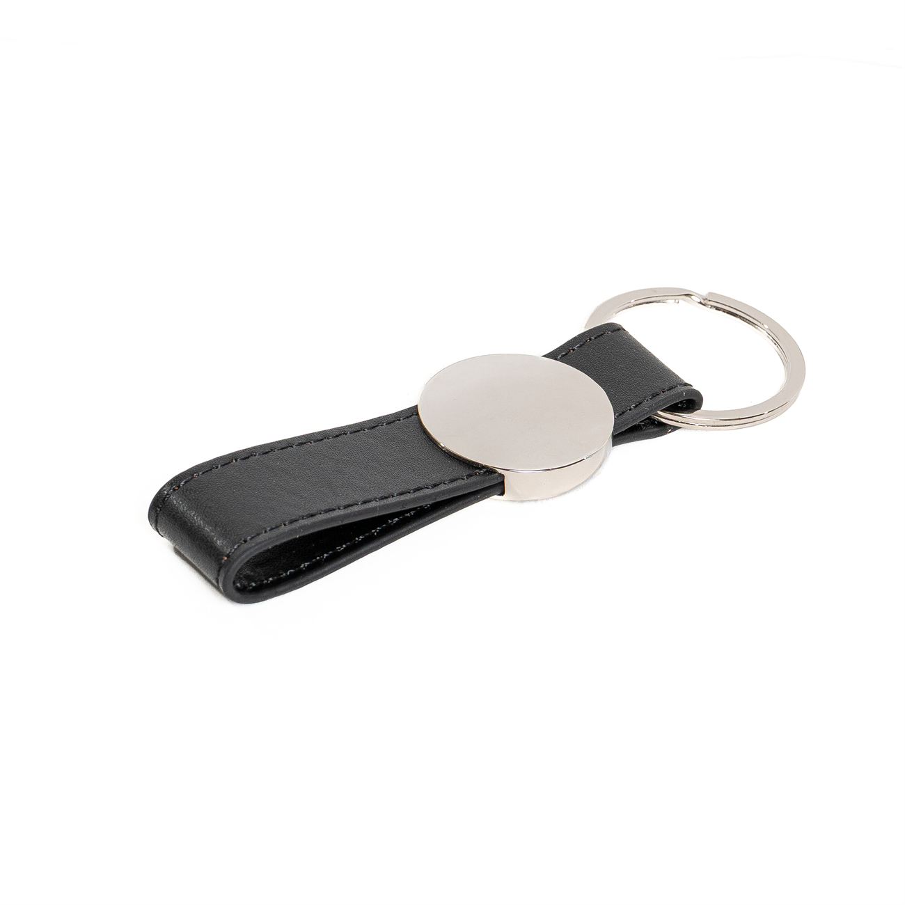 Llavero metal circular con simil cuero MATERIAL: Metal y simil cuero. MEDIDAS: 8cm x 3cm, circulo de 3cm de diámetro.