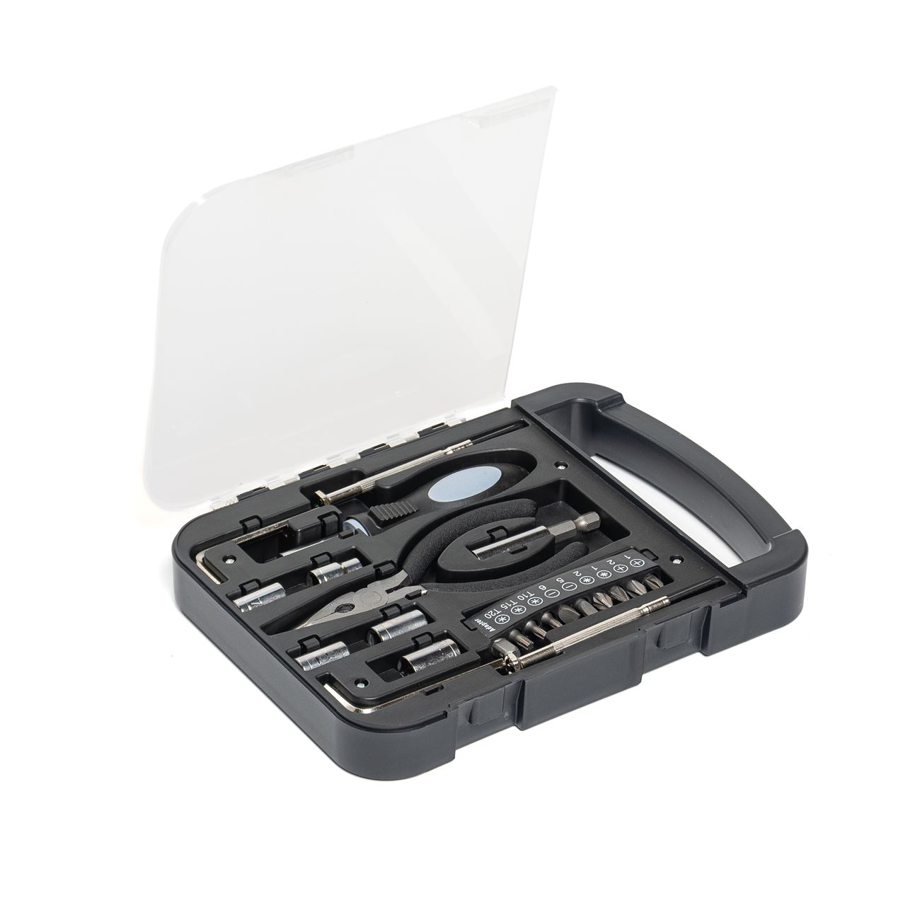 Descripción: Set de herramientas en estuche plástico termoformado con tapa traslucida y manija. Contiene una pinza, destornillador con nueve puntas intercambiables, dos extensores y 5 tubos, y dos destornilladores pequeños y dos llaves Allen.