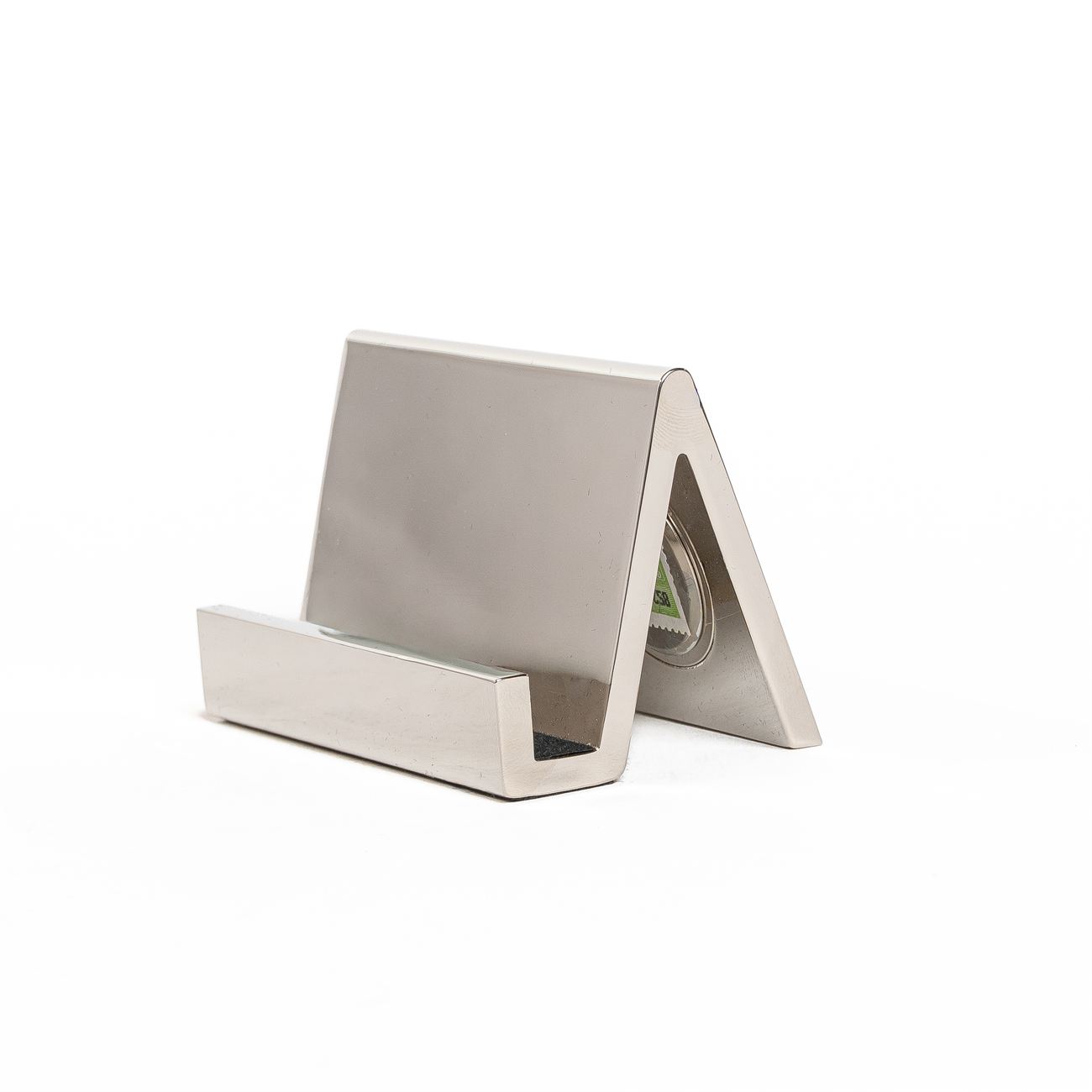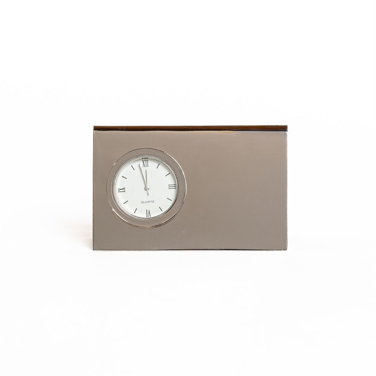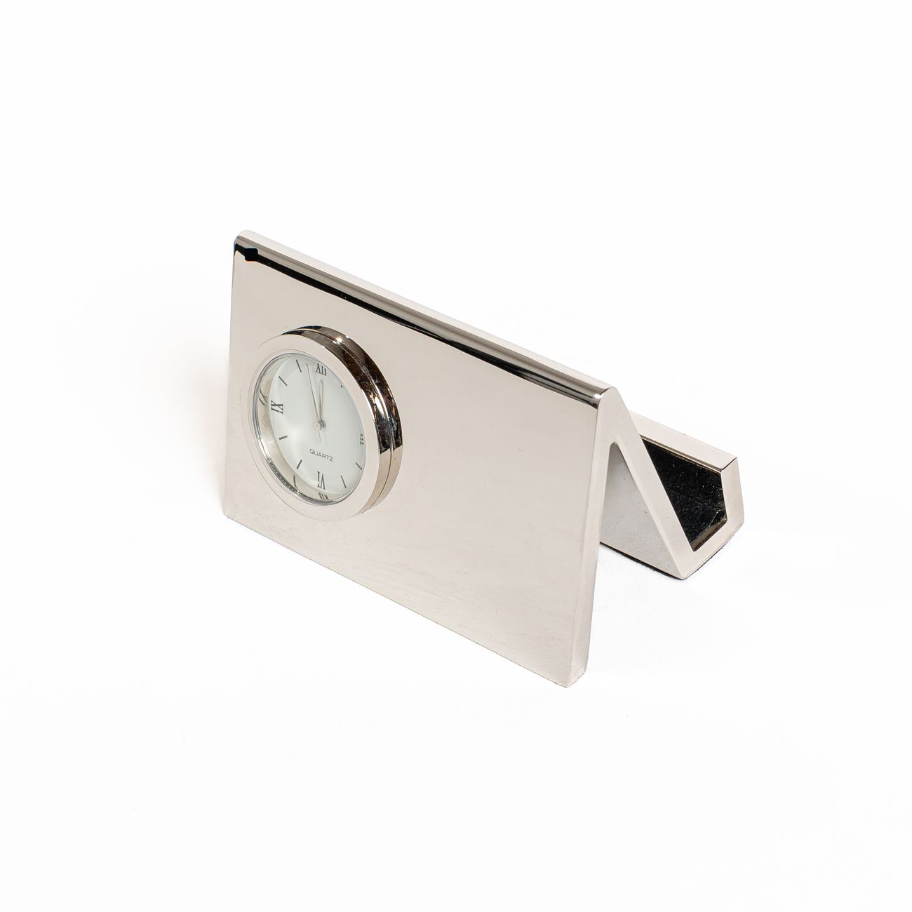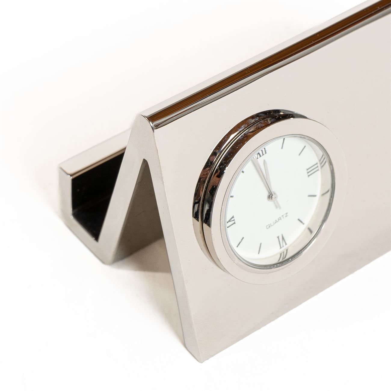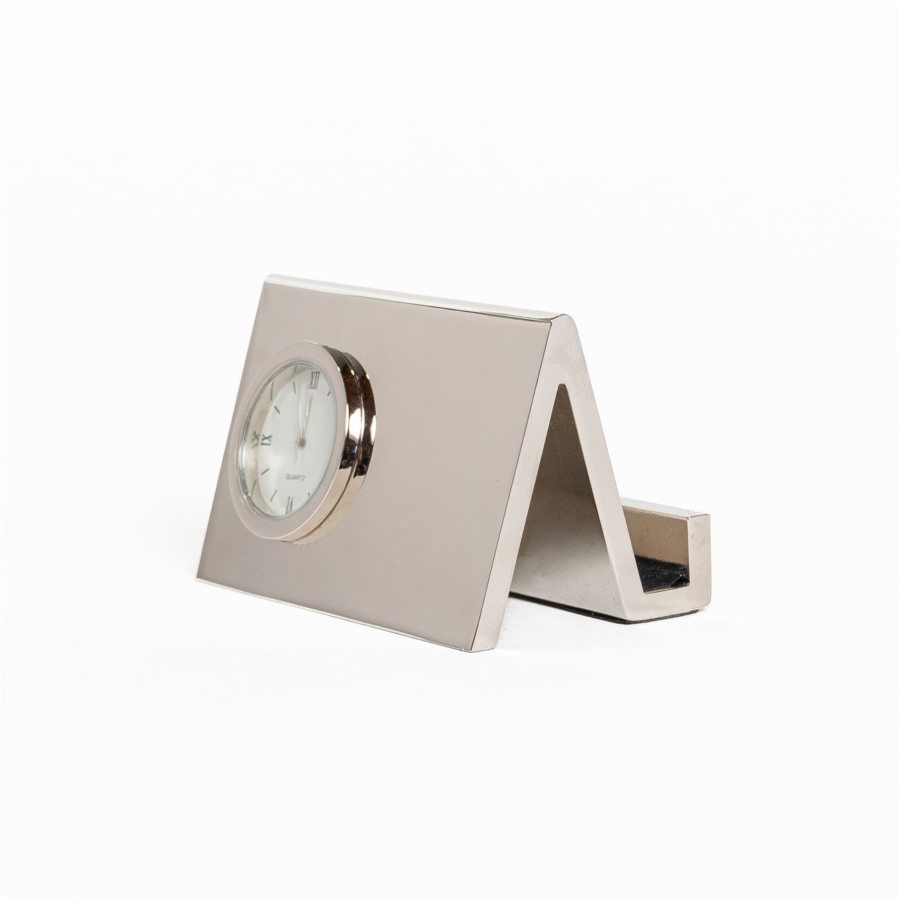 Reloj de Escritorio Metálico con Porta tarjetas Descripción: Reloj de escritorio análogo metálico con porta tarjeta, terminación en cromo. Presentación en caja de cartón negro. Dimensiones: 5,5cm x 8.5cm. Material: Metal.