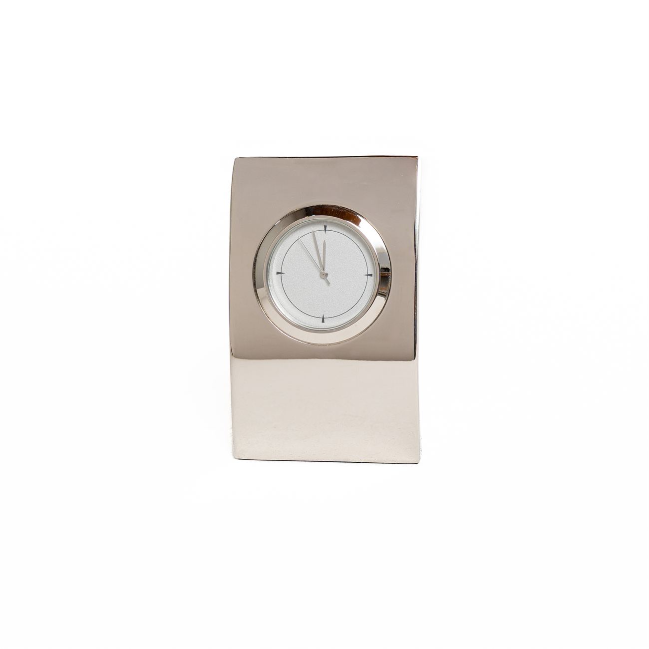 Reloj de Escritorio Curvo Metálico Descripción: Reloj de escritorio análogo curvo metálico, terminación en cromo. Presentación en caja de cartón negro. Dimensiones: 8cm x 5cm. Material: Metal.