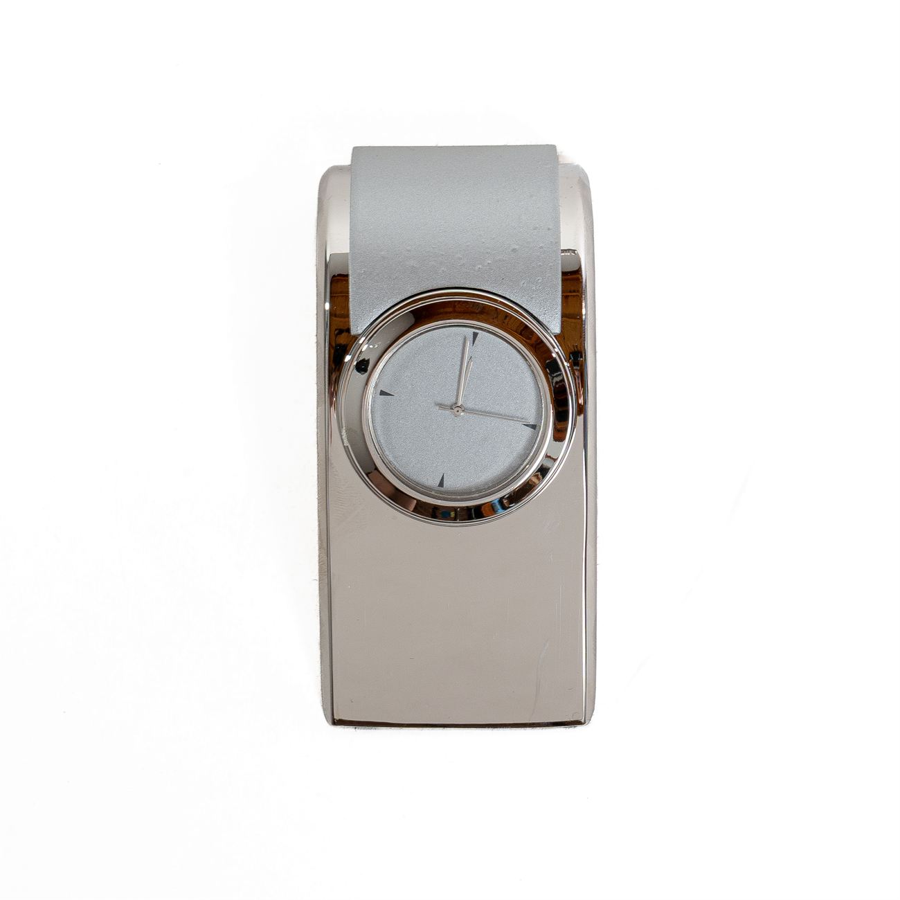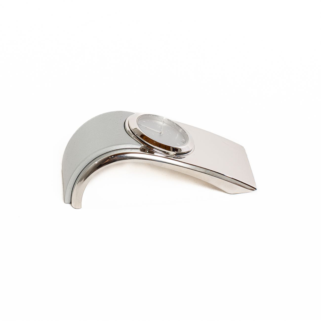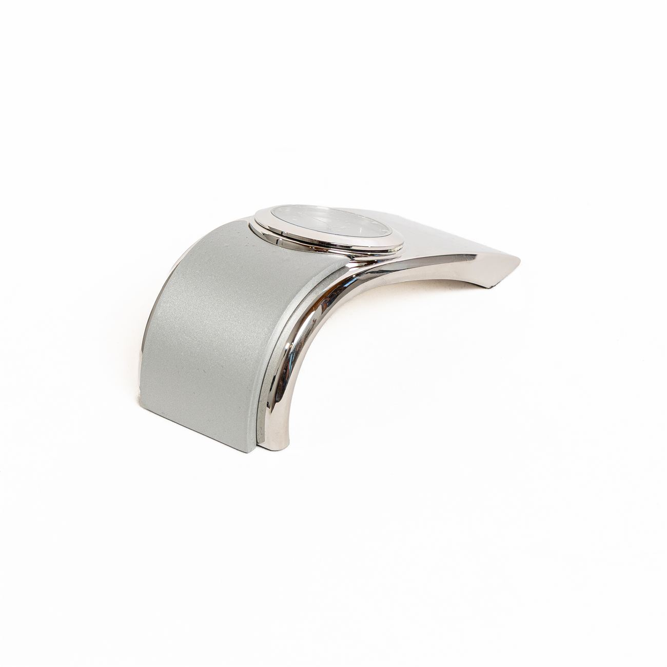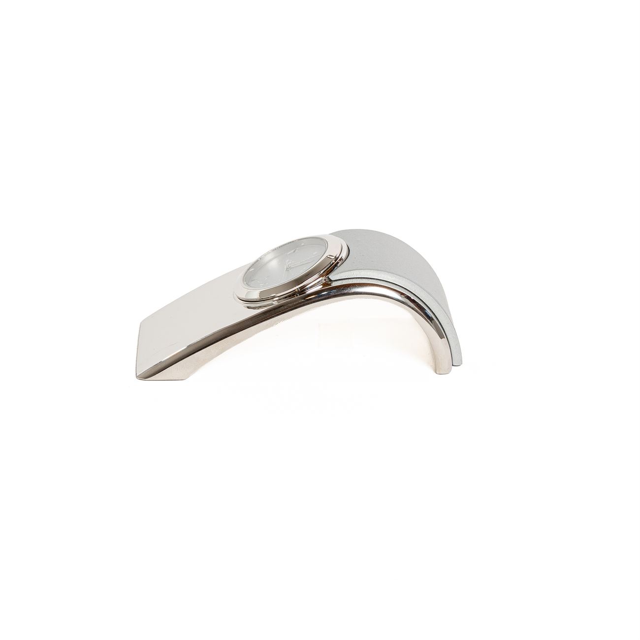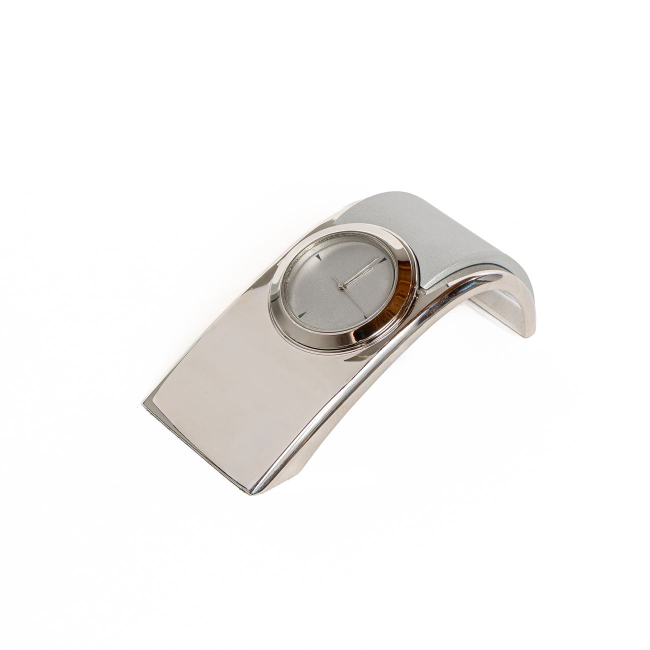Reloj de Escritorio Curvo Metálico Descripción: Reloj de escritorio análogo curvo metálico, terminación en acero cepillado y cromo. Presentación en caja de cartón negro. Dimensiones: 10cm x 4,5cm. Material: Metal.