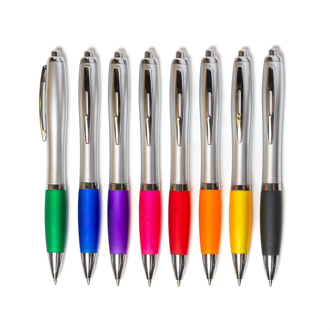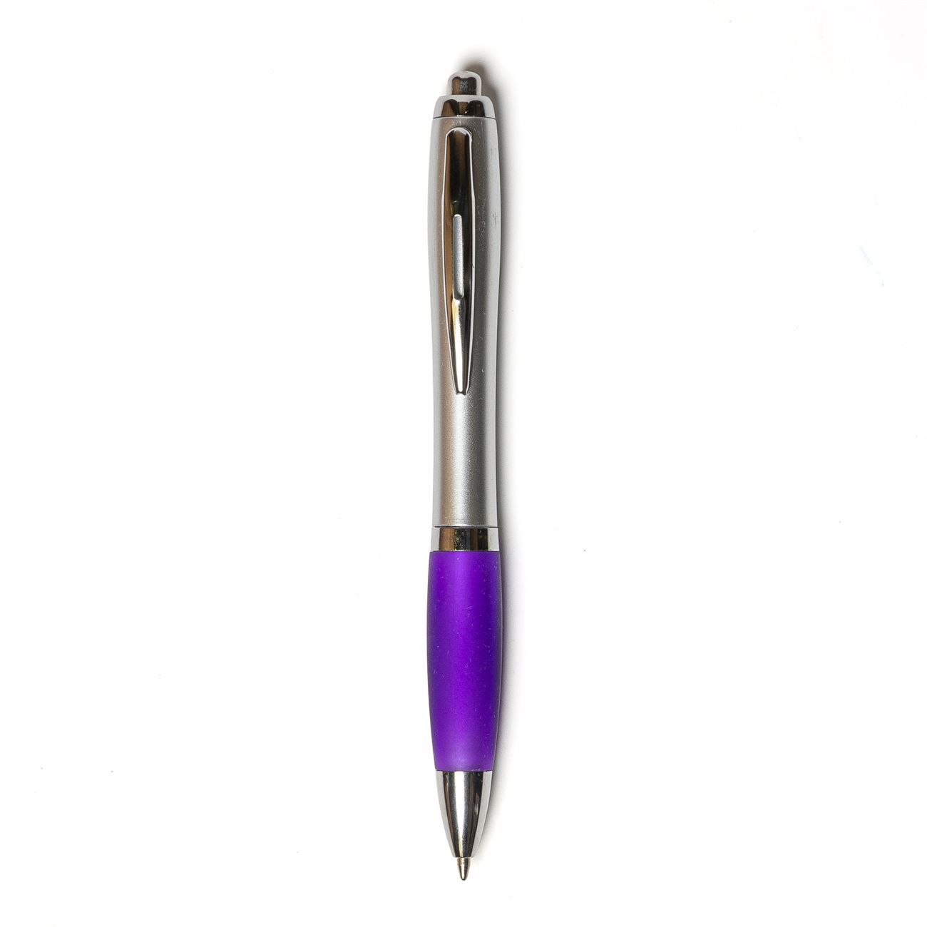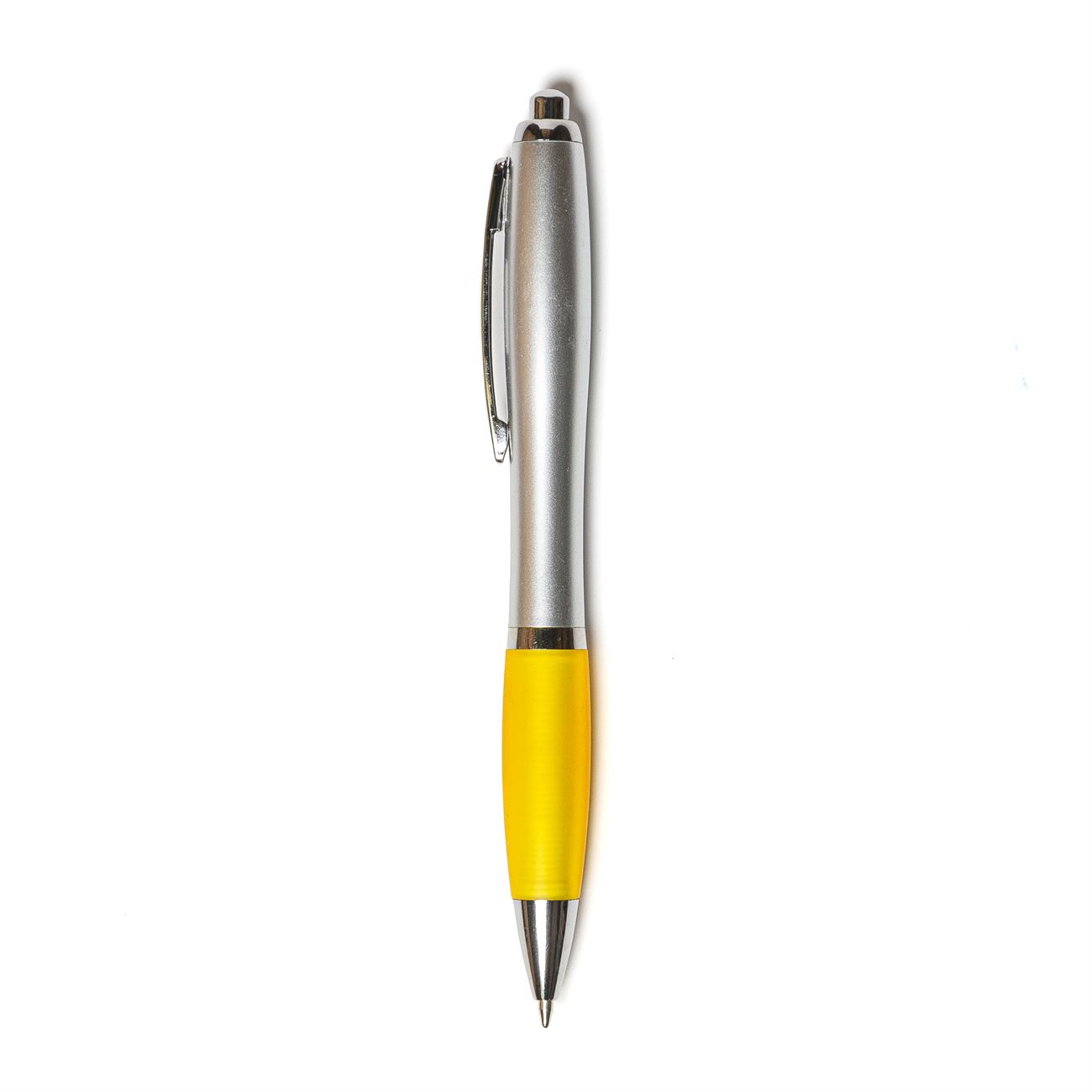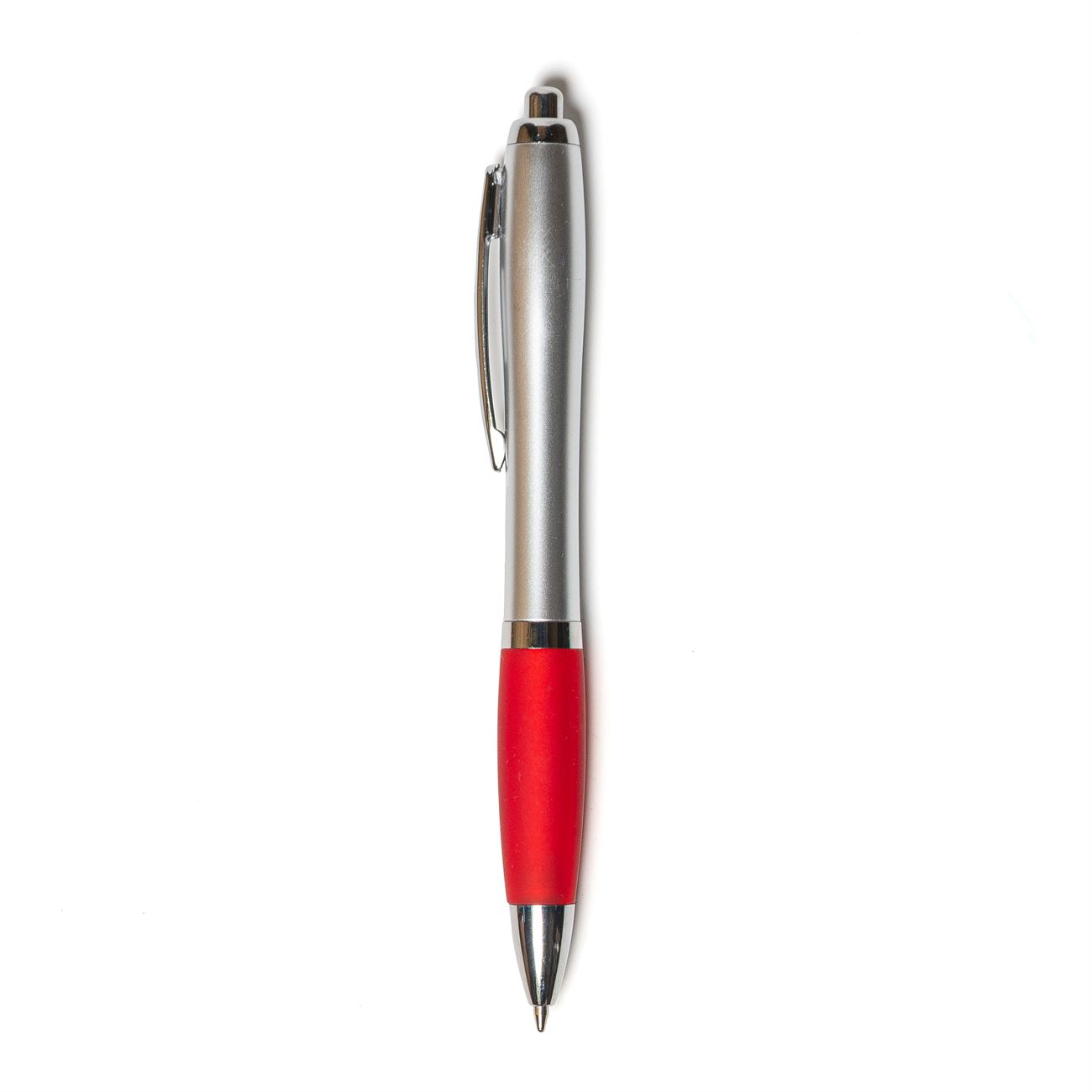 Bolígrafo retráctil, cuerpo plateado con grip de color.