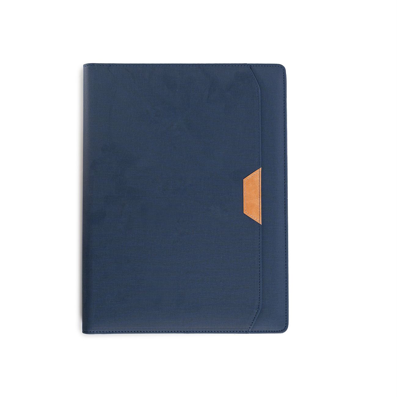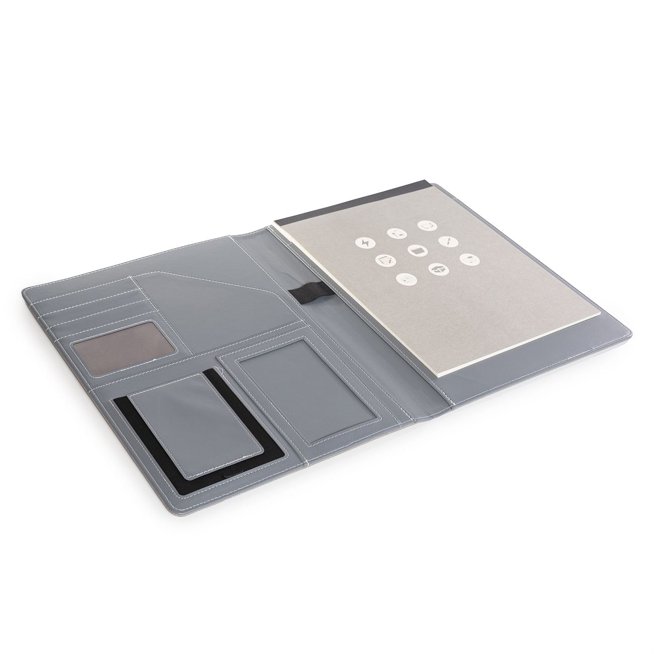 Protfolio en PU simil gabardina. Frente con un bolsillo con detalle en simil cuero. En su interior, solapa para papeles, y sobre ella diversos porta tarjetas, bolsillo principal y dos al frente (uno elastizado). Porta bolígrafo central y block de 30 hojas rayadas.