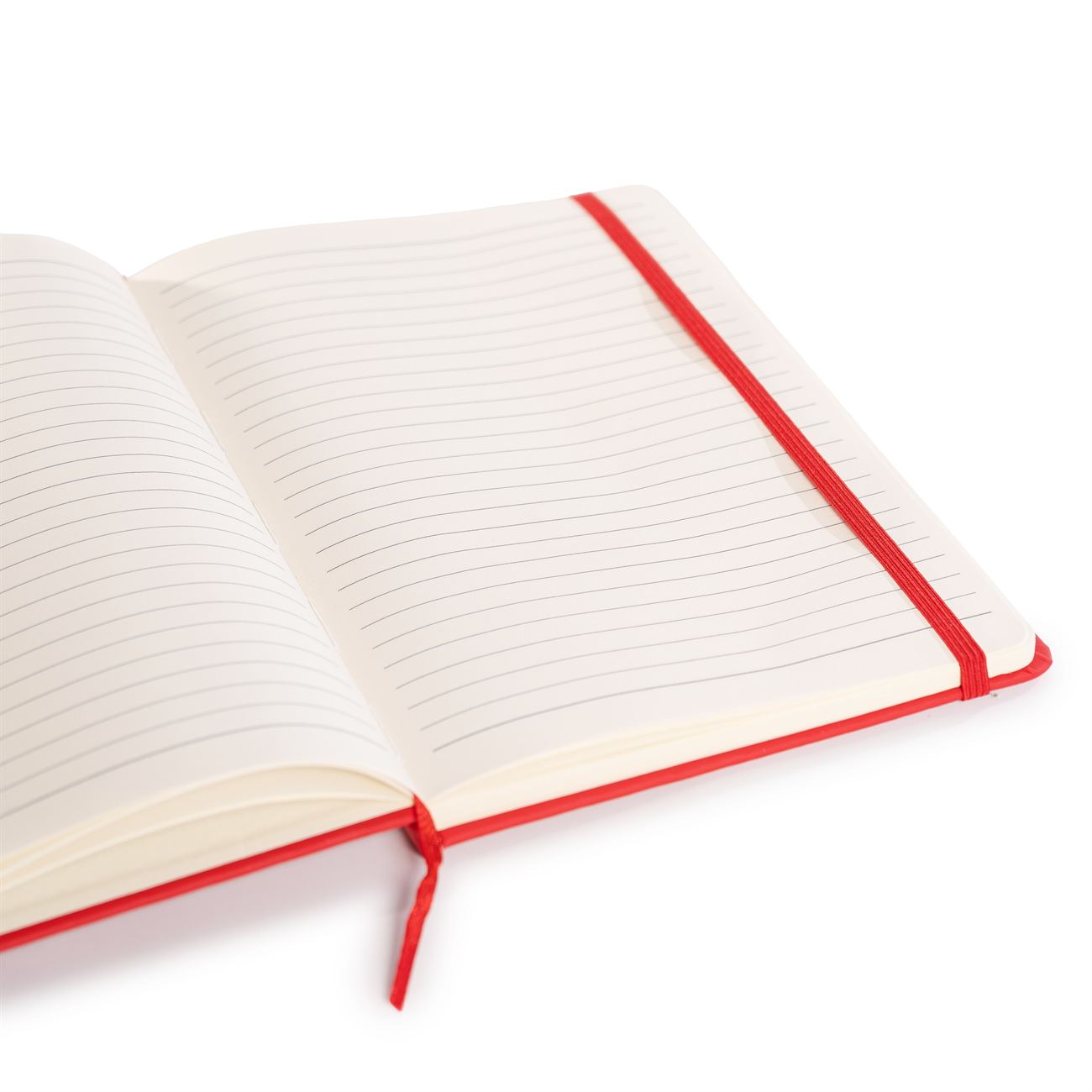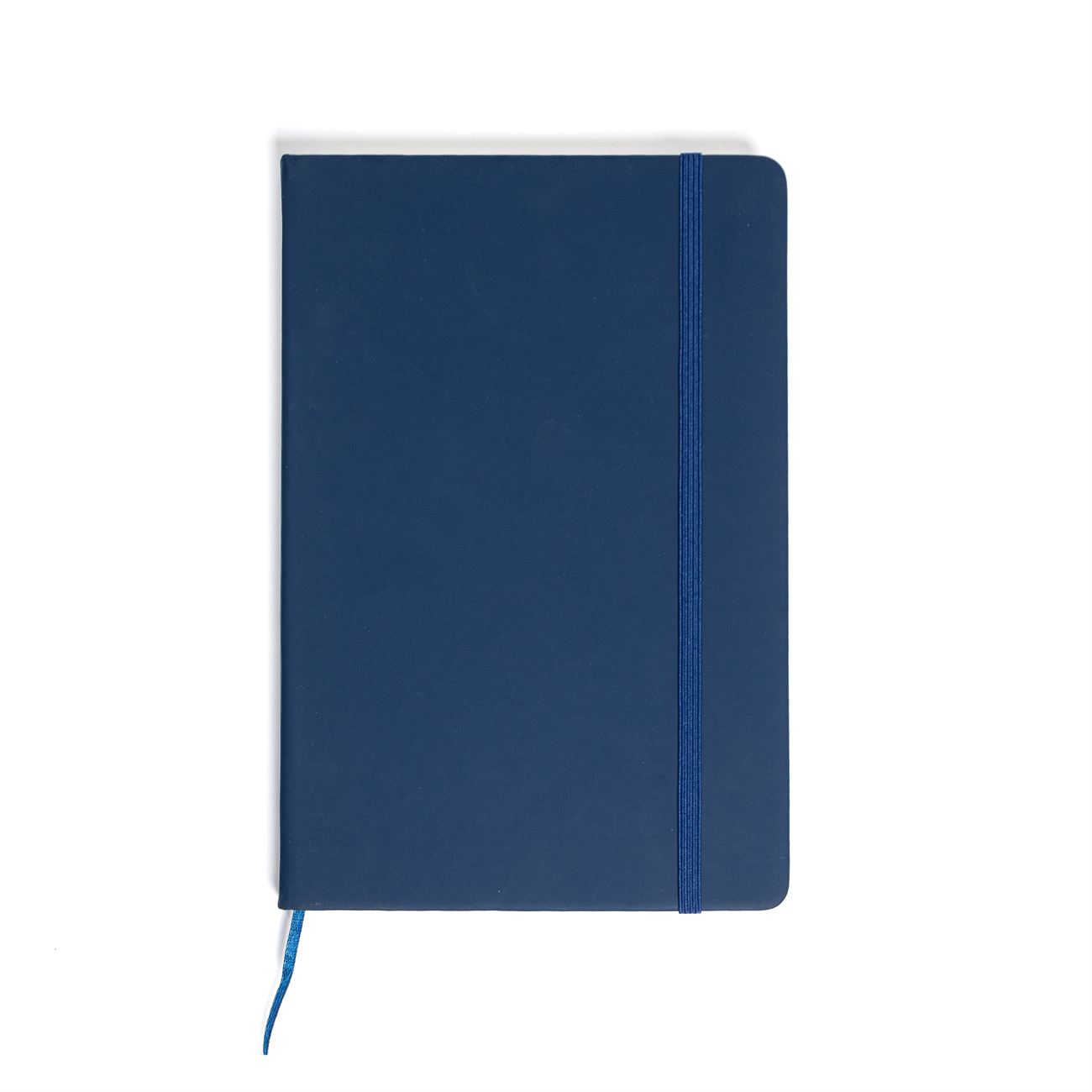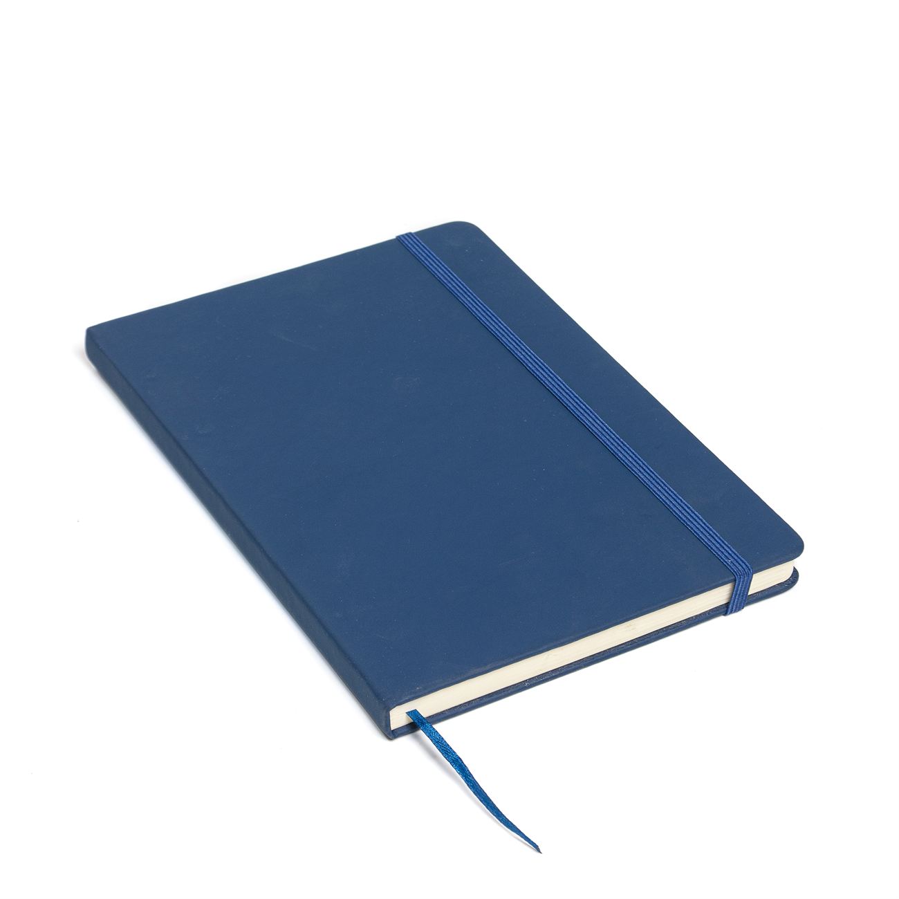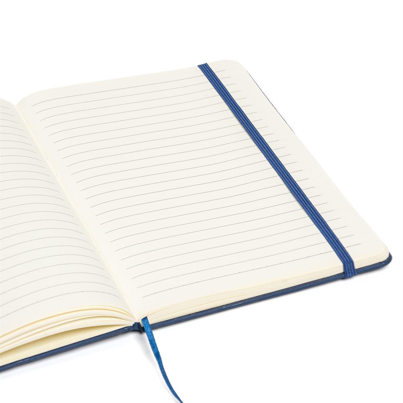 Cuaderno de tapas duras forrado en simil cuero PU. Posee 80 hojas rayadas, banda elástica de sujección al tono y cinta señaladora.