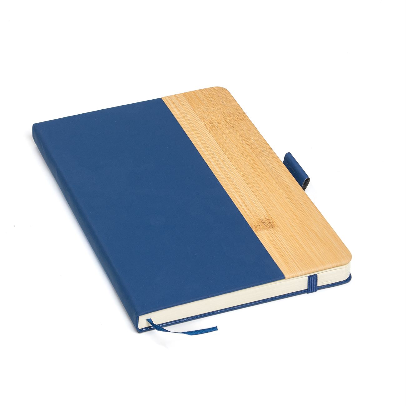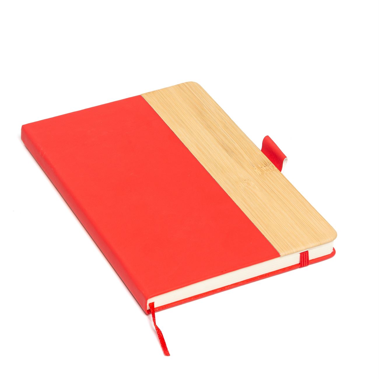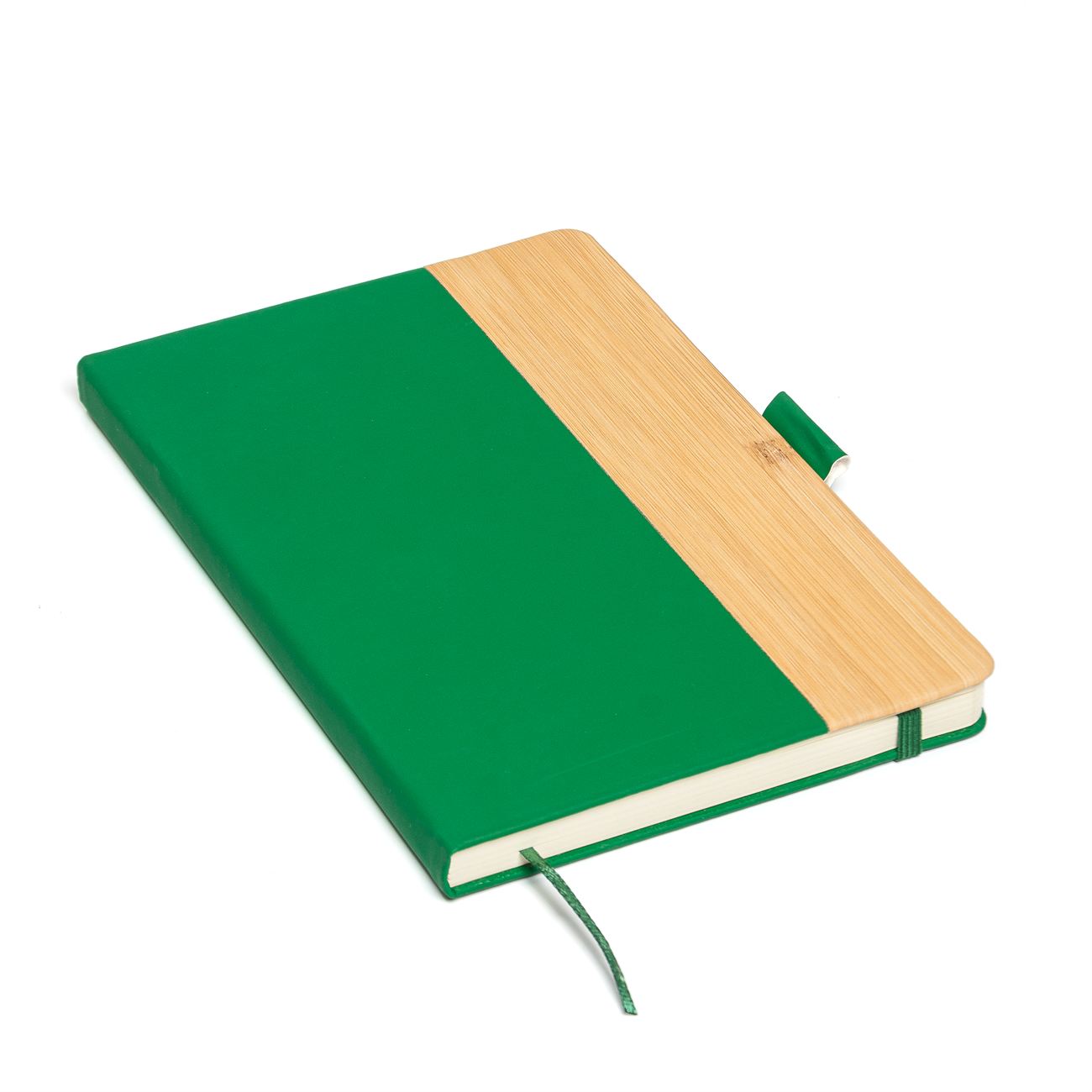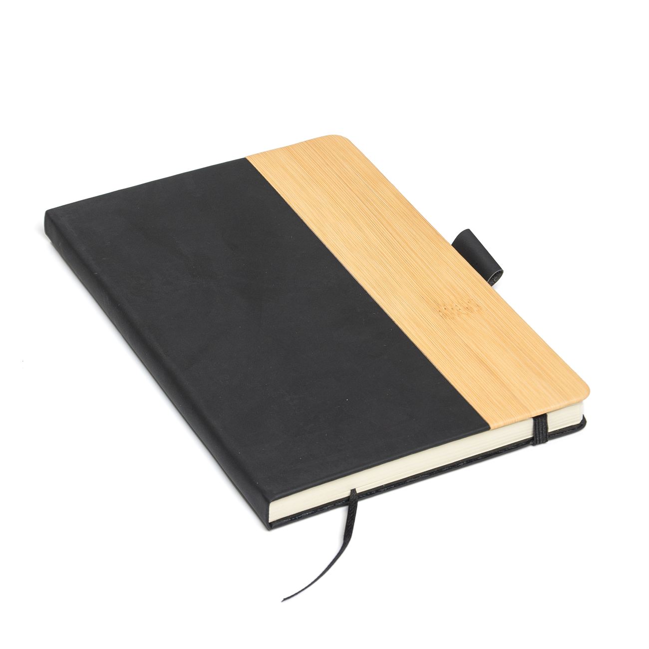 Cuaderno de tapas duras con detalle en bamboo forrado en simil cuero. Posee 100 hojas rayadas, banda elástica de sujección al tono y cinta señaladora. Sujetador de bolígrafo.