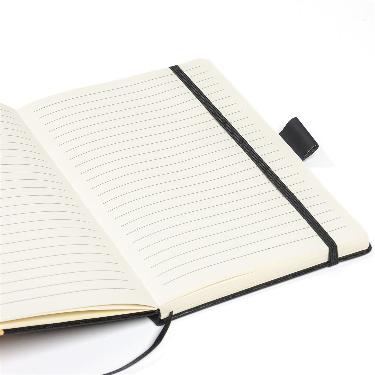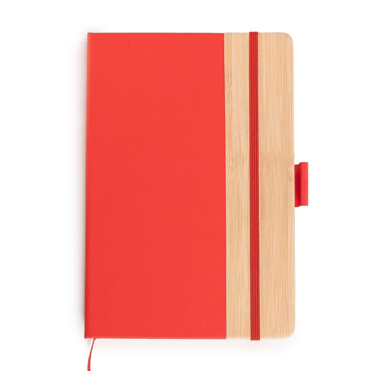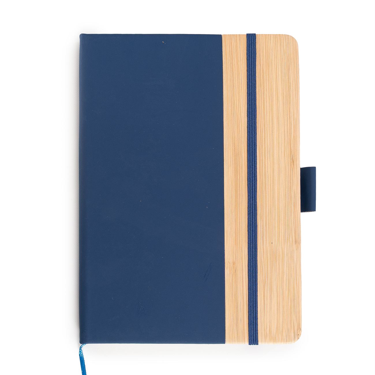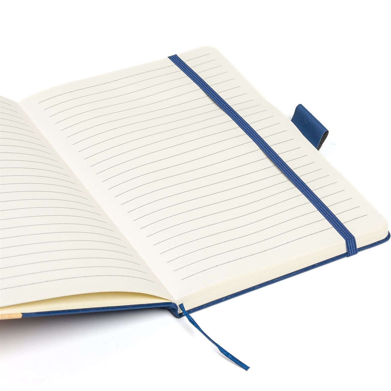Cuaderno de tapas duras con detalle en bamboo forrado en simil cuero. Posee 100 hojas rayadas, banda elástica de sujección al tono y cinta señaladora. Sujetador de bolígrafo.
