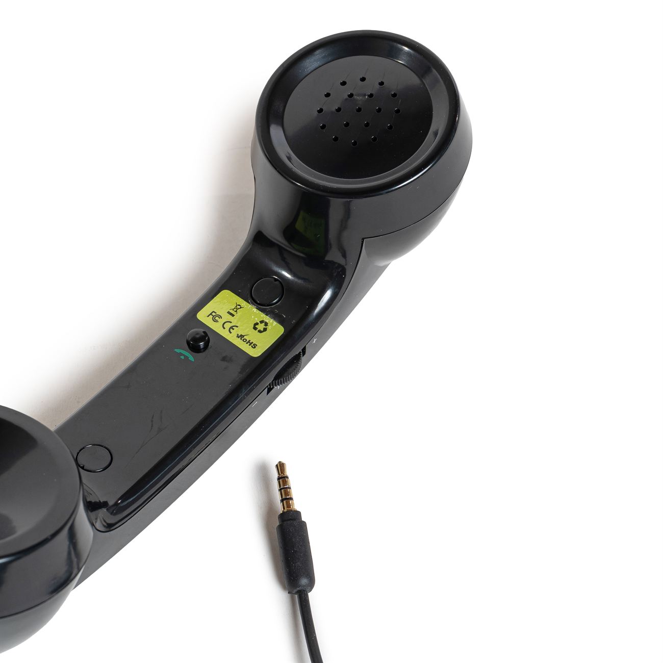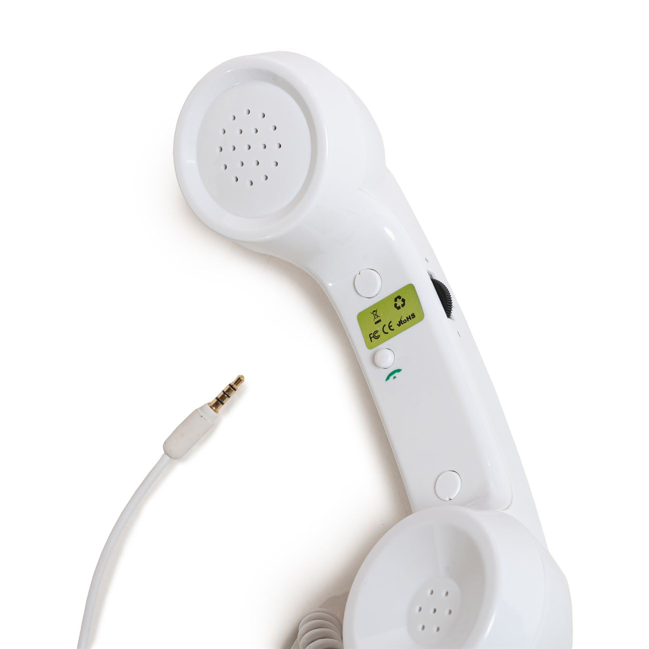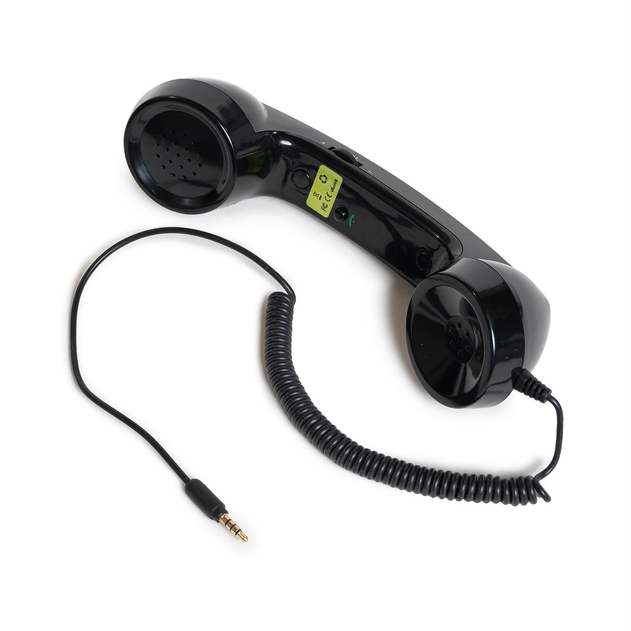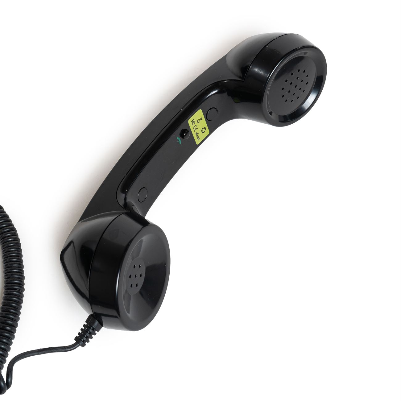 Descripción: Auricular tipo teléfono vintage. Se puede conectar a todo tipo de celular. Trae botón de atención de llamada y corte, regulador de volumen. Estuche de cartón con ventana. Material:Plástico. Medidas: 20cm x 5cm.