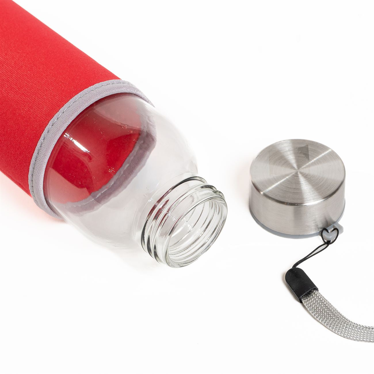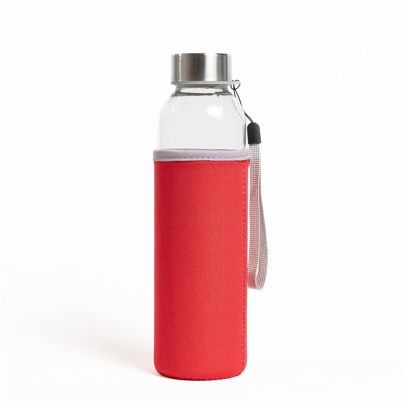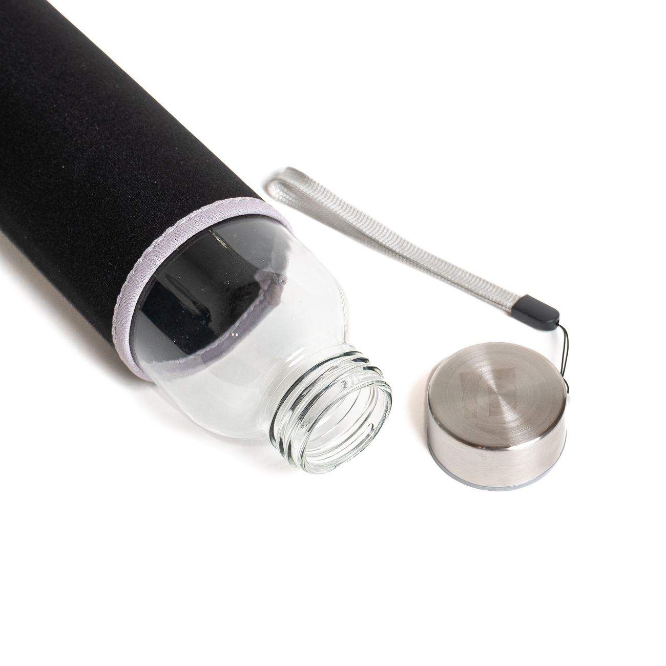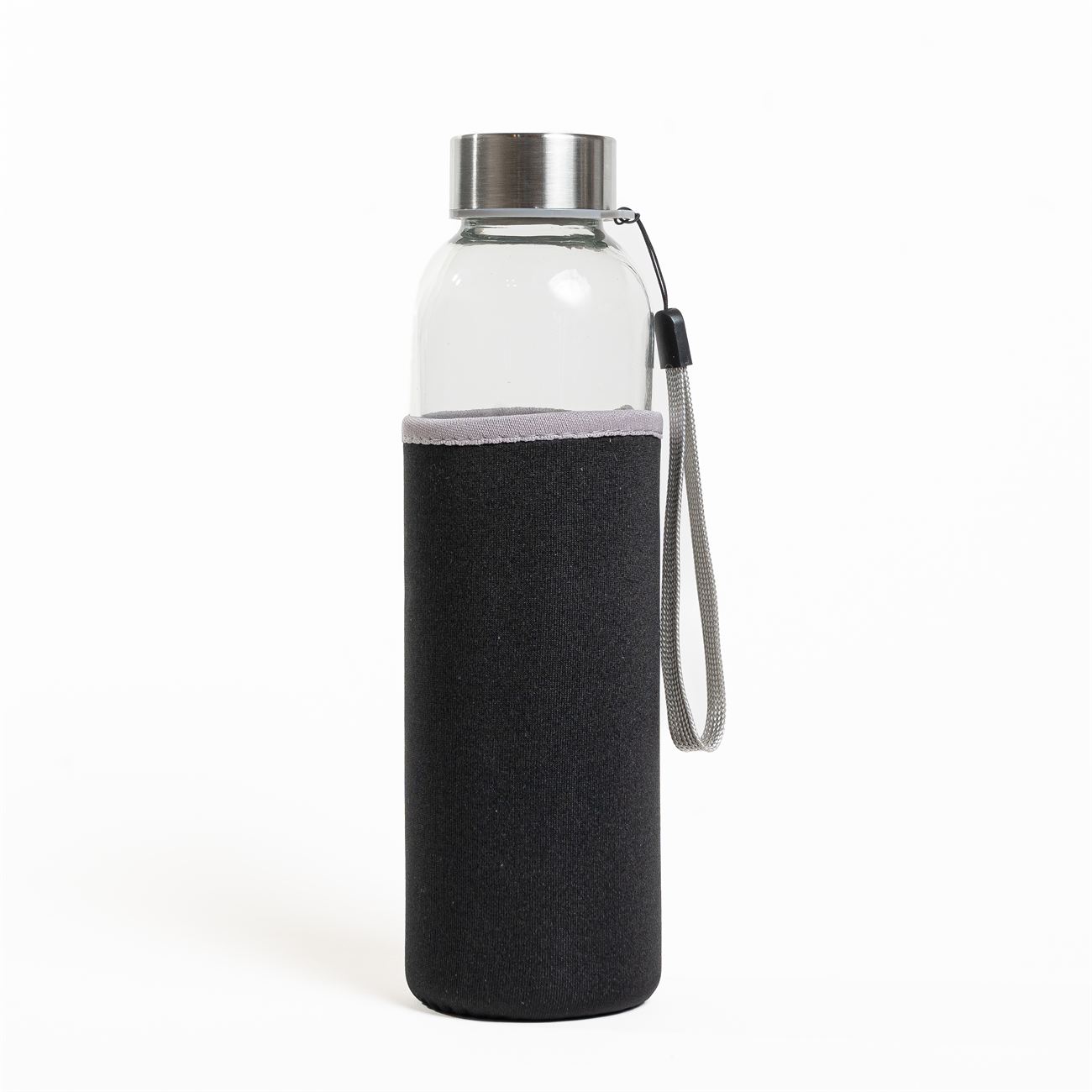 Botella de vidrio con funda de neopreno. Con tapón de seguridad de rosca de acero inoxidable y correa de transporte en la parte superior.