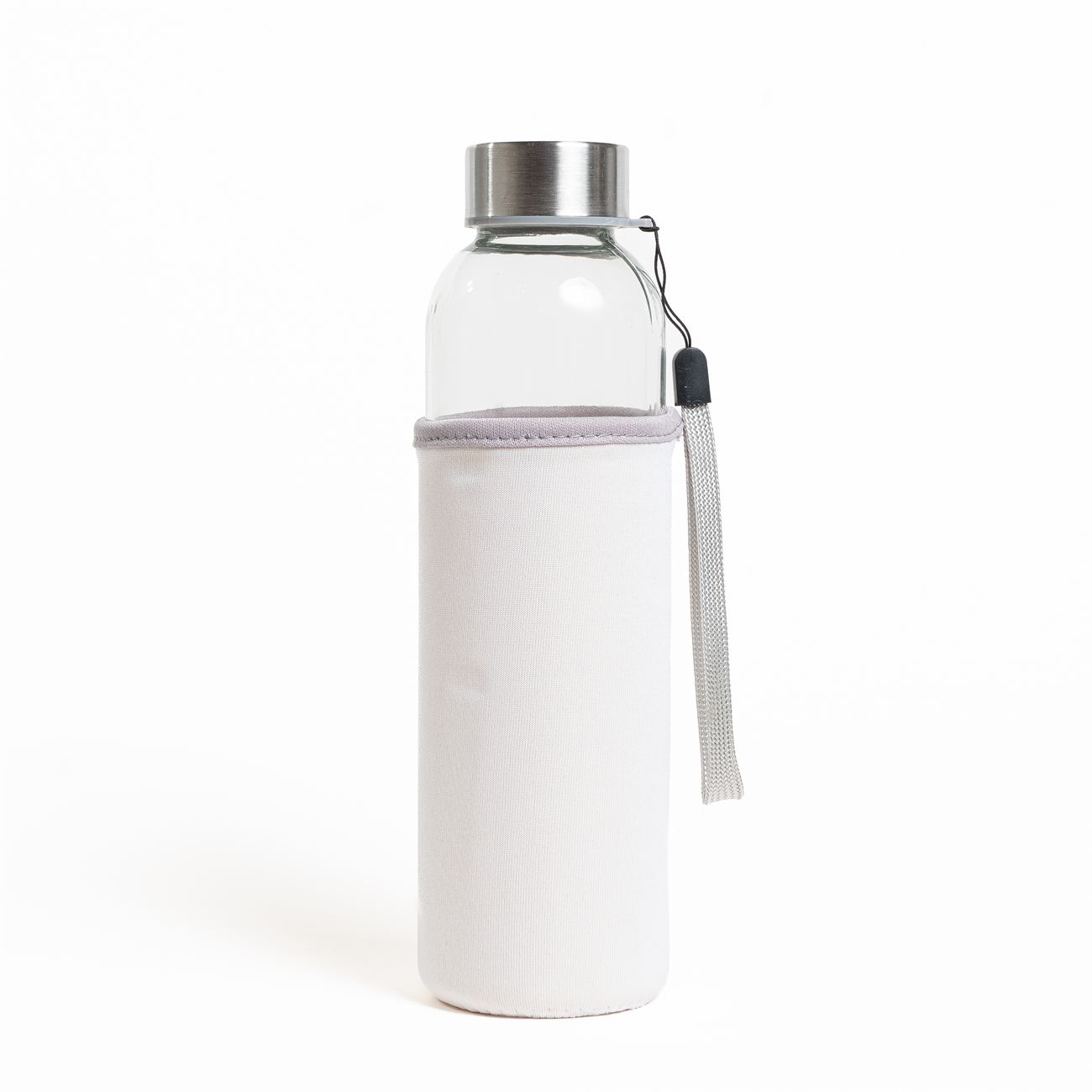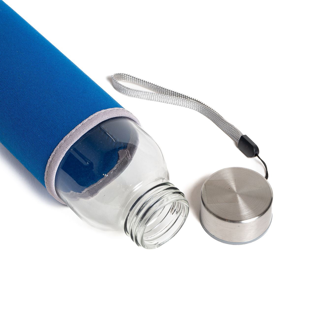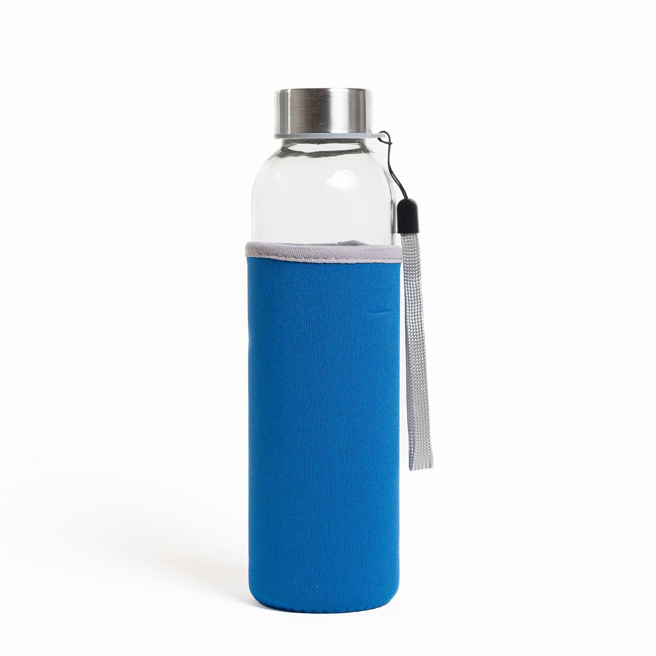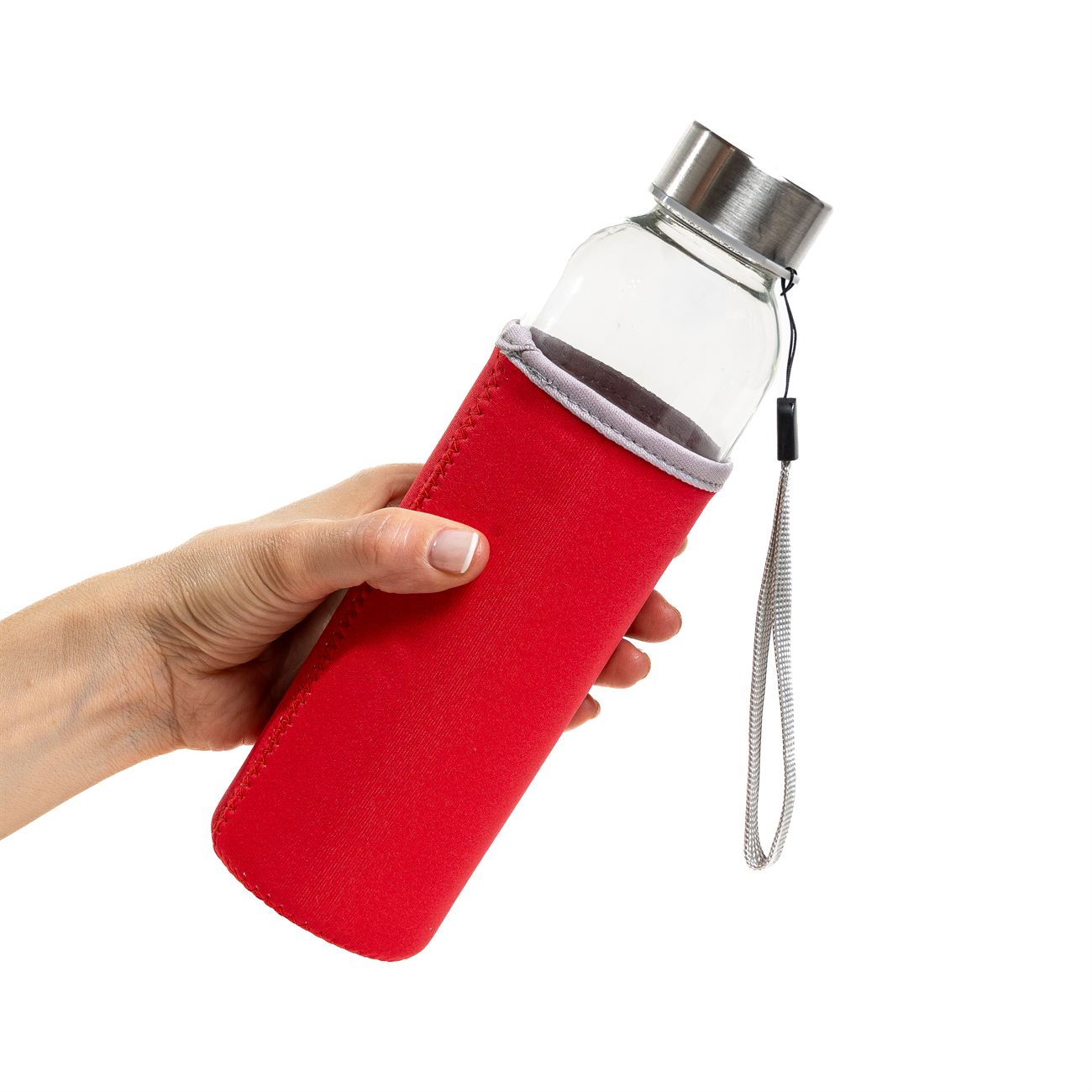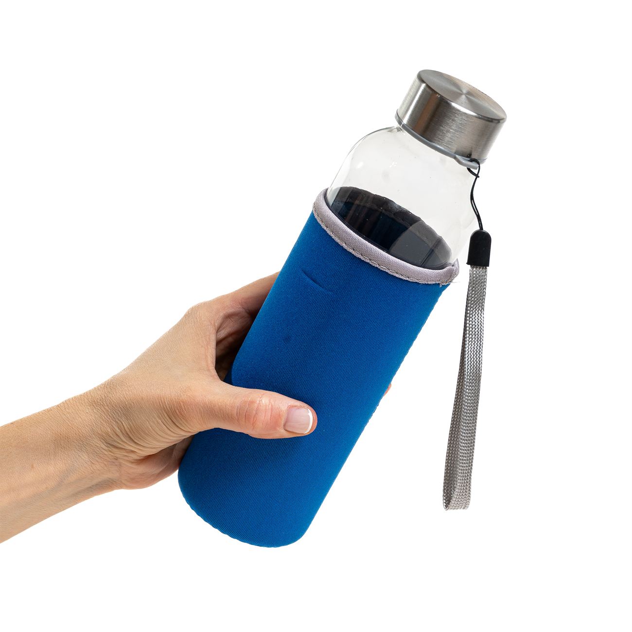 Botella de vidrio con funda de neopreno. Con tapón de seguridad de rosca de acero inoxidable y correa de transporte en la parte superior.