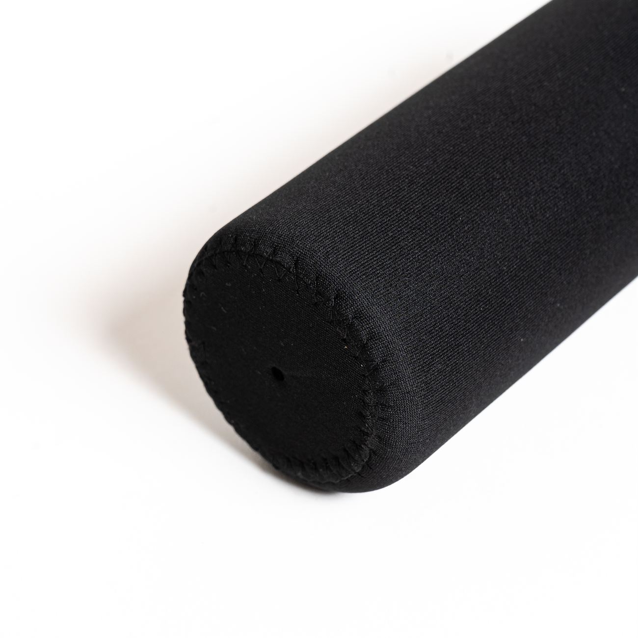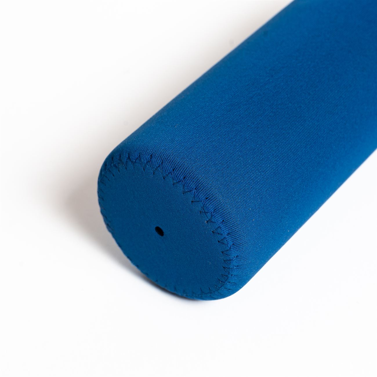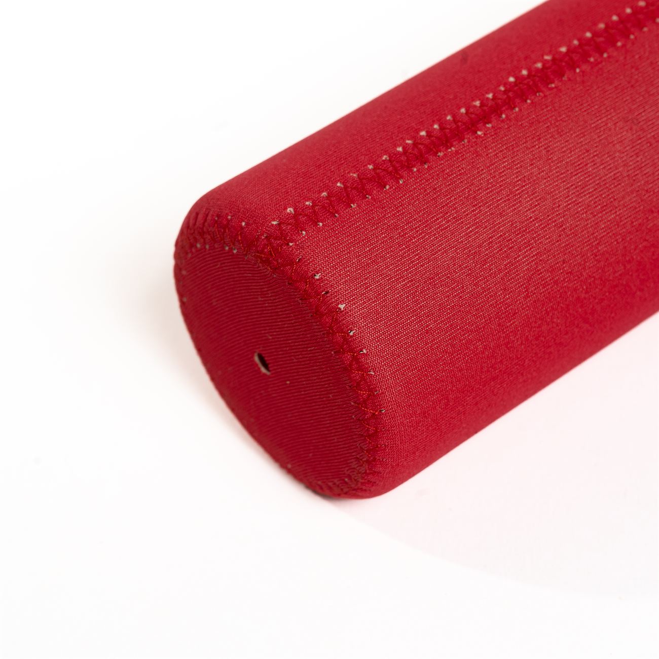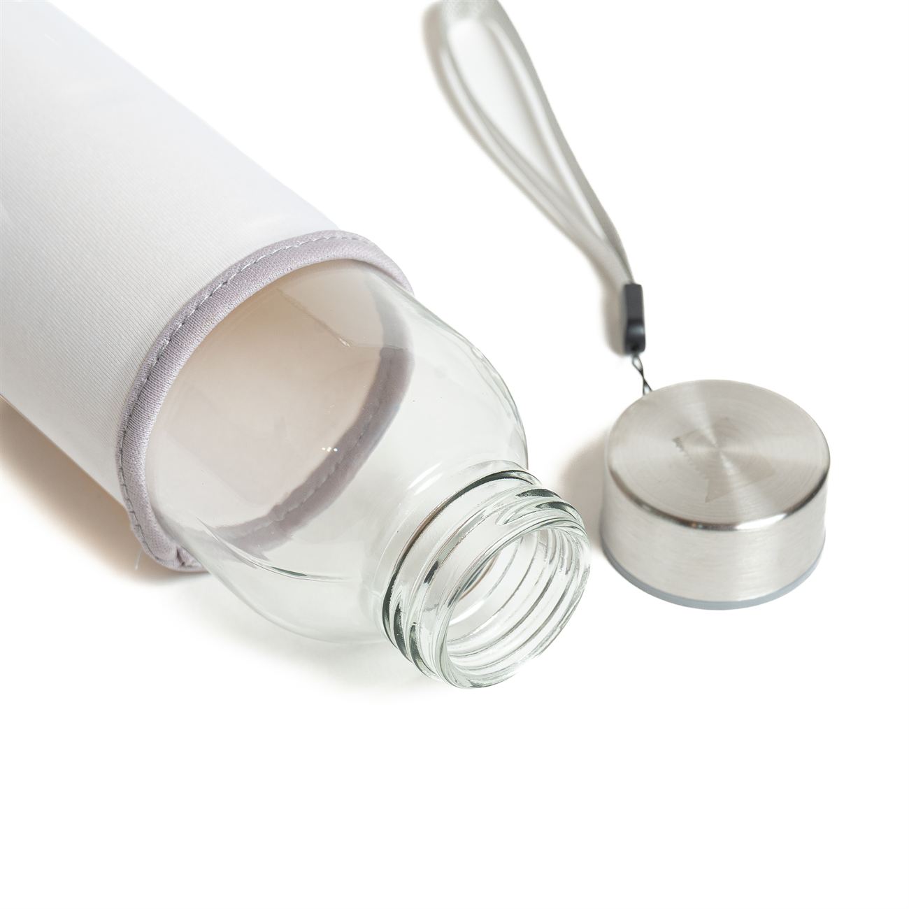 Botella de vidrio con funda de neopreno. Con tapón de seguridad de rosca de acero inoxidable y correa de transporte en la parte superior.