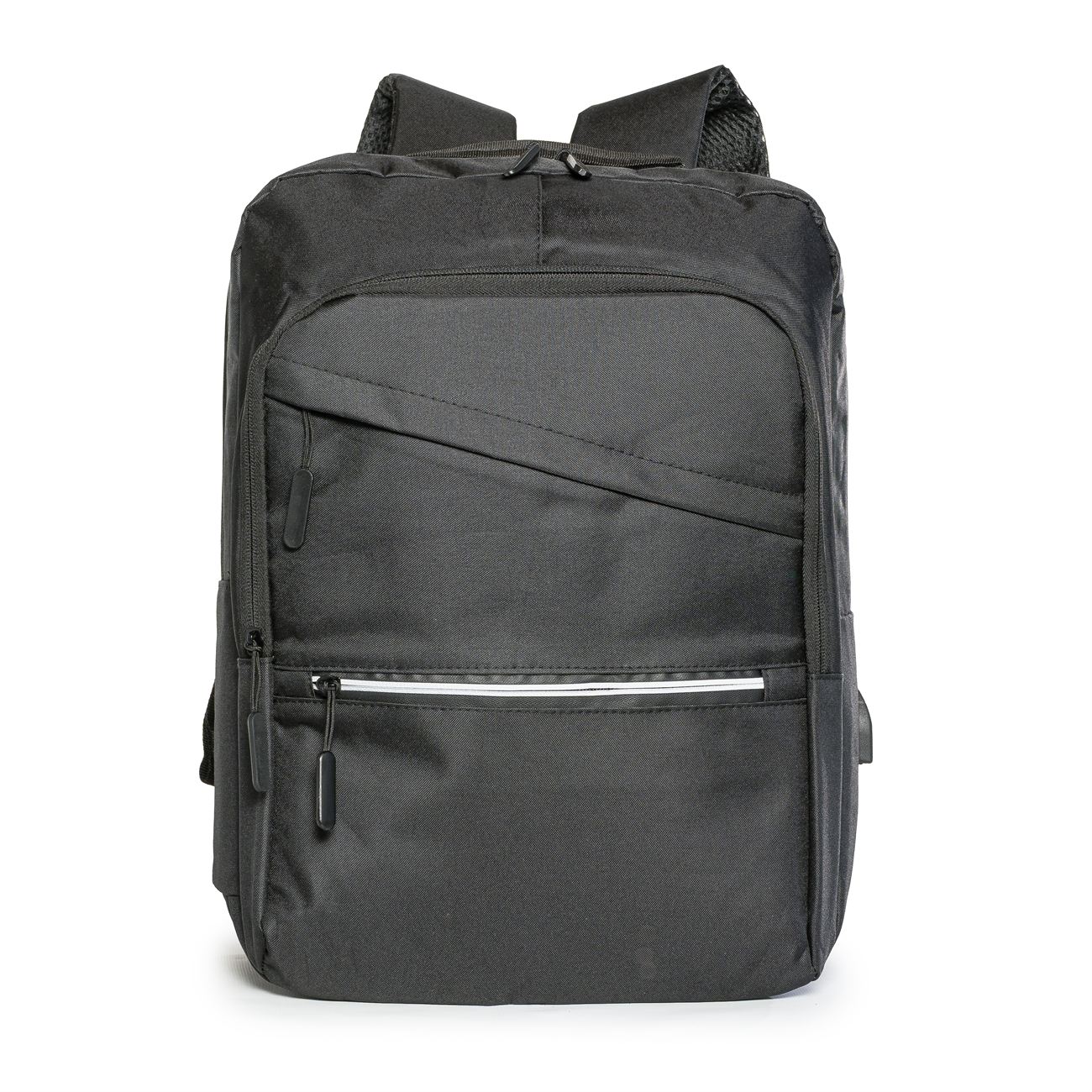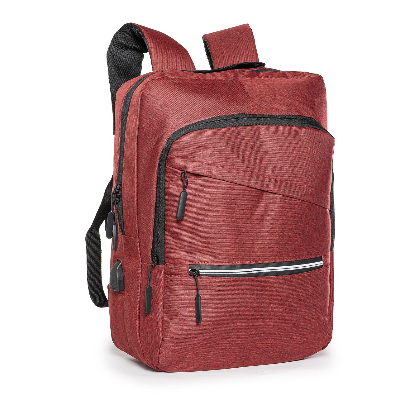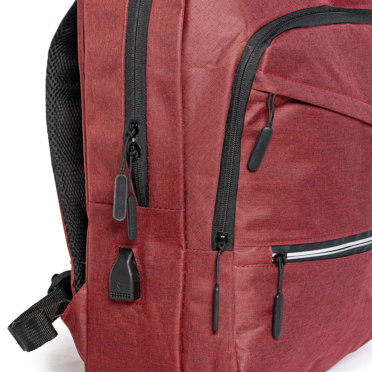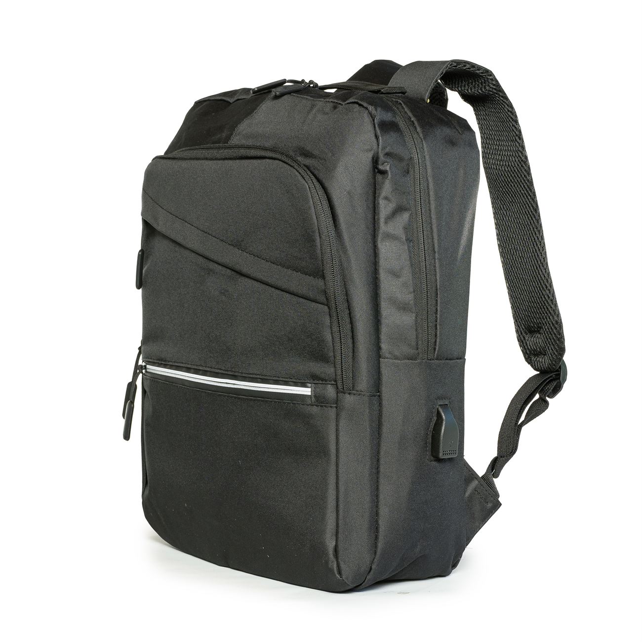 DESCRIPCIÓN: Mochila porta notebook. Presenta dos bolsillos en el frente con cierre, uno con detalle reflectivo. Un compartimiento con cierre más aplio y un compartimiento principal con cierre doble que contiene sobre el sector de la espalda el bolsillo porta notebook con sujetador con velcro con capacidad para introducir una notebook de hasta 17′. Salida externa USB con cable para conexión interna. Bolsillo en un lateral. Manija de sujeción superior. Correas acolchadas ajustables.