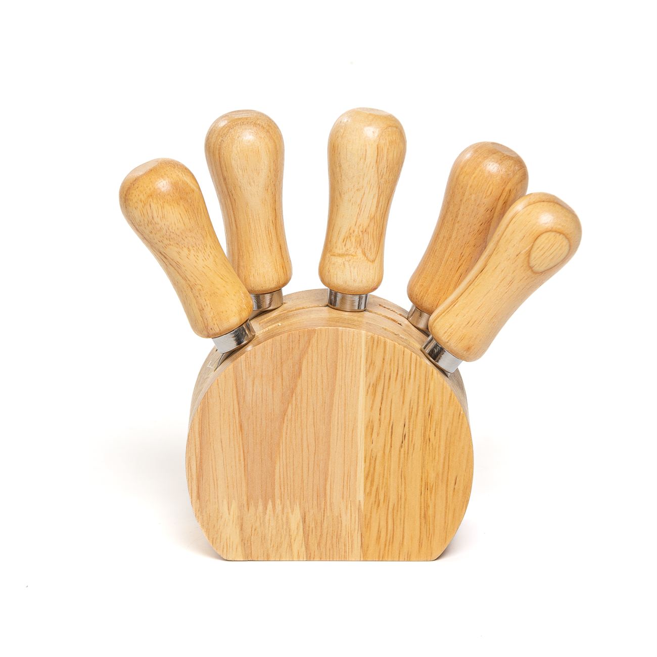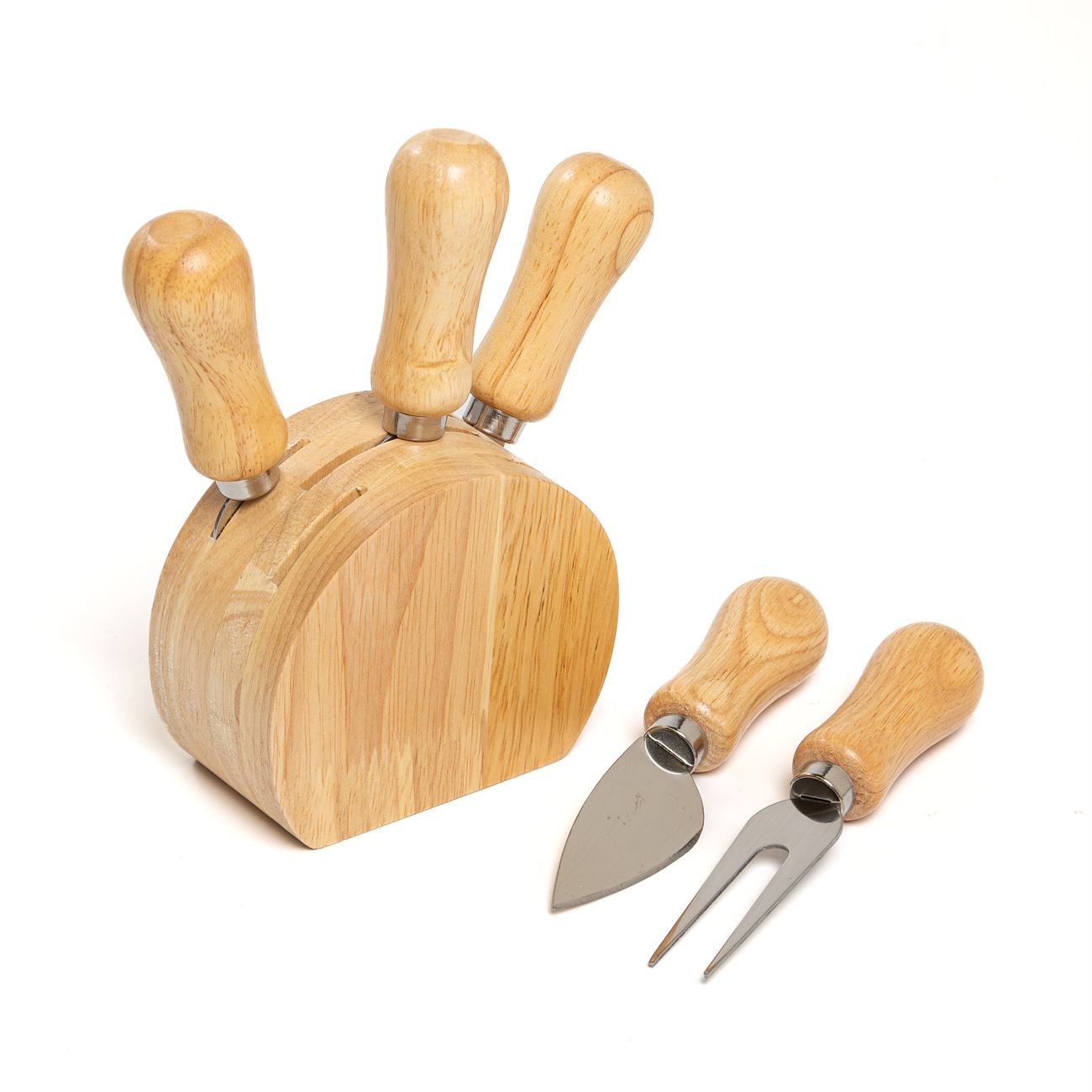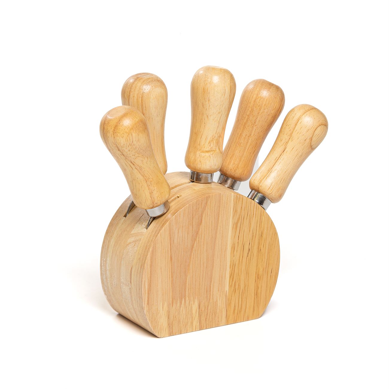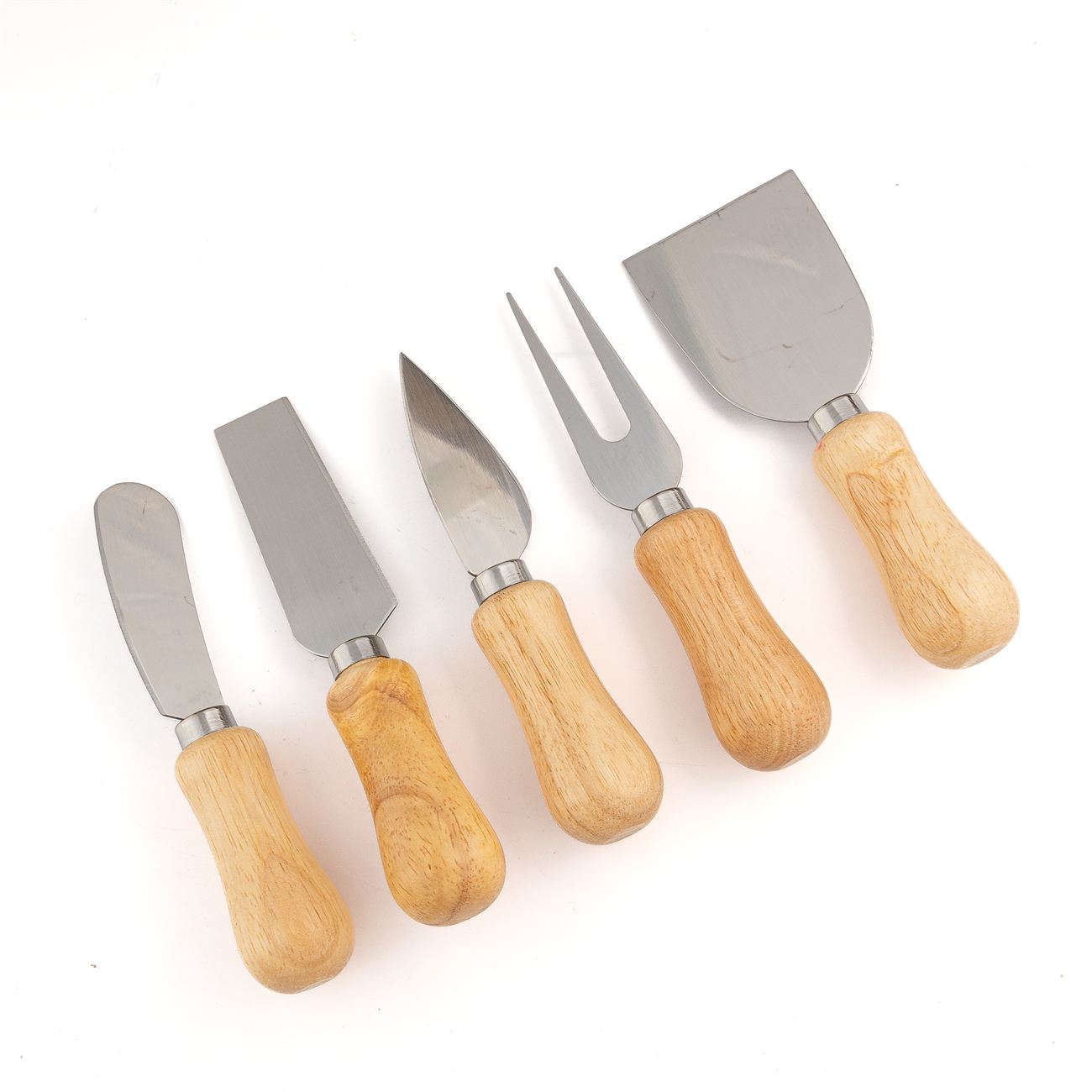 Juego para quesos de 6 piezas. Con hoja de acero inoxidable y mango de madera. Cinco piezas de corte y base. Caja contenedora de cartón marrón.
