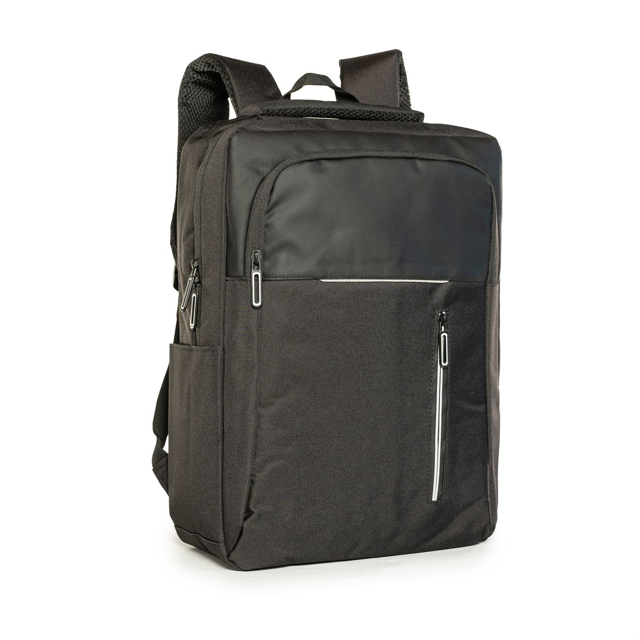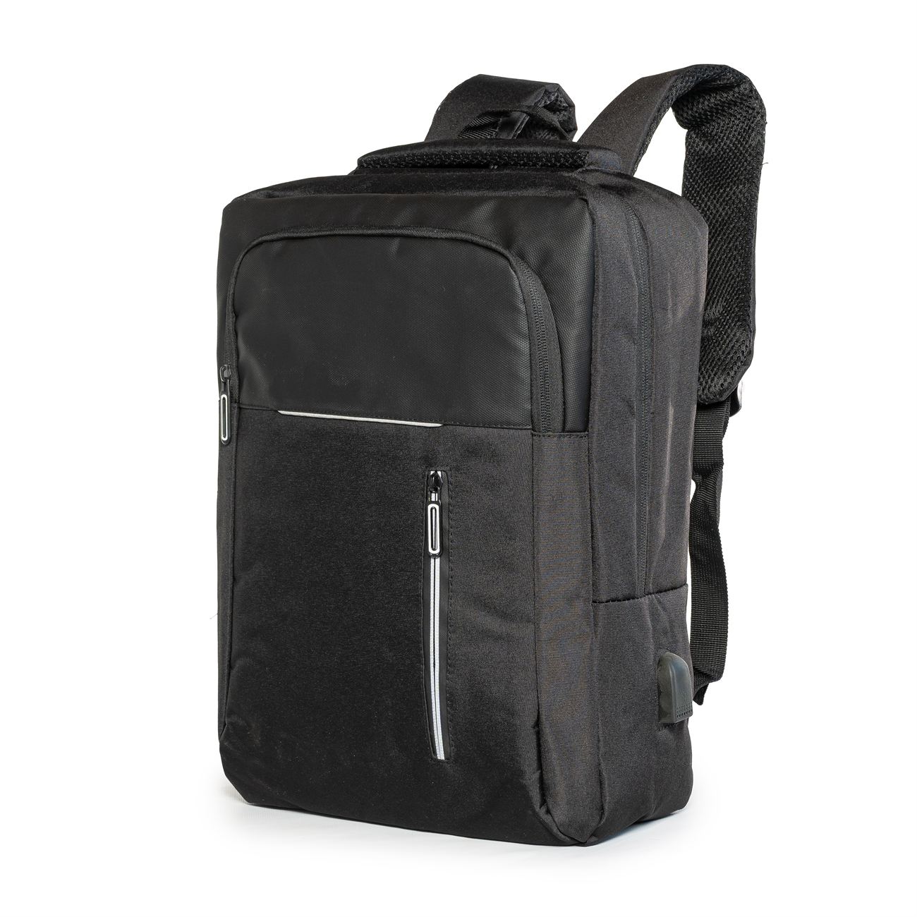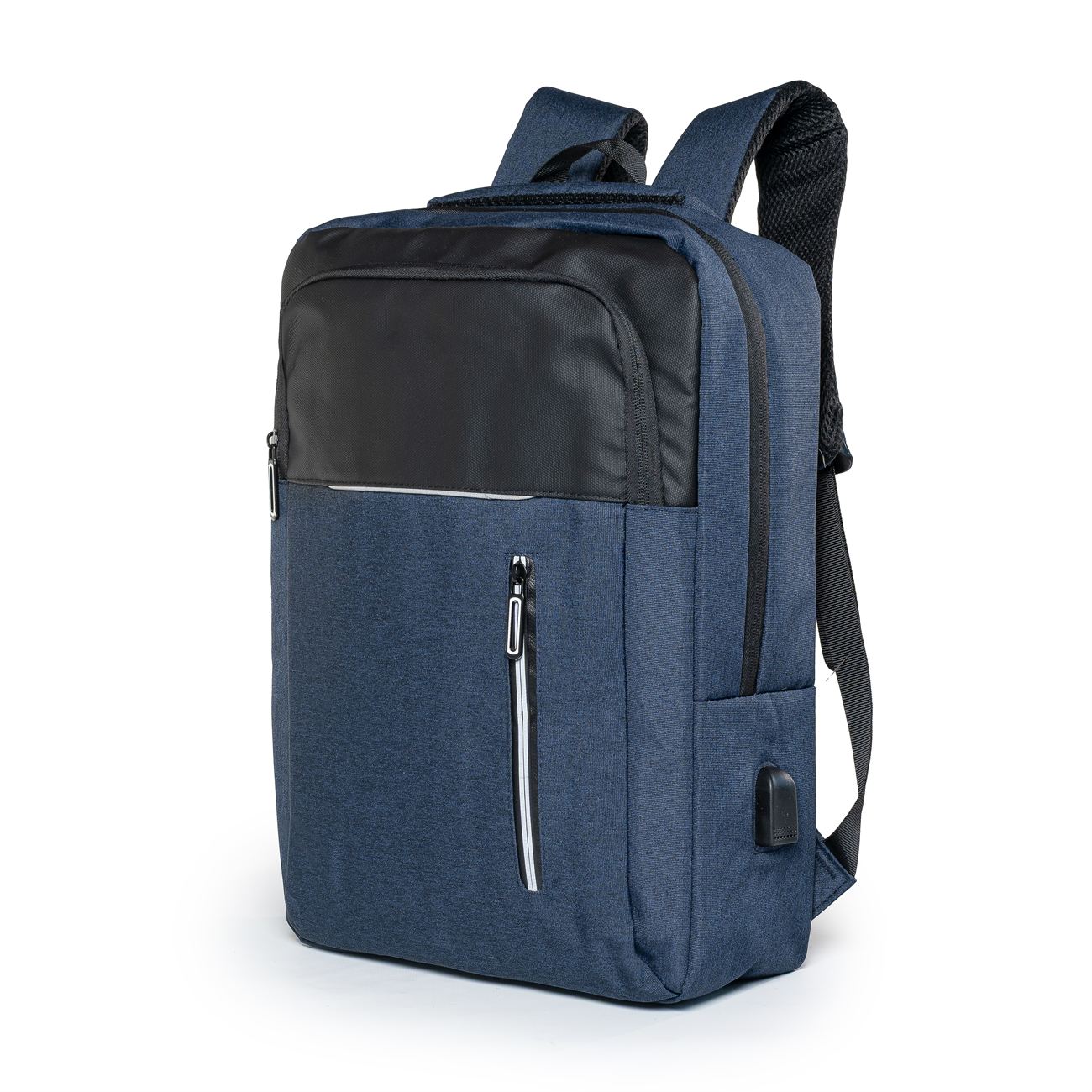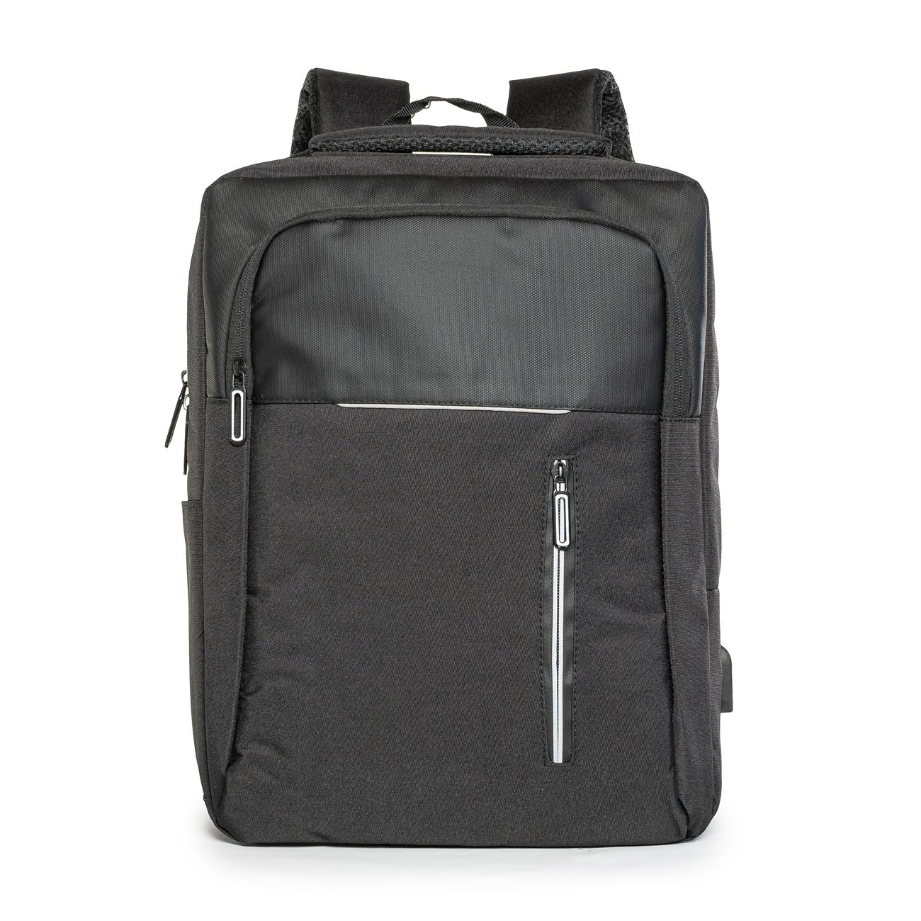 DESCRIPCIÓN: Mochila porta notebook. Presenta un bolsillo vertical en el frente con cierre. Franja superior en color negro. Un compartimiento frontal con un cierre. Compartimiento principal con cierre que contiene sobre el sector de la espalda el bolsillo porta notebook con sujetador con velcro con capacidad para introducir una notebook de hasta 16,5′. Hacia el frente trae dos bolsillos porta objetos. Interior forrado y acolchado. Respaldar reforzado con cinta para carry on. Salida externa USB con cable para conexión interna. Bolsillo en un lateral. Manija de sujeción superior reforzada y gancho para colgar. Correas acolchadas ajustables.