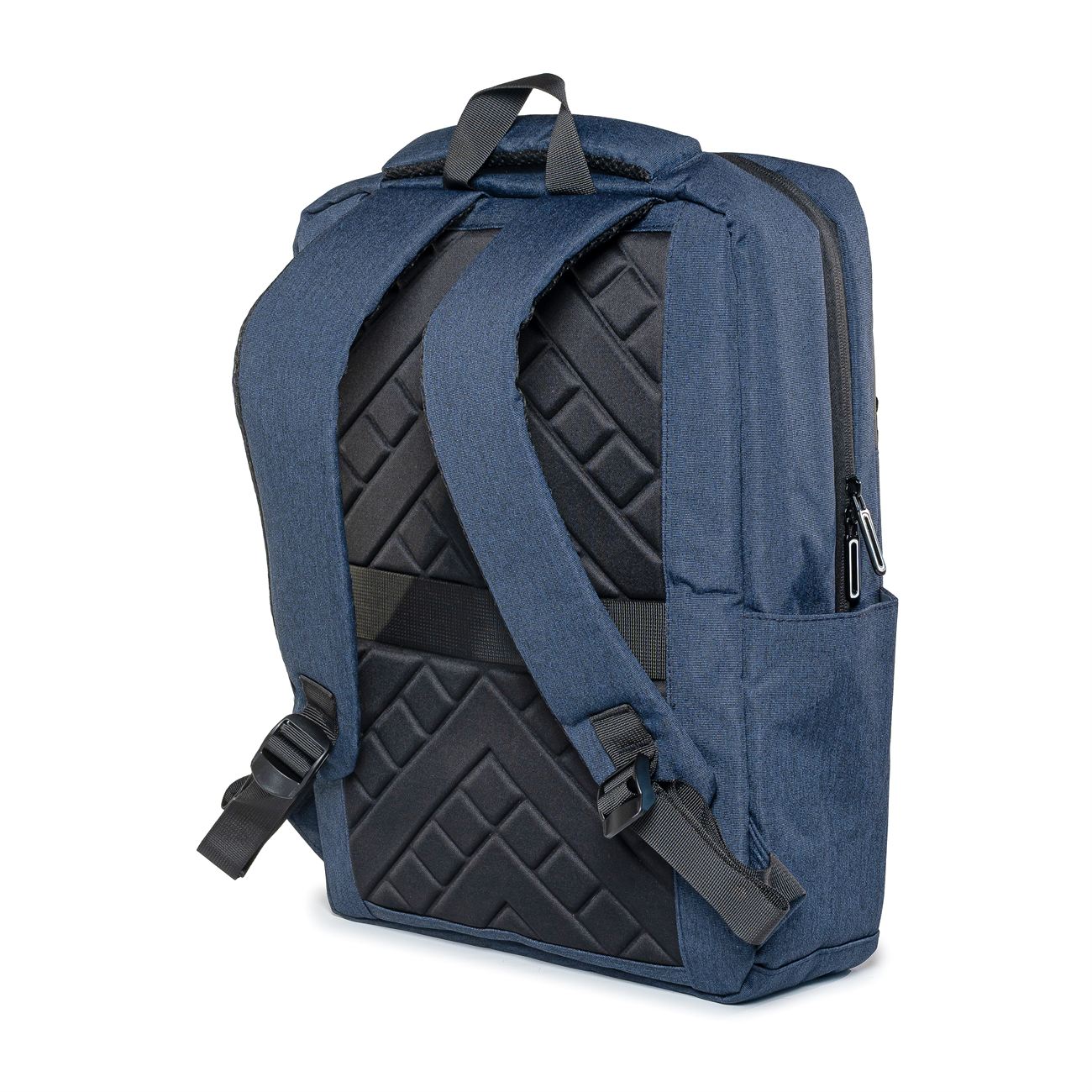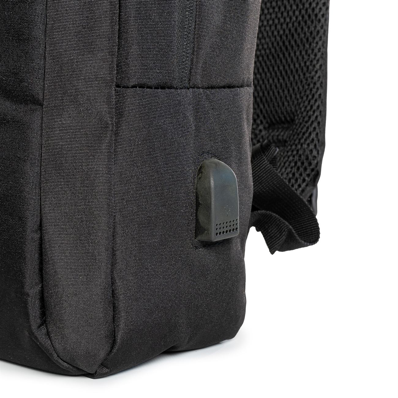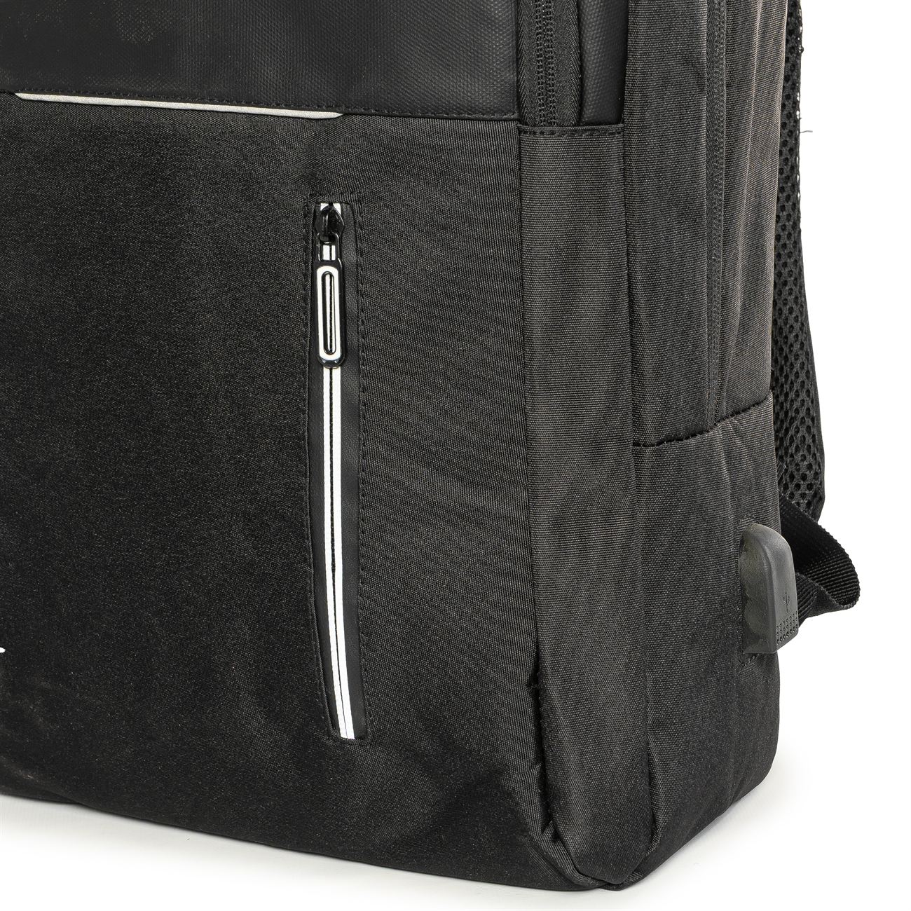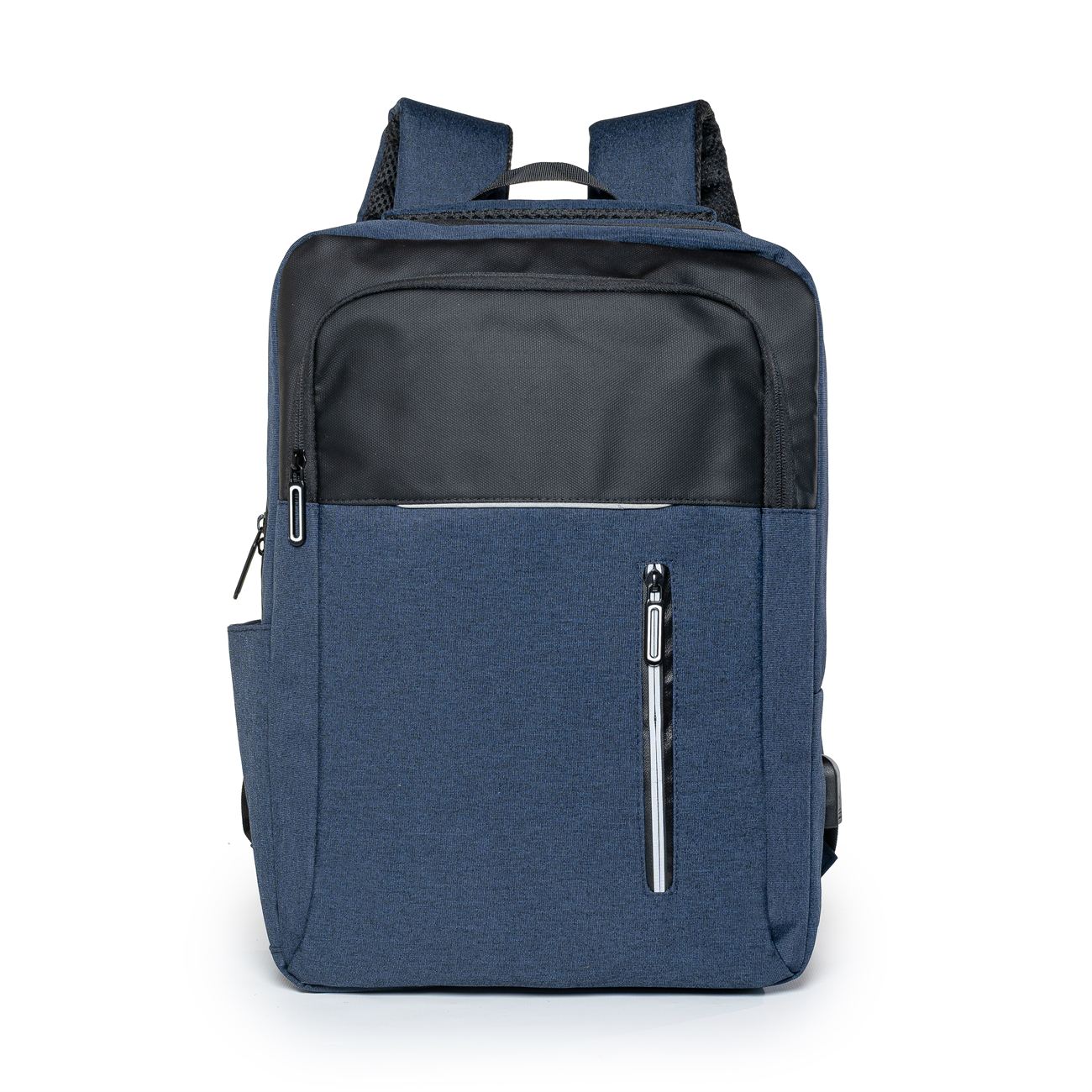 DESCRIPCIÓN: Mochila porta notebook. Presenta un bolsillo vertical en el frente con cierre. Franja superior en color negro. Un compartimiento frontal con un cierre. Compartimiento principal con cierre que contiene sobre el sector de la espalda el bolsillo porta notebook con sujetador con velcro con capacidad para introducir una notebook de hasta 16,5′. Hacia el frente trae dos bolsillos porta objetos. Interior forrado y acolchado. Respaldar reforzado con cinta para carry on. Salida externa USB con cable para conexión interna. Bolsillo en un lateral. Manija de sujeción superior reforzada y gancho para colgar. Correas acolchadas ajustables.