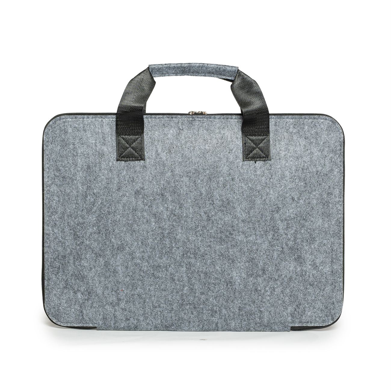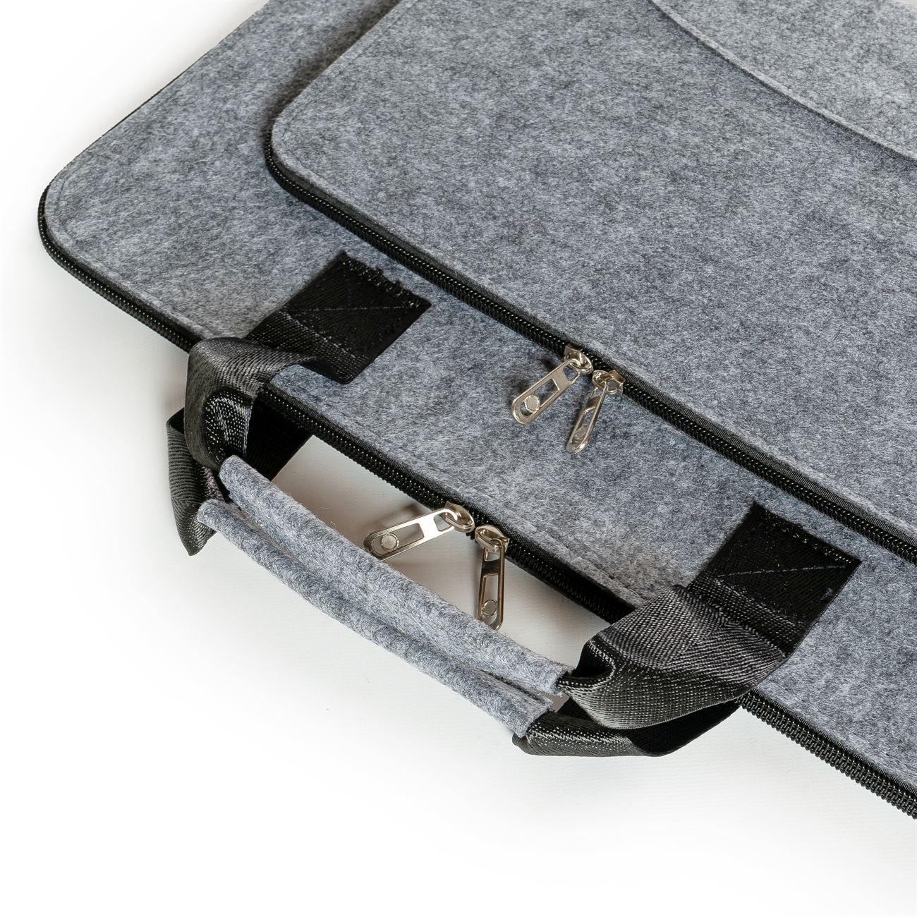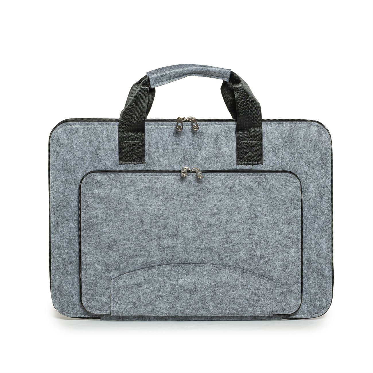Fabricado con fieltro ecológico. Al frente posee un bolsillo con cierre doble de 31cm de ancho por 20 cm de alto. El maletin tiene 40 cm de ancho por 28 cm de alto con cierre doble. Capacidad para notebook de 17′. Manijas de cordura reforzadas con fieltro.