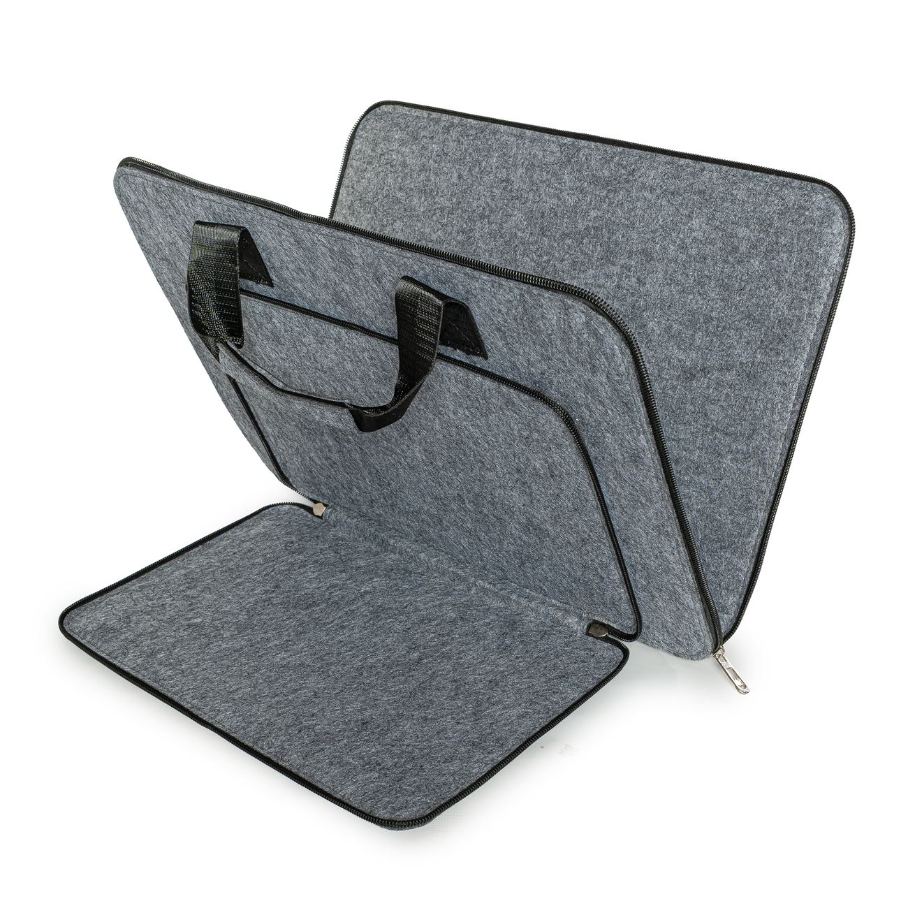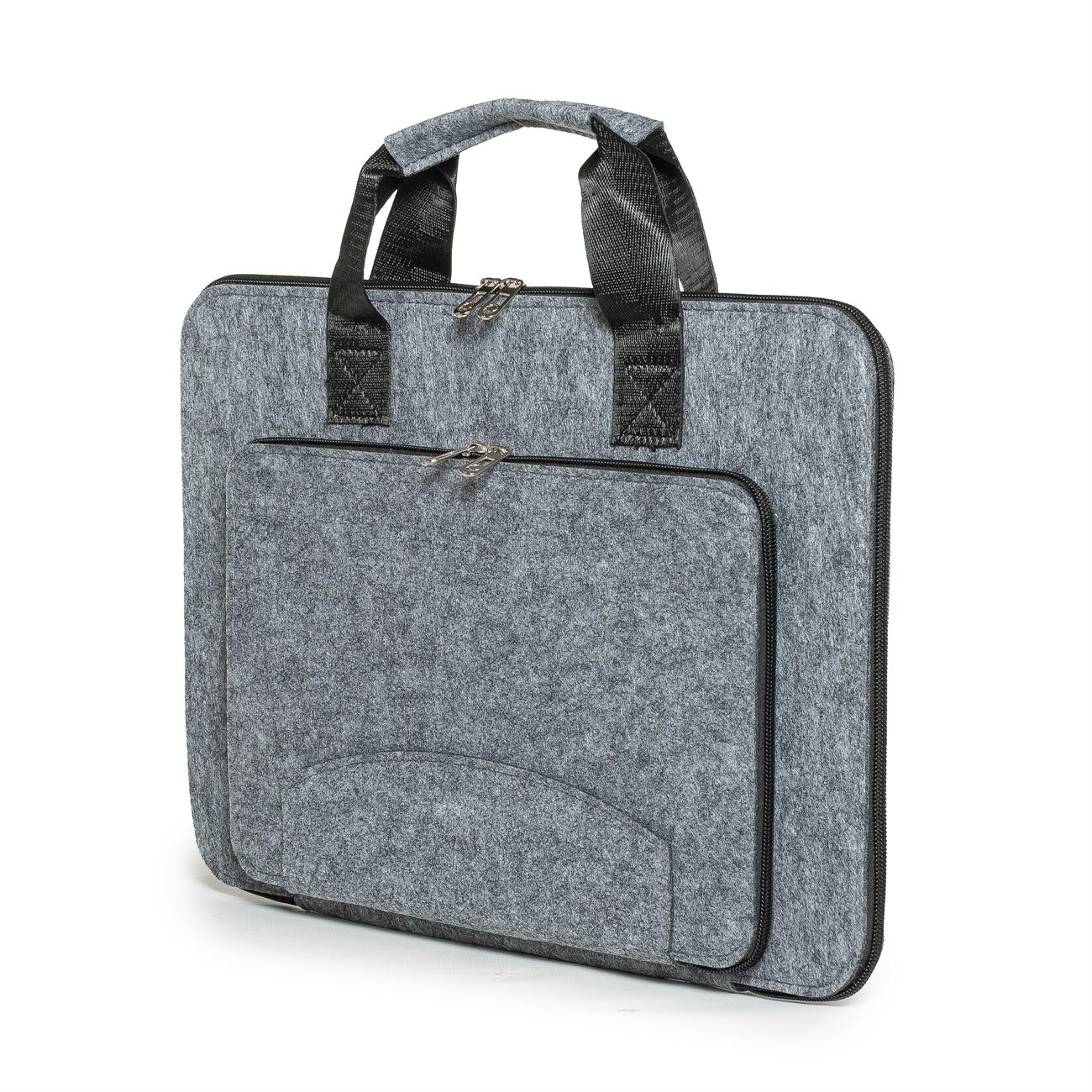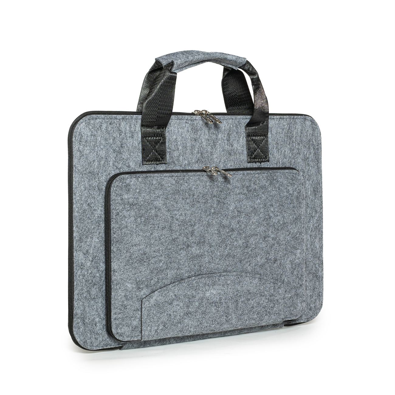 Fabricado con fieltro ecológico. Al frente posee un bolsillo con cierre doble de 31cm de ancho por 20 cm de alto. El maletin tiene 40 cm de ancho por 28 cm de alto con cierre doble. Capacidad para notebook de 17′. Manijas de cordura reforzadas con fieltro.
