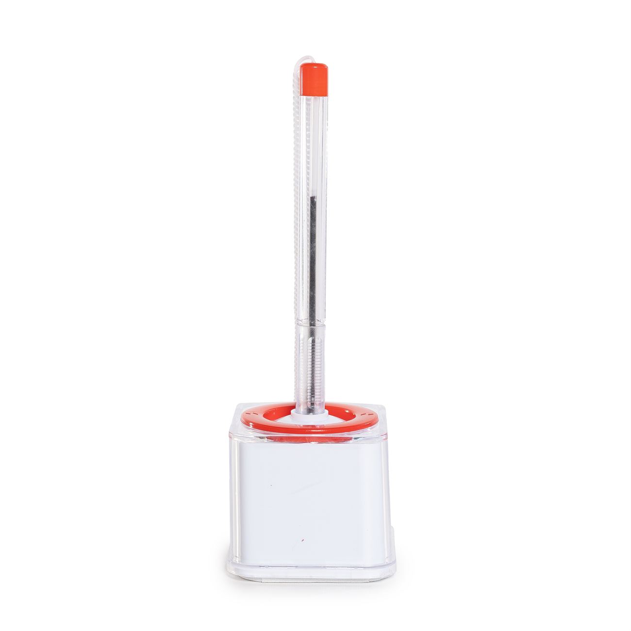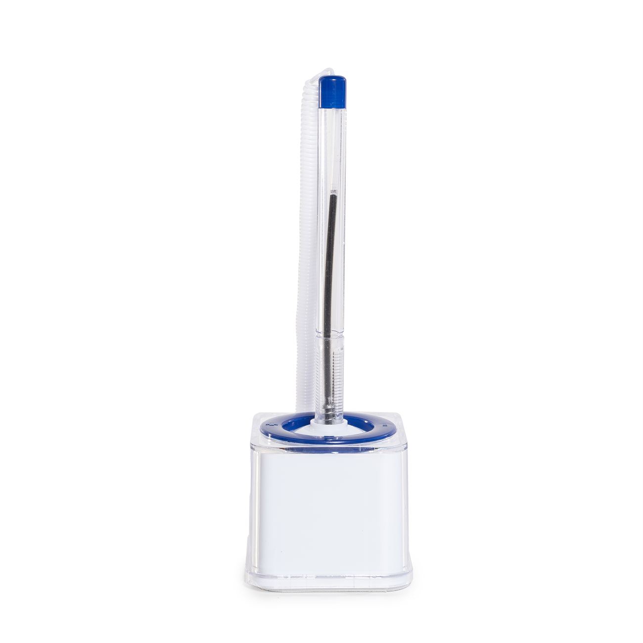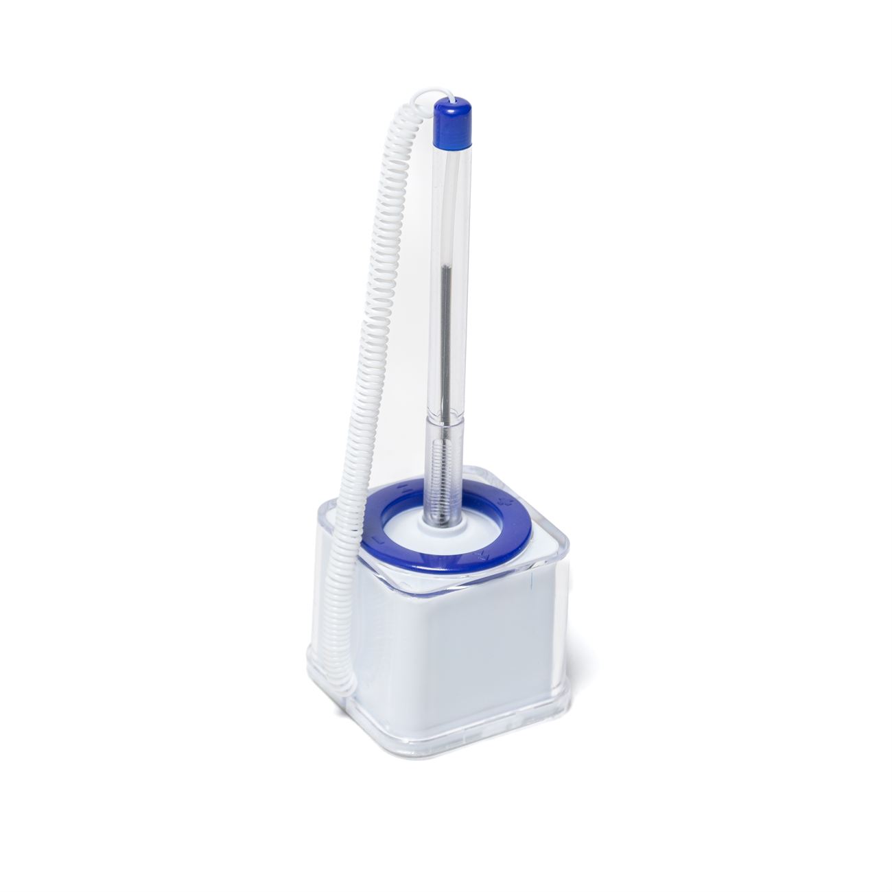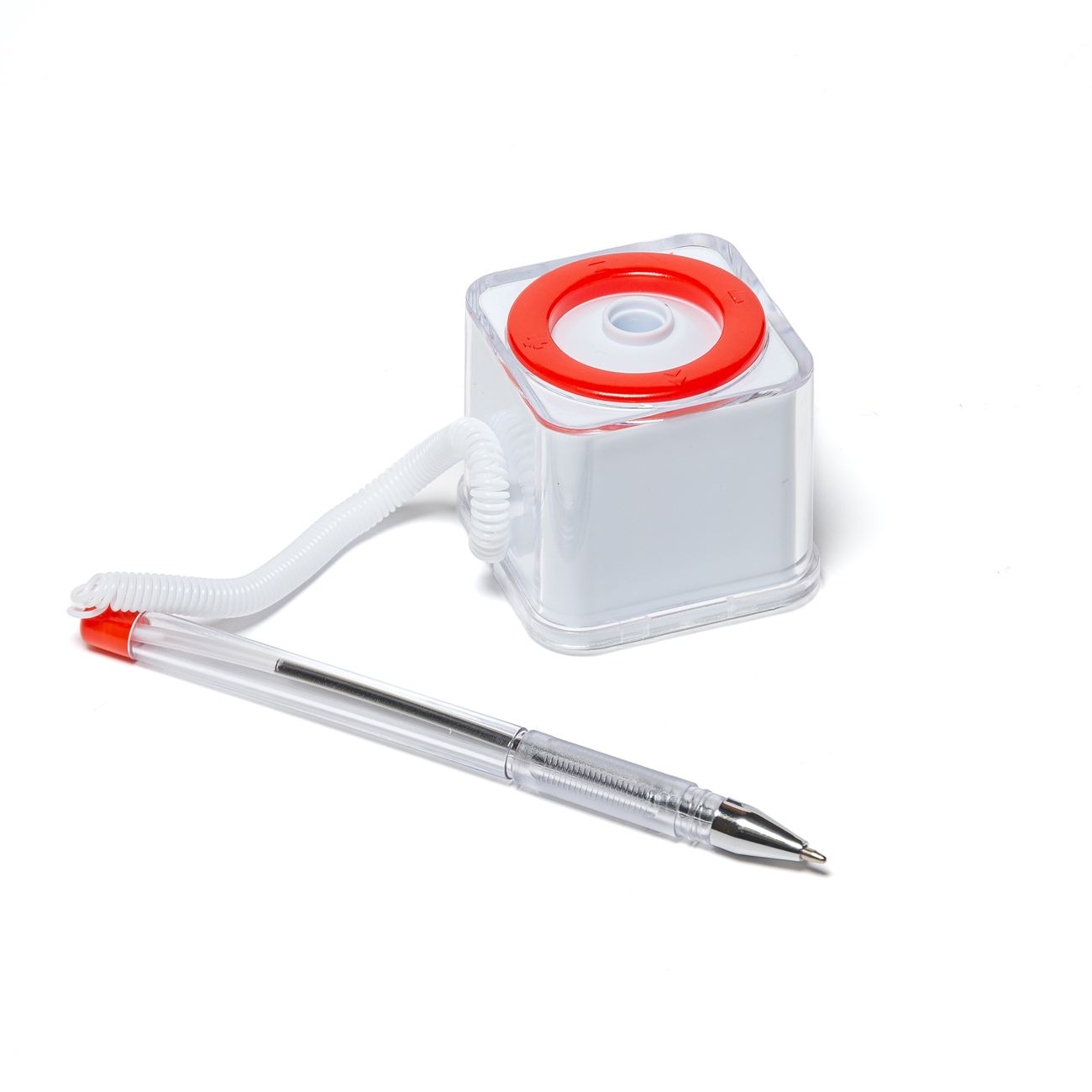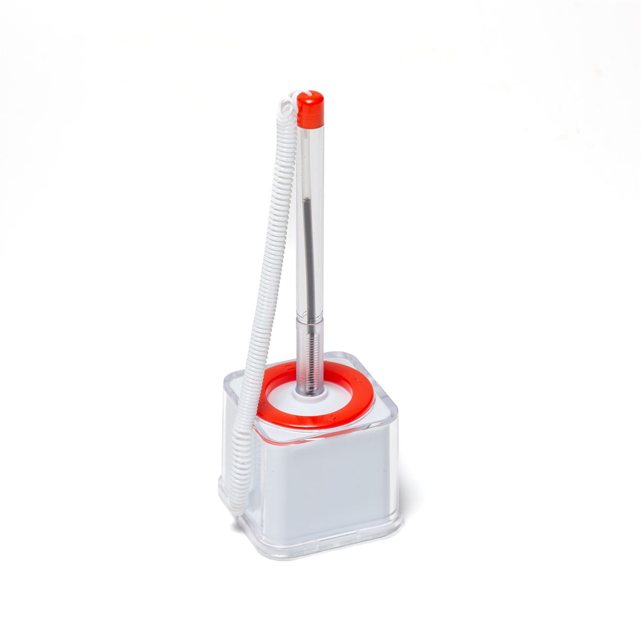 Bolígrafo con base y cable de sujeción Descripción: Bolígrafo con base con detalles de color y cable espiralado de sujeción. Base con adhesivo. Tinta negra. Material: Plástico. Medidas: Base 5×5 cm.