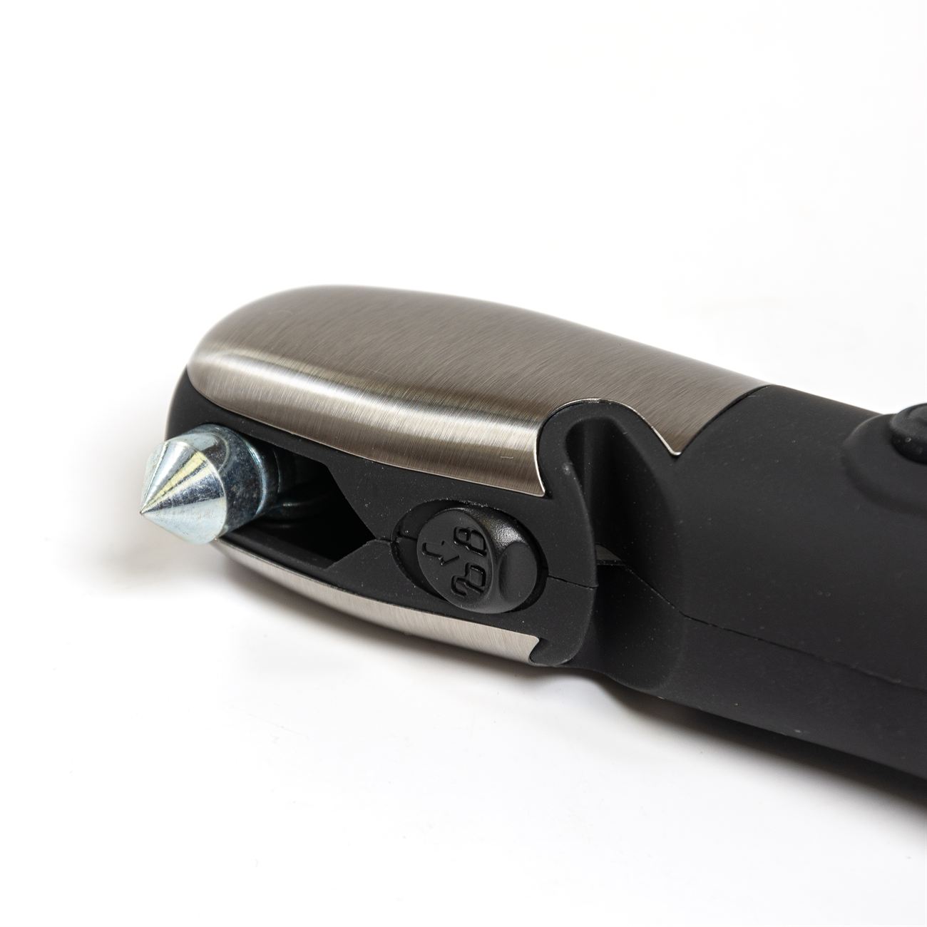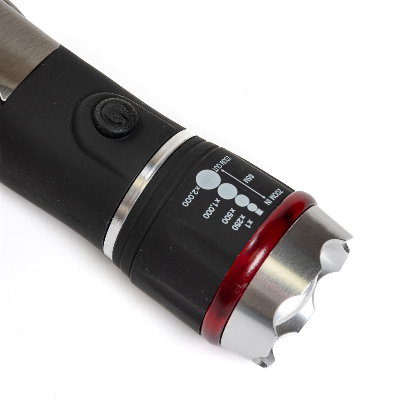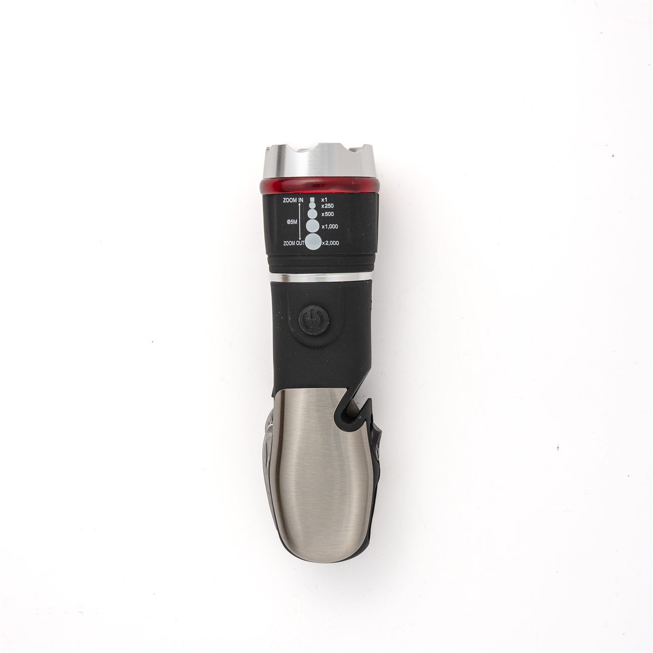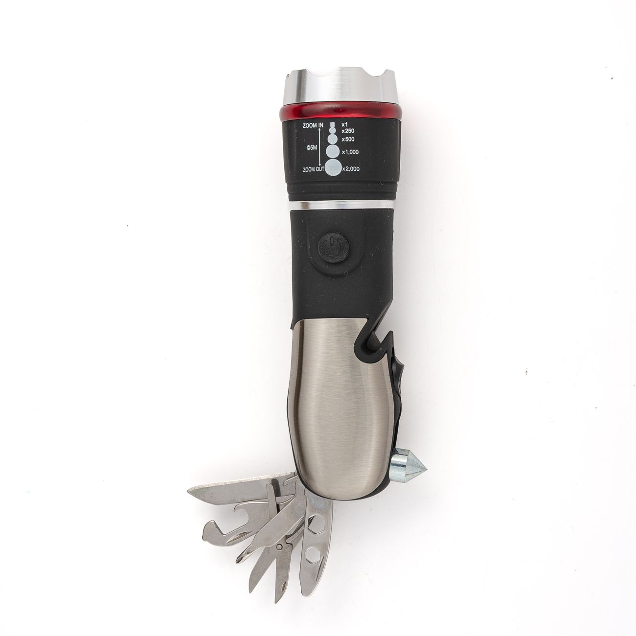 Descripción: Linterna metálica multifunción, con potente led y zoom para regular la apertura de haz de luz, opción baliza, en un lateral posee una punta rompe cristales retráctil y una cavidad con un filo inserto para cortes. En el lado opuesto, cinco herramientas, cuchillo, destapador, tijera, destornillador común y estriado. Las cachas son de acero espillado. Requiere tres pilas AAA (No incluidas). Caja contenedora de cartón blanco.