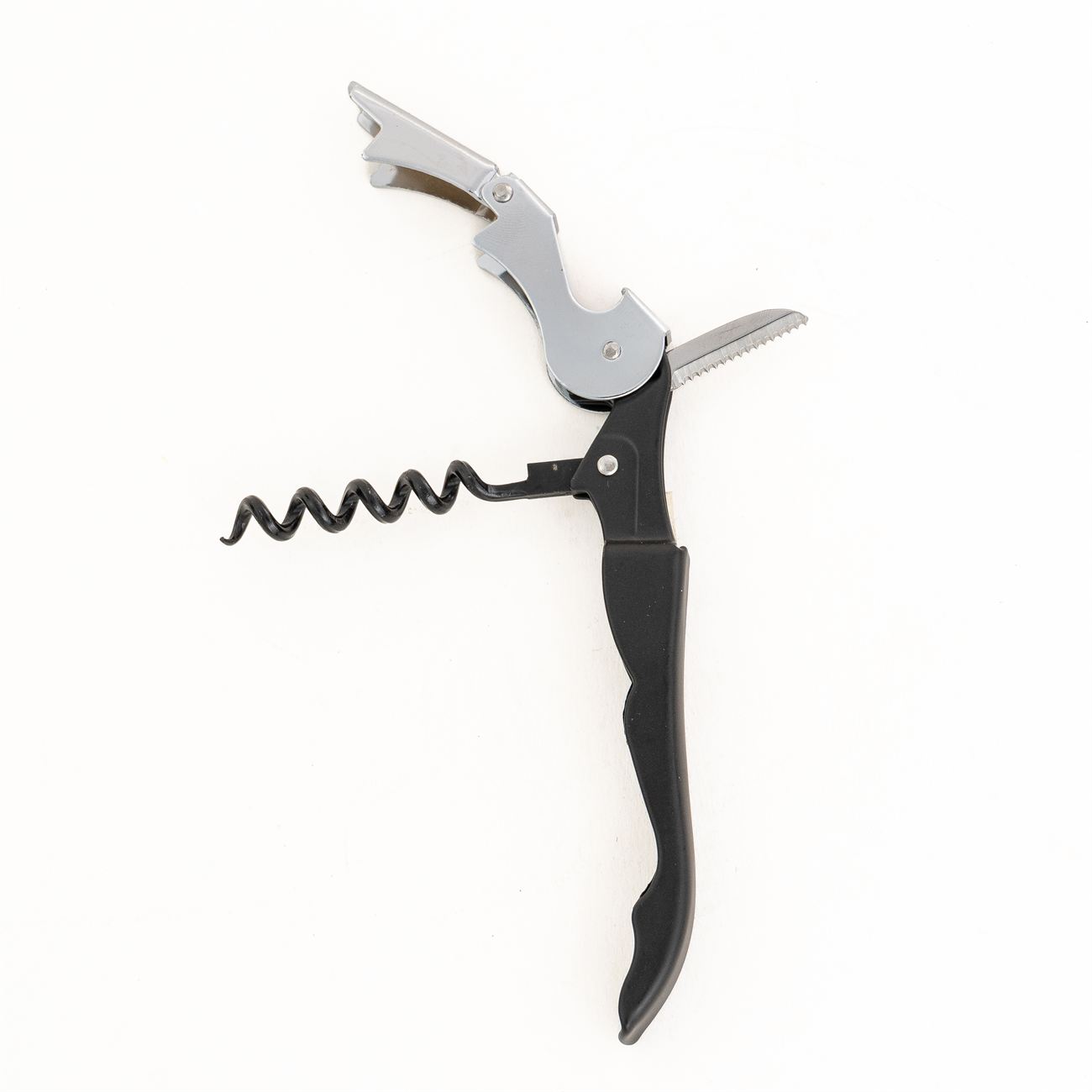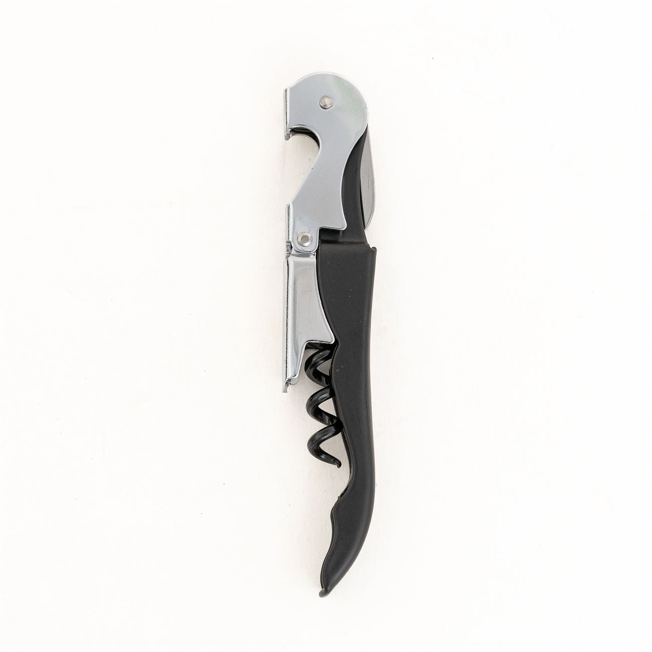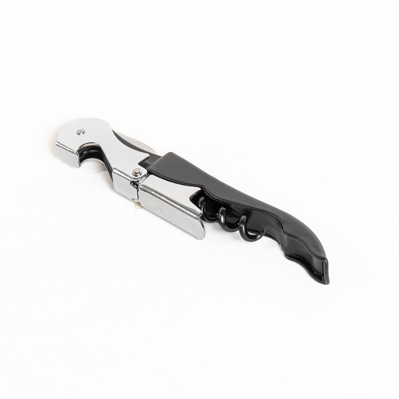 Sacacorchos de dos tiempos Descripción: Sacacorchos de dos tiempos o doble impulso, cuña para destapar botella y cuchilla corta cápsula. Caja contenedora de cartón gris. Materiales: acero. Medidas: 12x1cm