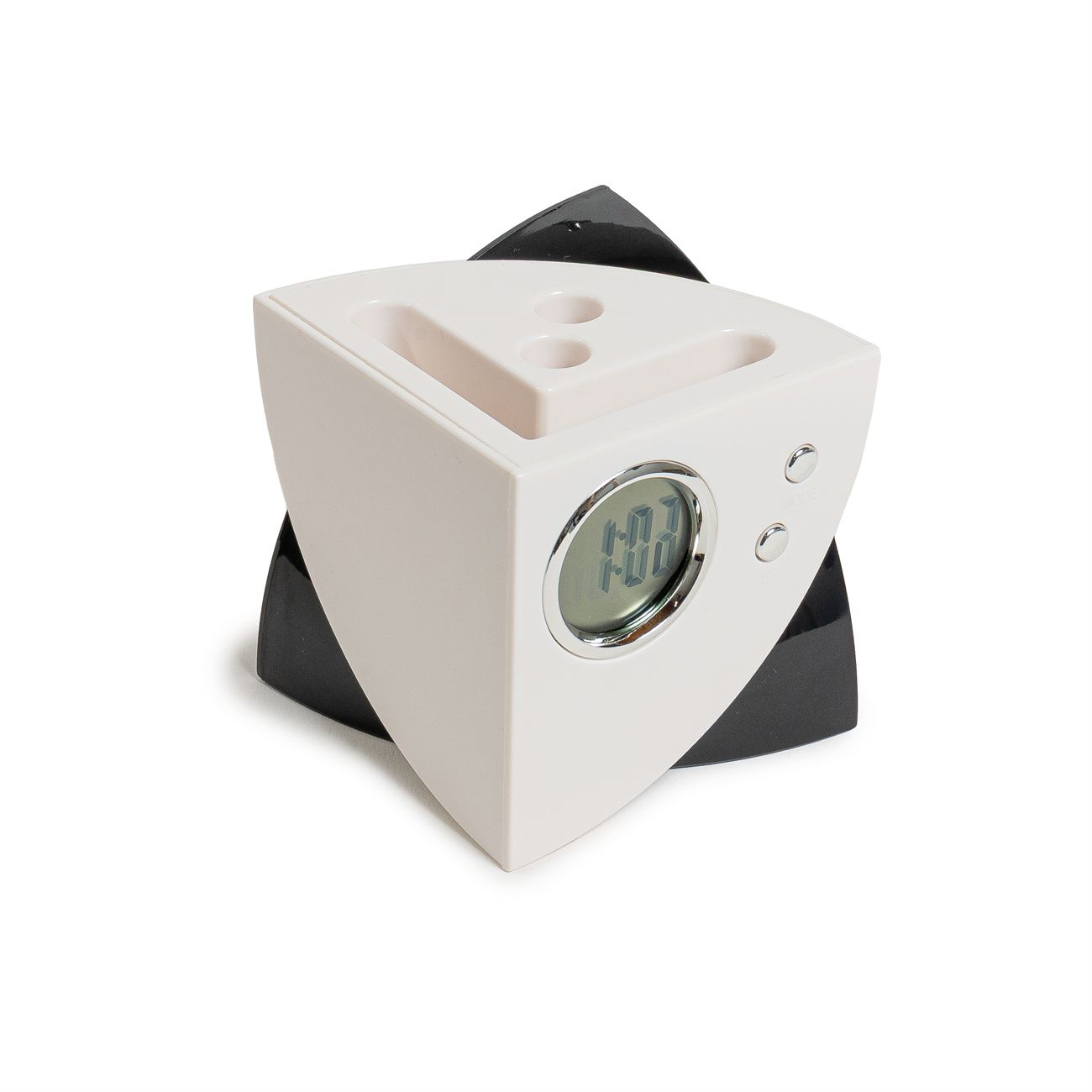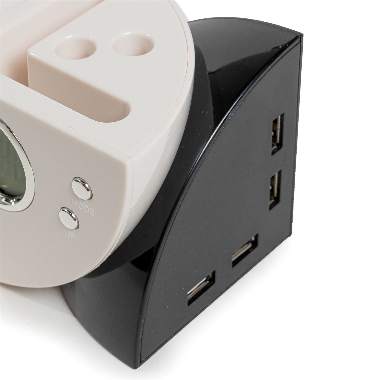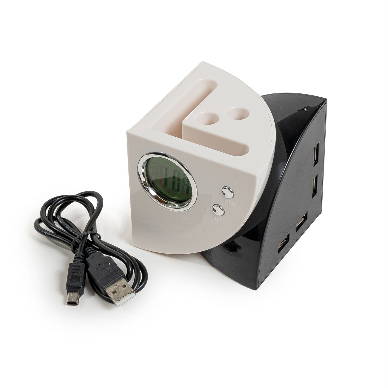 Portalápiz Multipuerto Descripción: Reloj, posee 4 puertos USB 2.0, reloj, calendario y alarma, incluye pila tipo botón y cable USB. Caja contenedora de cartón blanco. Dimensiones: 8cm x 8 cm. Material: Plástico.