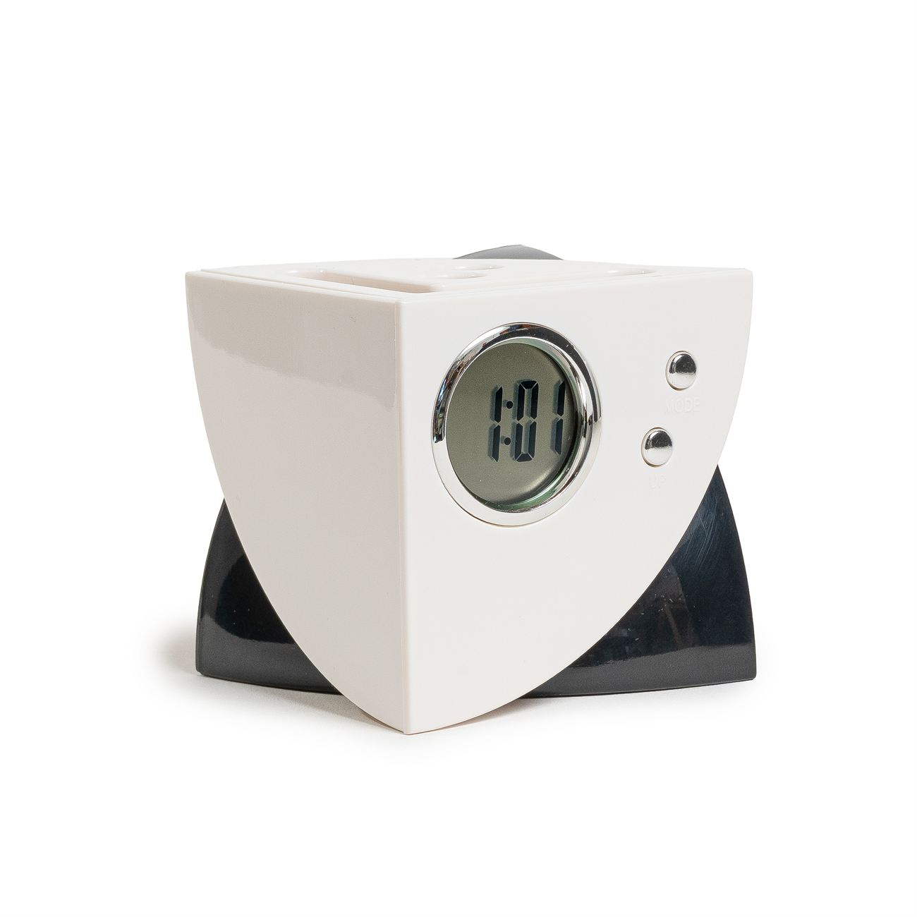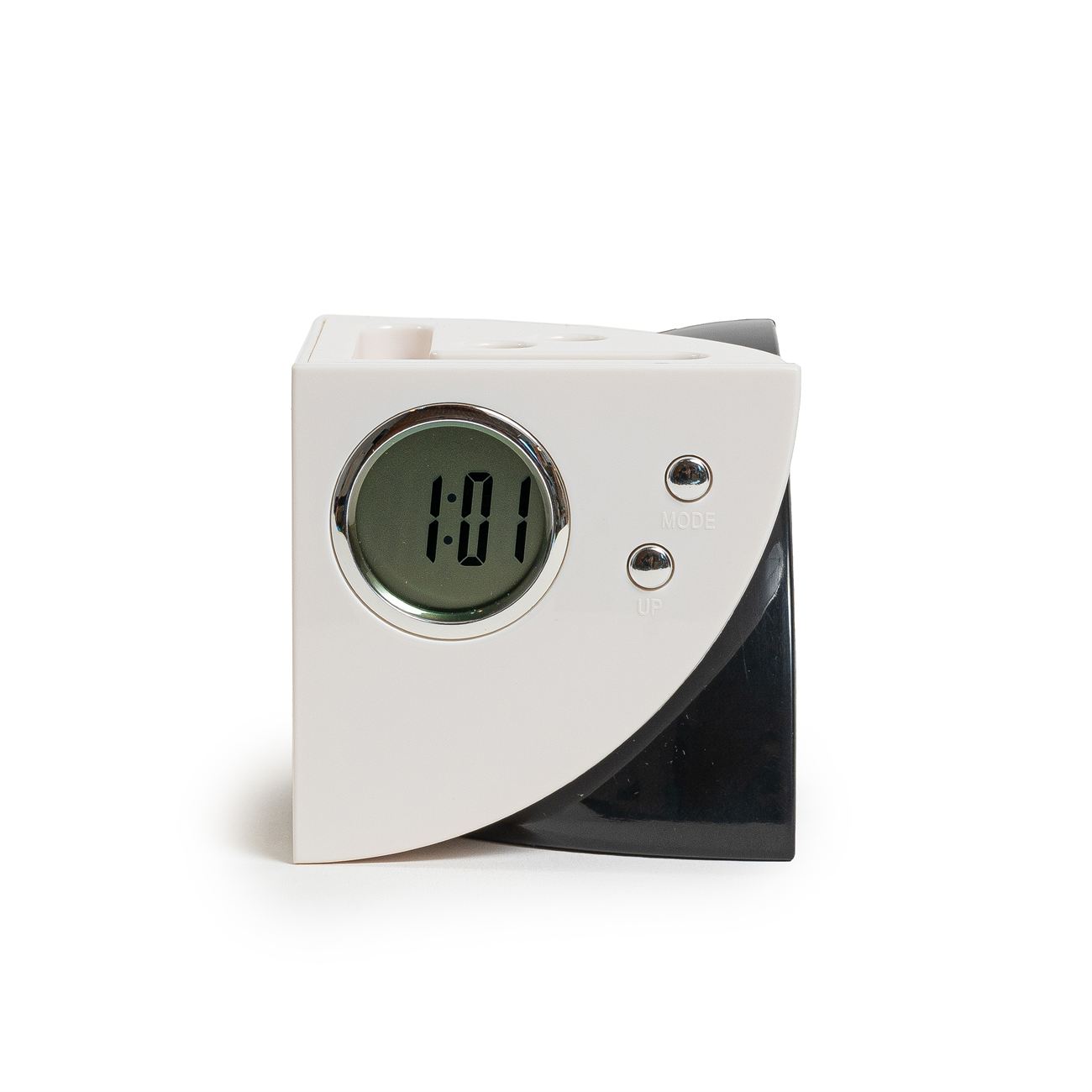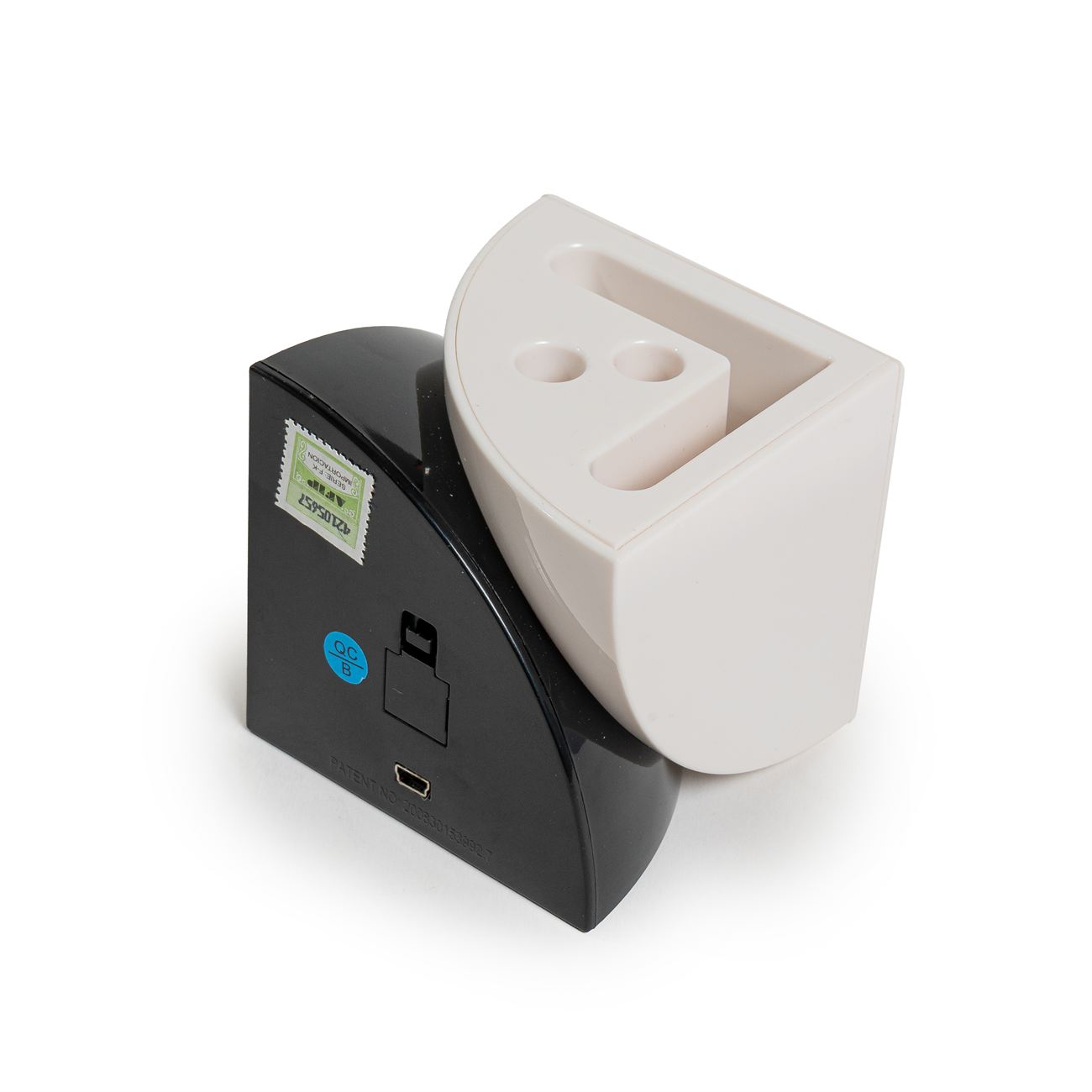 Portalápiz Multipuerto Descripción: Reloj, posee 4 puertos USB 2.0, reloj, calendario y alarma, incluye pila tipo botón y cable USB. Caja contenedora de cartón blanco. Dimensiones: 8cm x 8 cm. Material: Plástico.