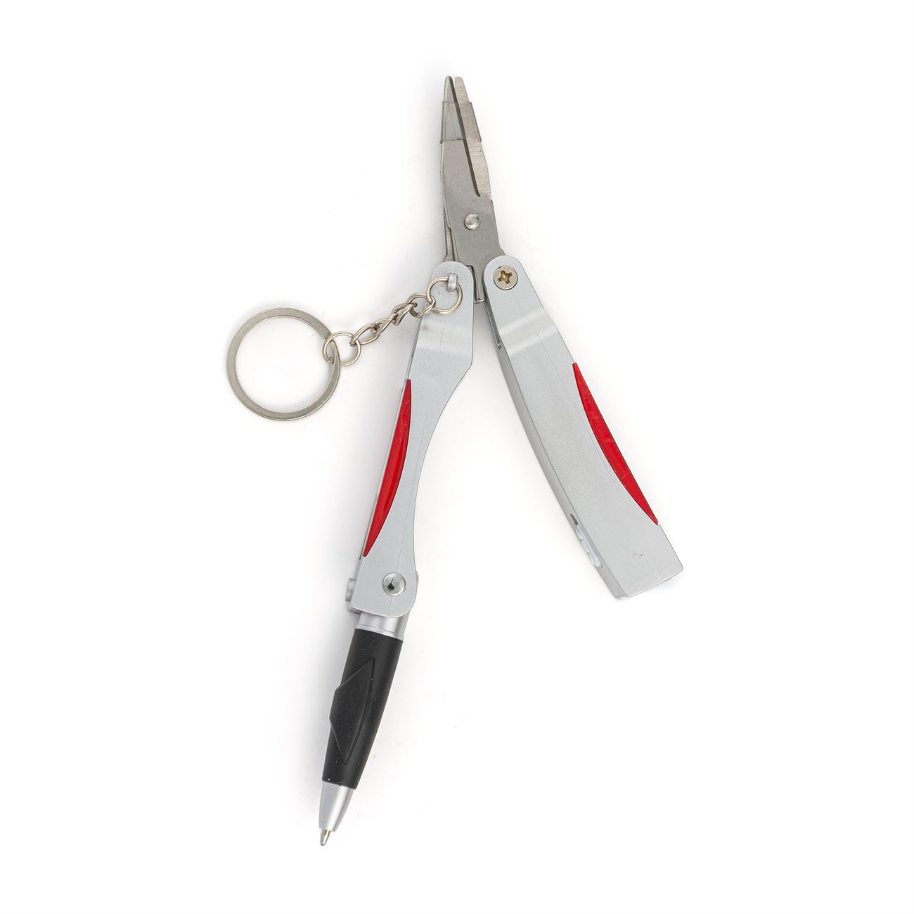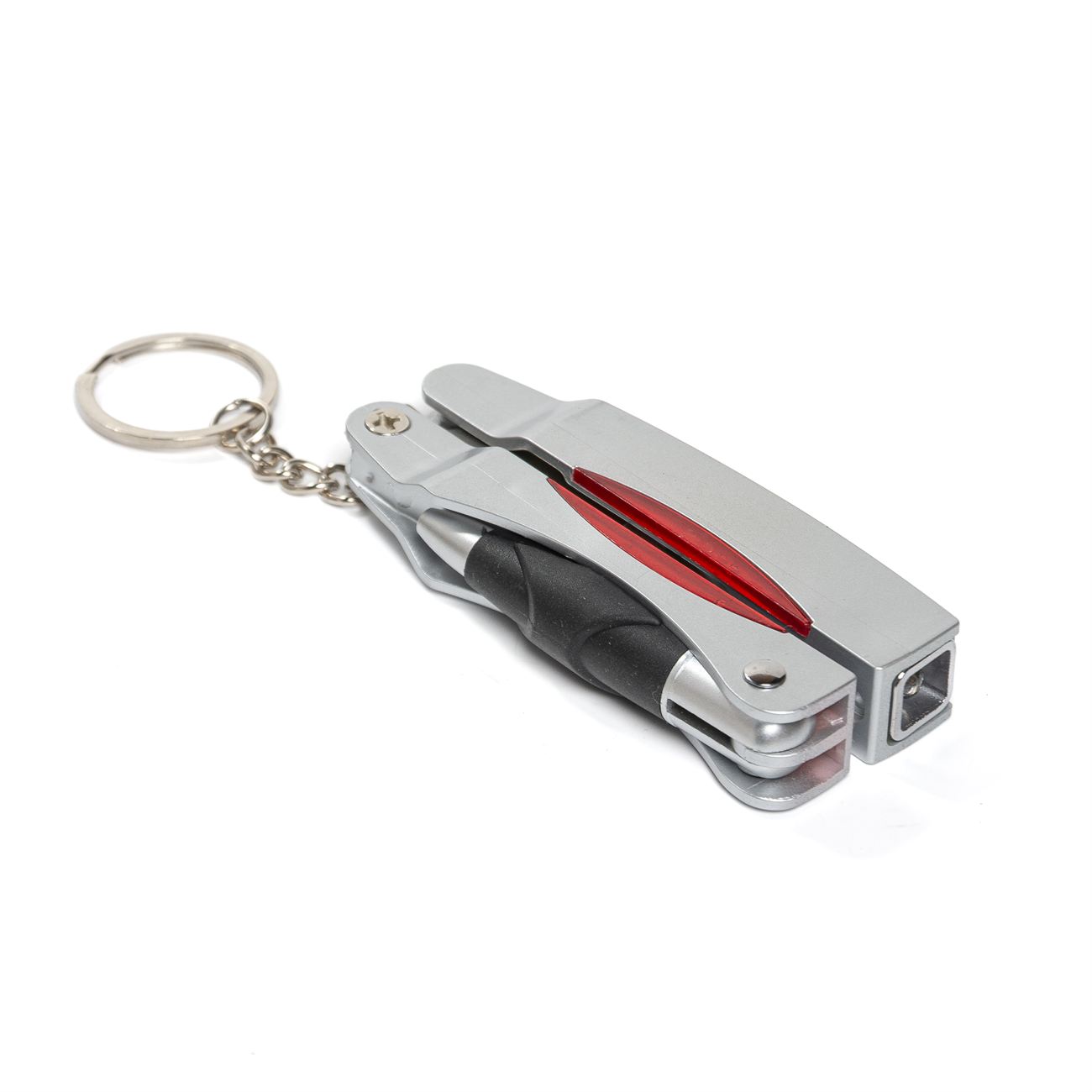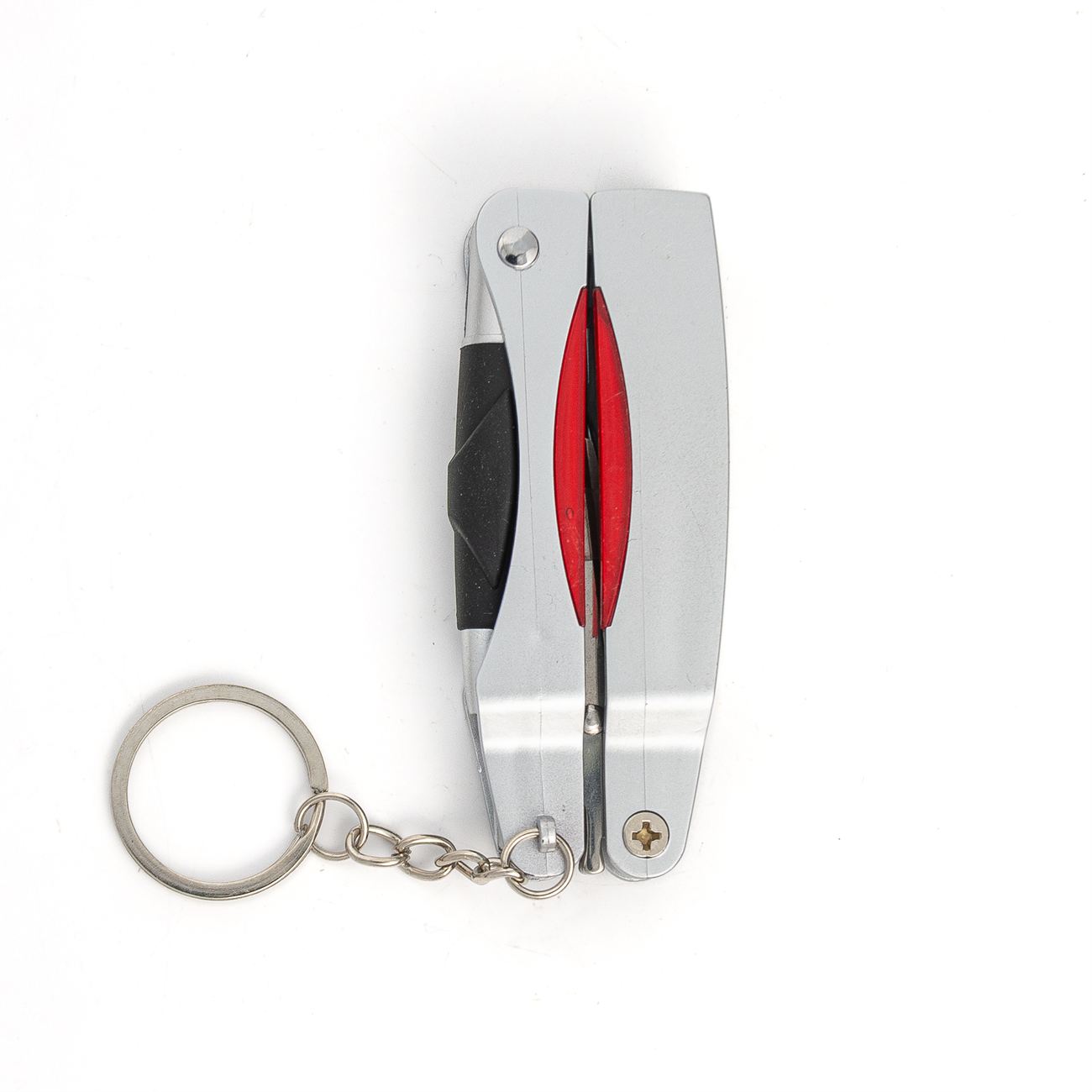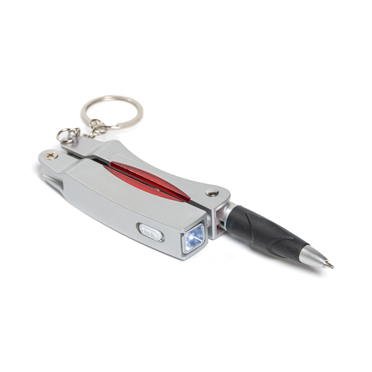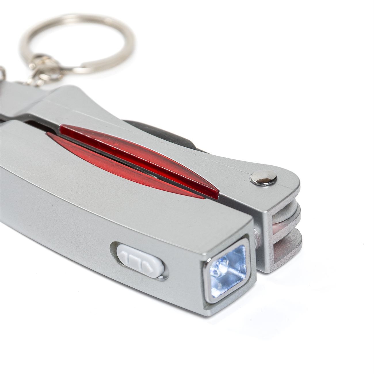 Tijera multifunción Descripción: Desplegable con linterna y bolígrafo incorporados. Posee aro llavero. Dimensiones: Cerrada 3cm x 8cm, ancho 1,4cm. Materiales: Plástico y tijera metálica.