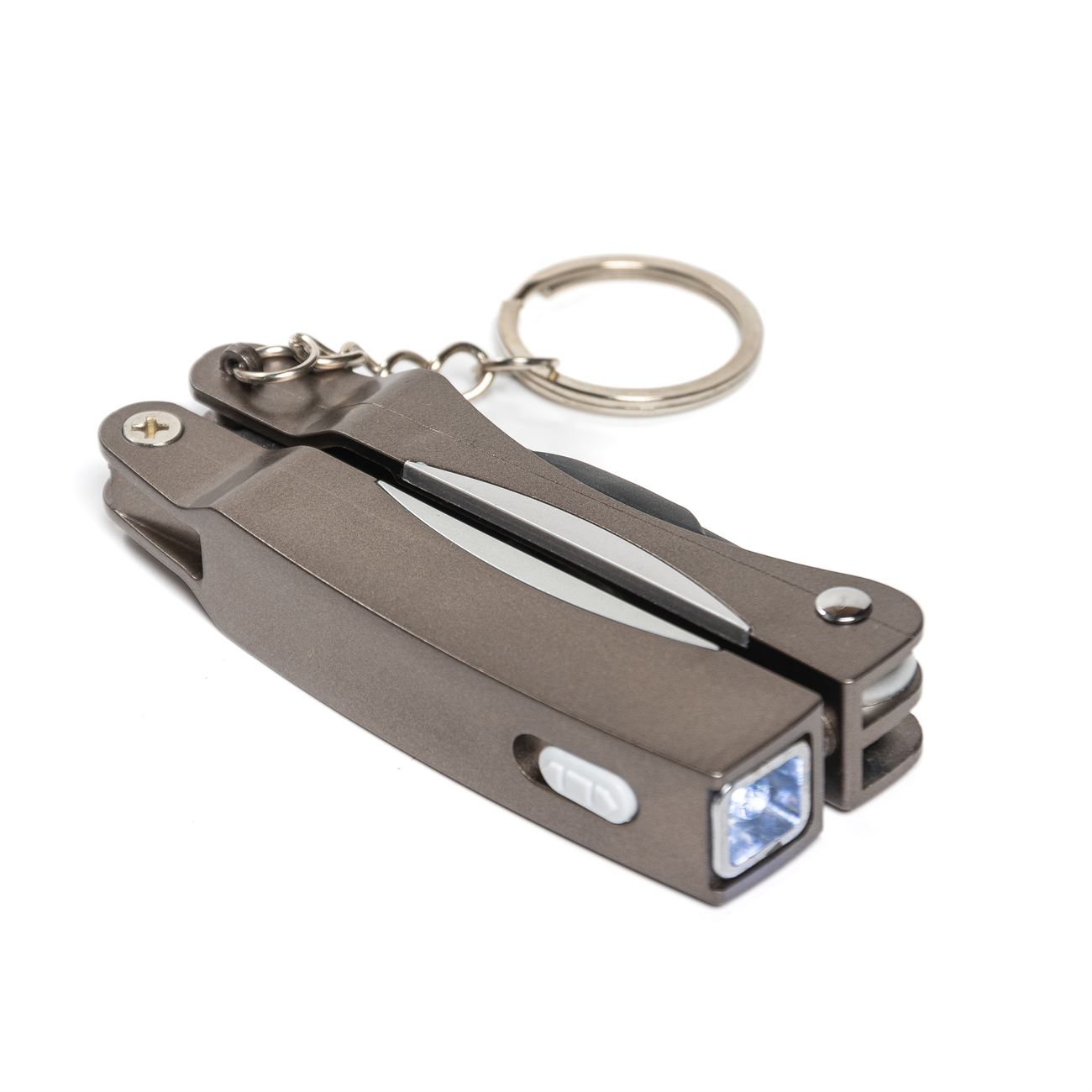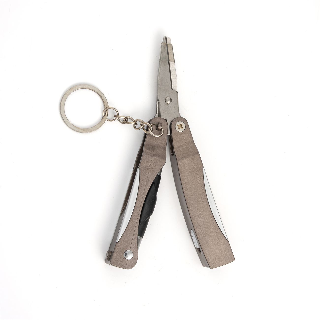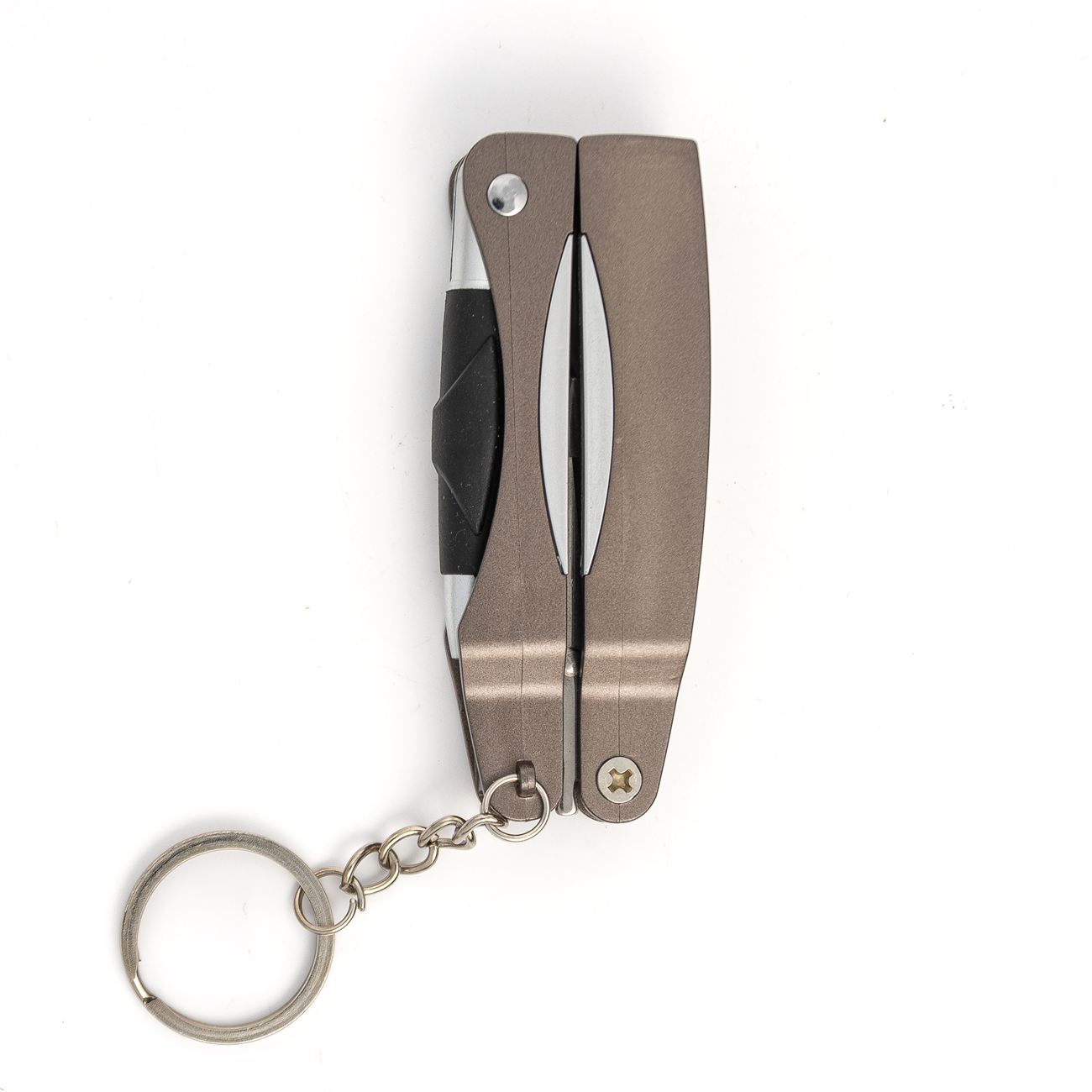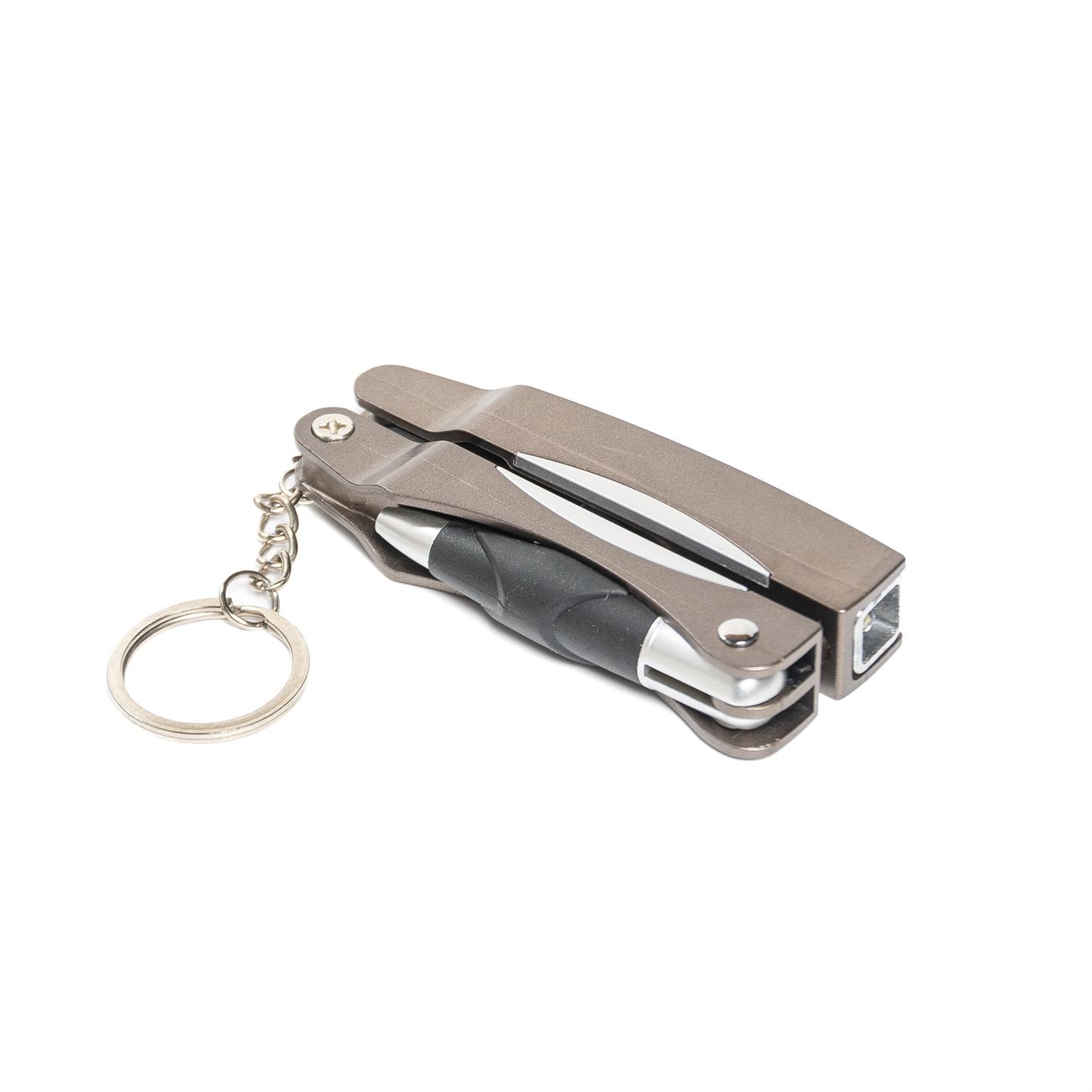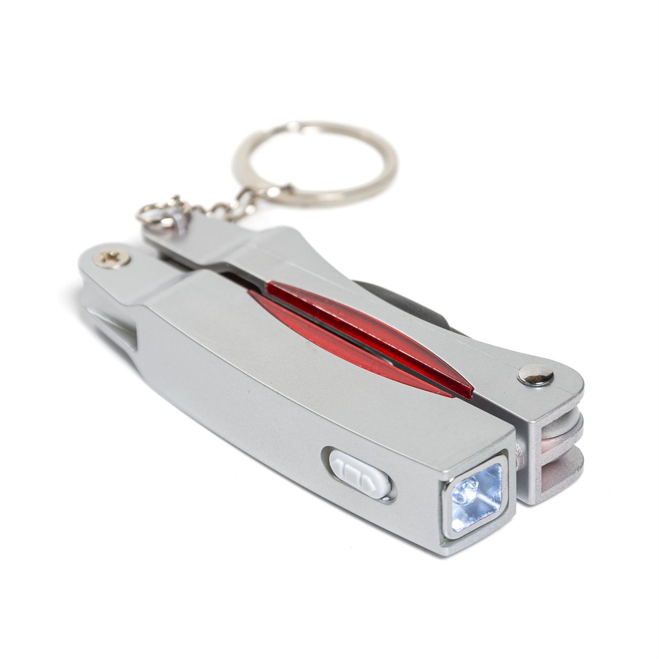 Tijera multifunción Descripción: Desplegable con linterna y bolígrafo incorporados. Posee aro llavero. Dimensiones: Cerrada 3cm x 8cm, ancho 1,4cm. Materiales: Plástico y tijera metálica.