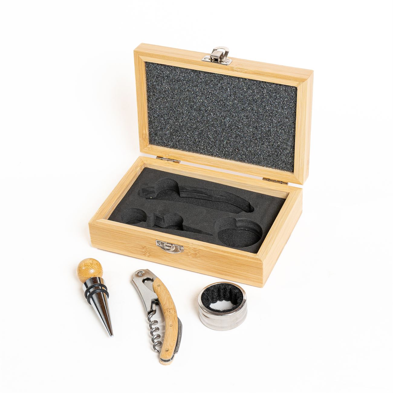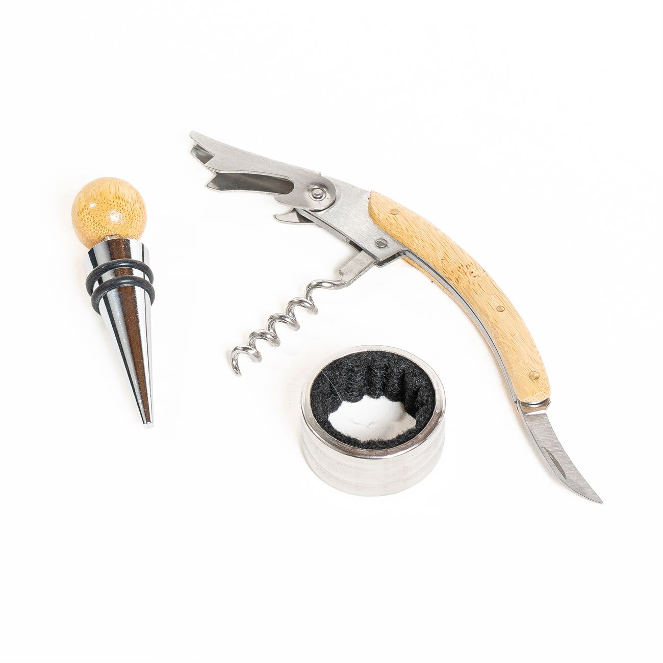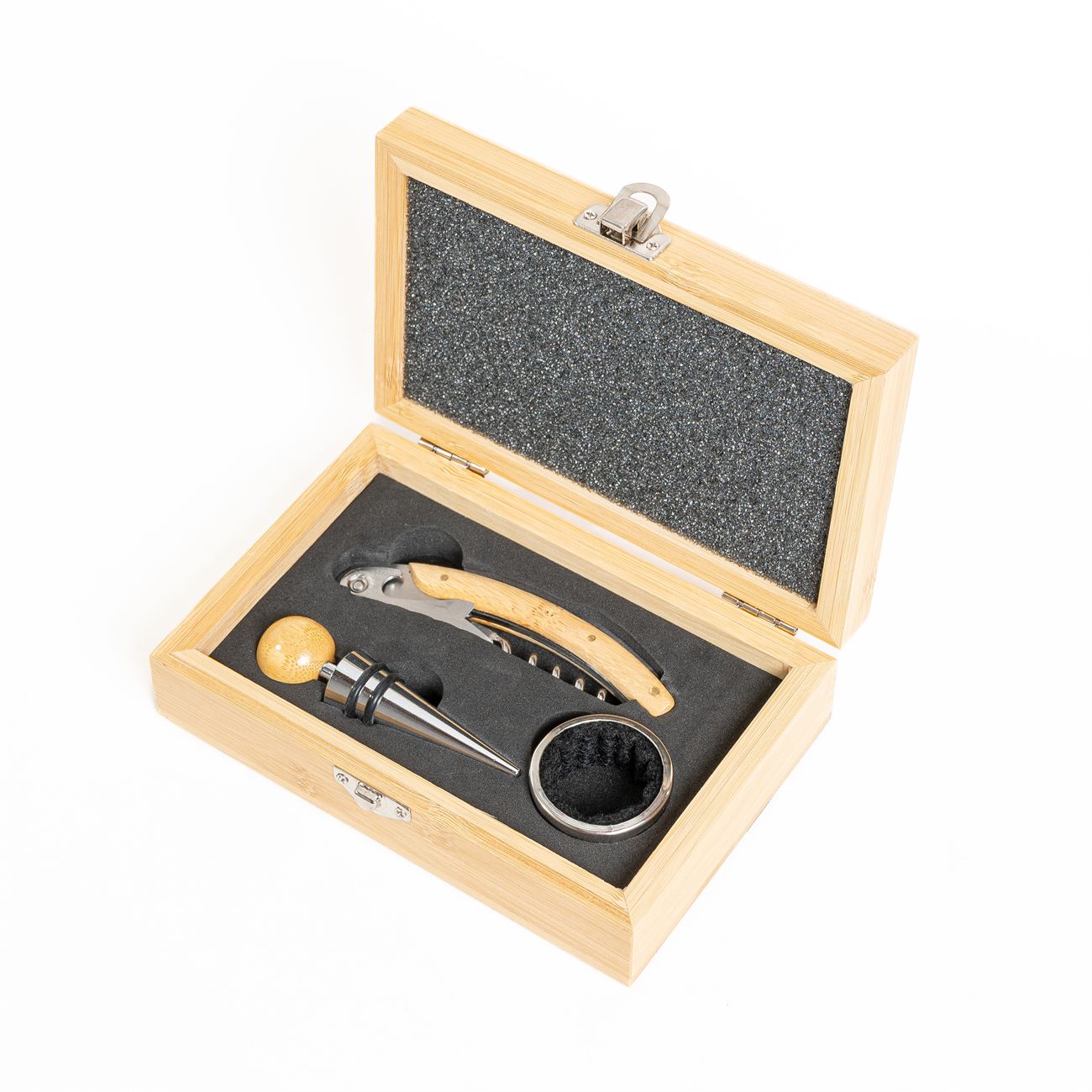 Contiene un sacacorchos de acero inoxidable y mango de madera, aro corta gota y tapón con detalle en madera. Estuche en madera con cierre metálico. Caja contenedora de cartón blanco.