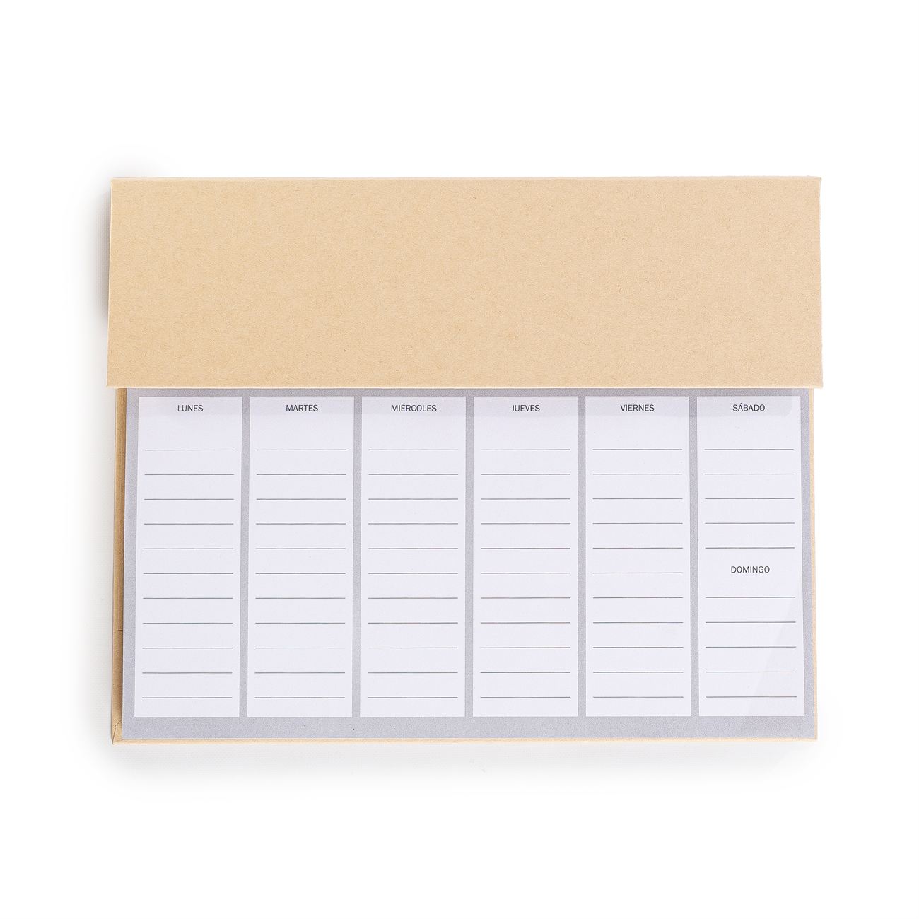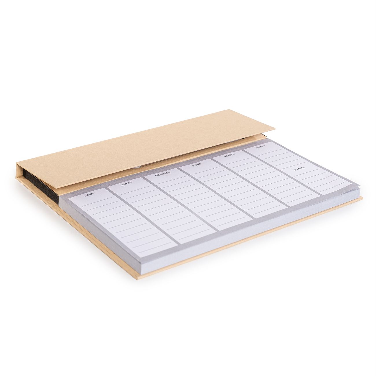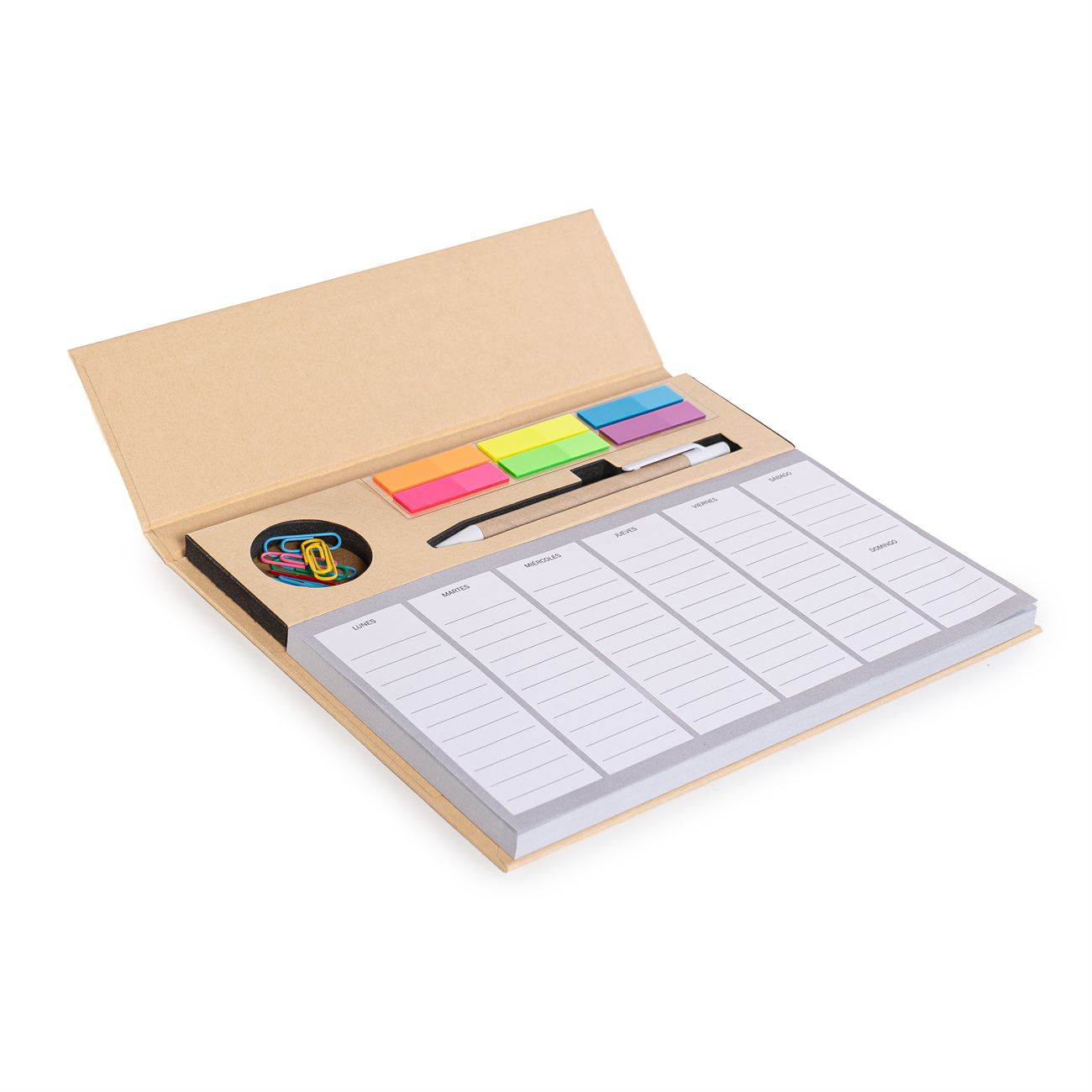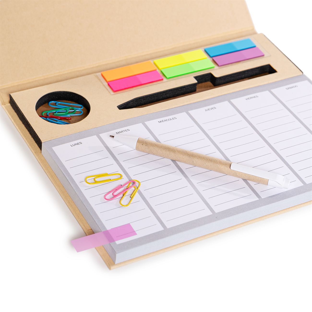Set Eco calendario de escritorio: Calendario semanal de mesa con diseño multifuncional de 100 hojas. Incluye cubierta kraft, clips, kit de notas adhesivas, bolígrafo eco con tinta negra.
