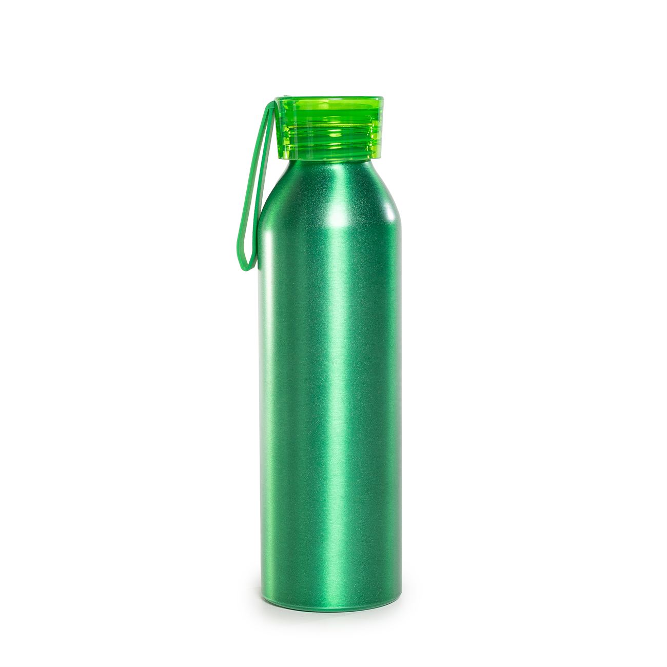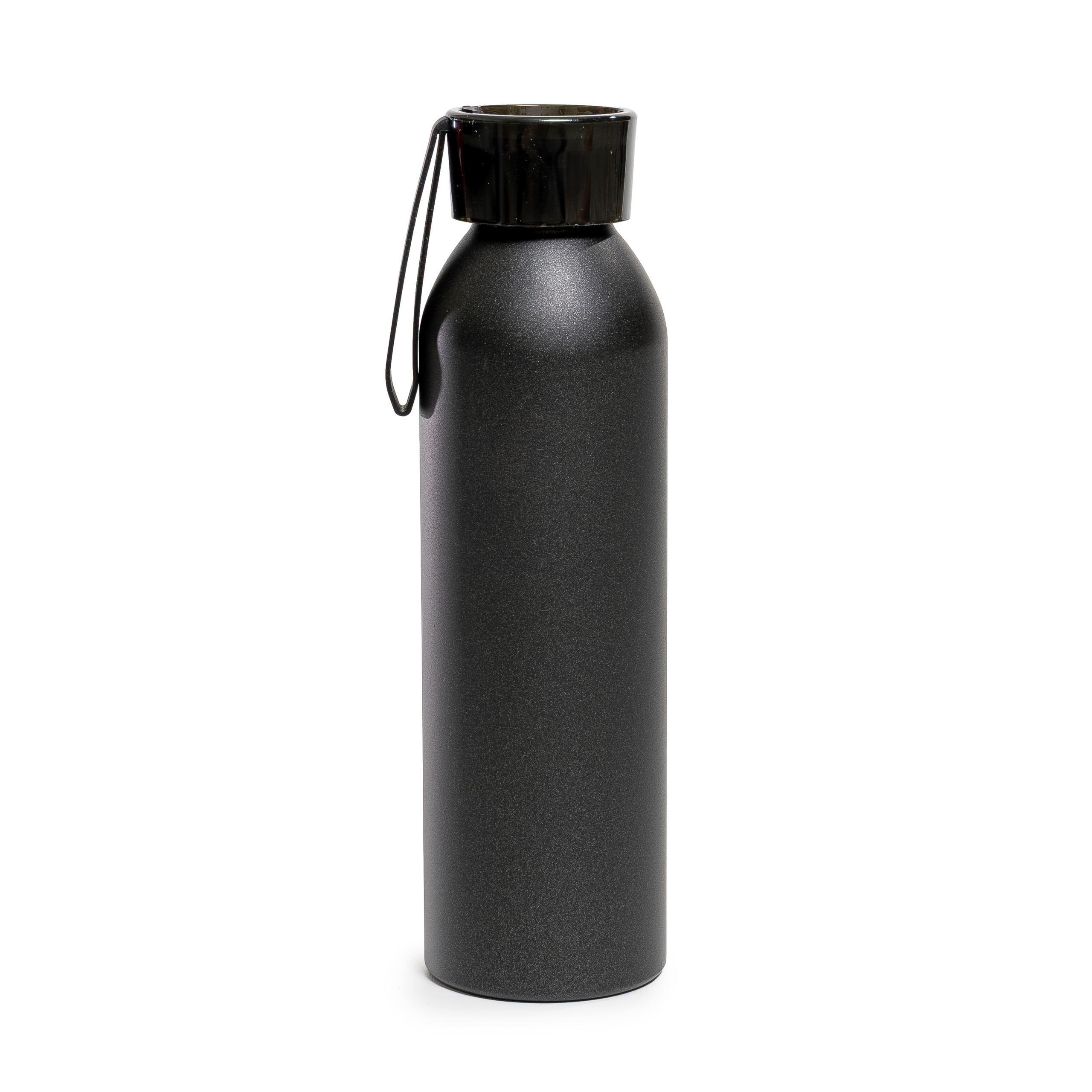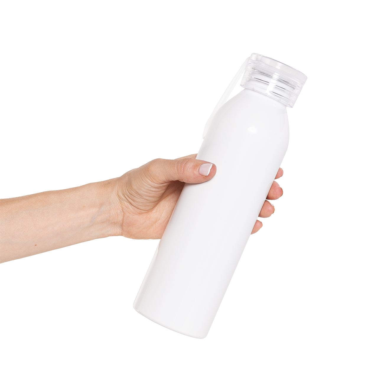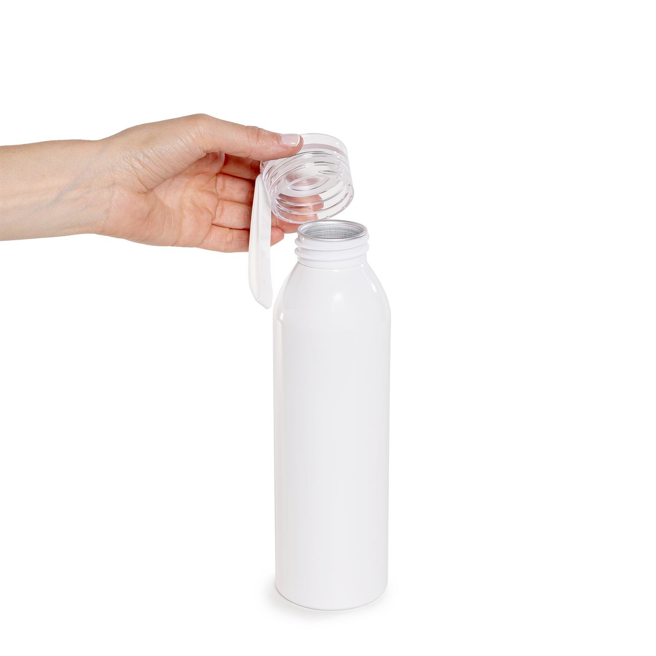 Botella de aluminio de 600ml pared simple. Tapa transparente a rosca con tira de agarre de silicona de 8 cm. Incluye caja de cartón blanca.
