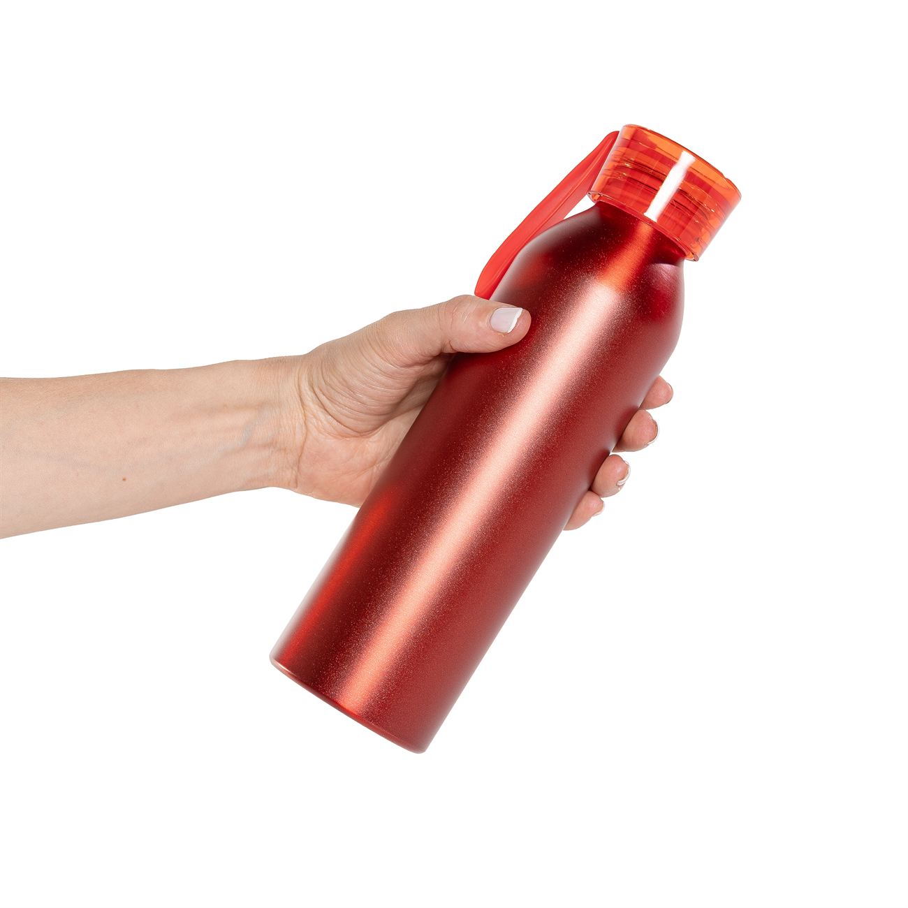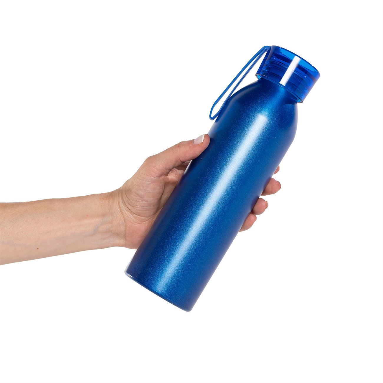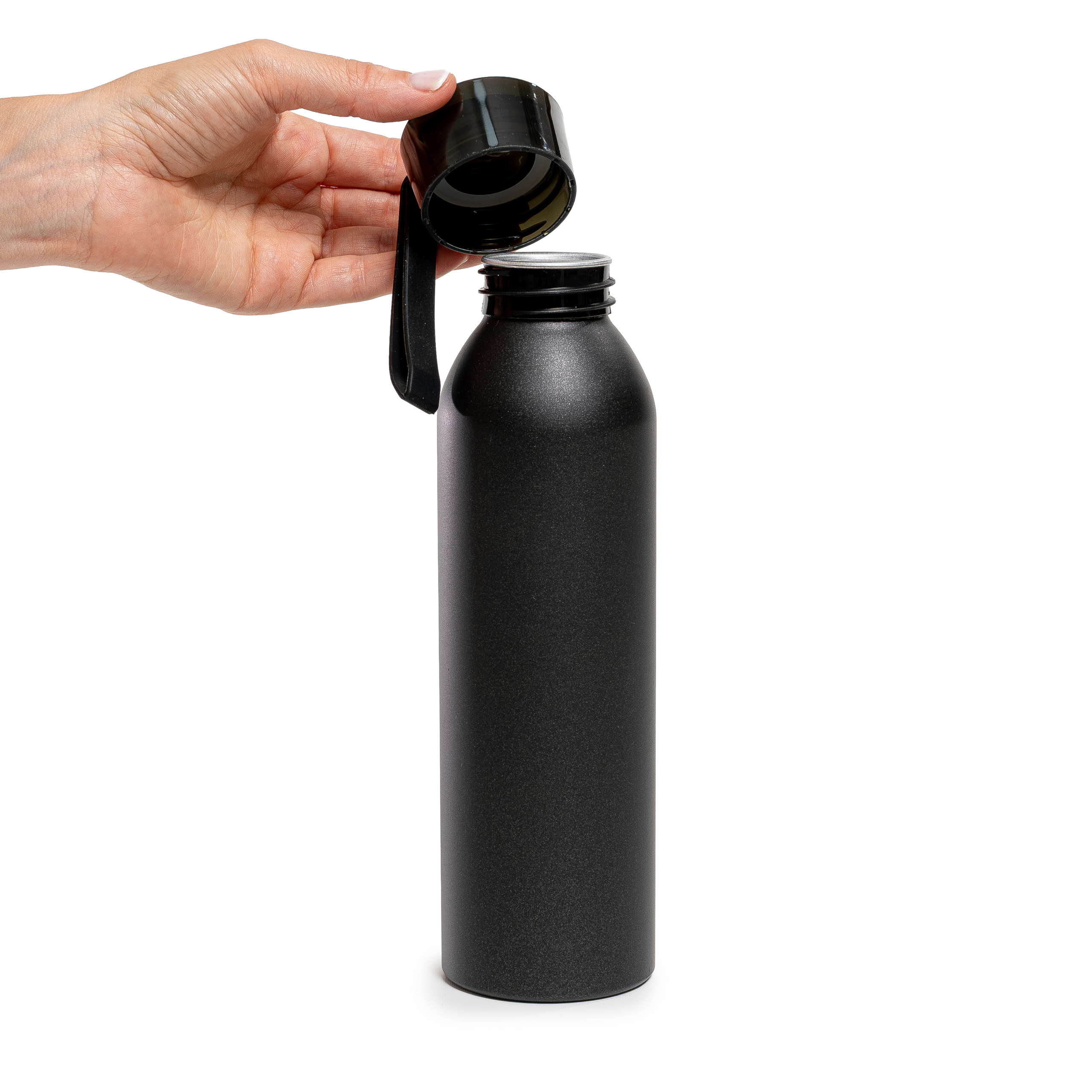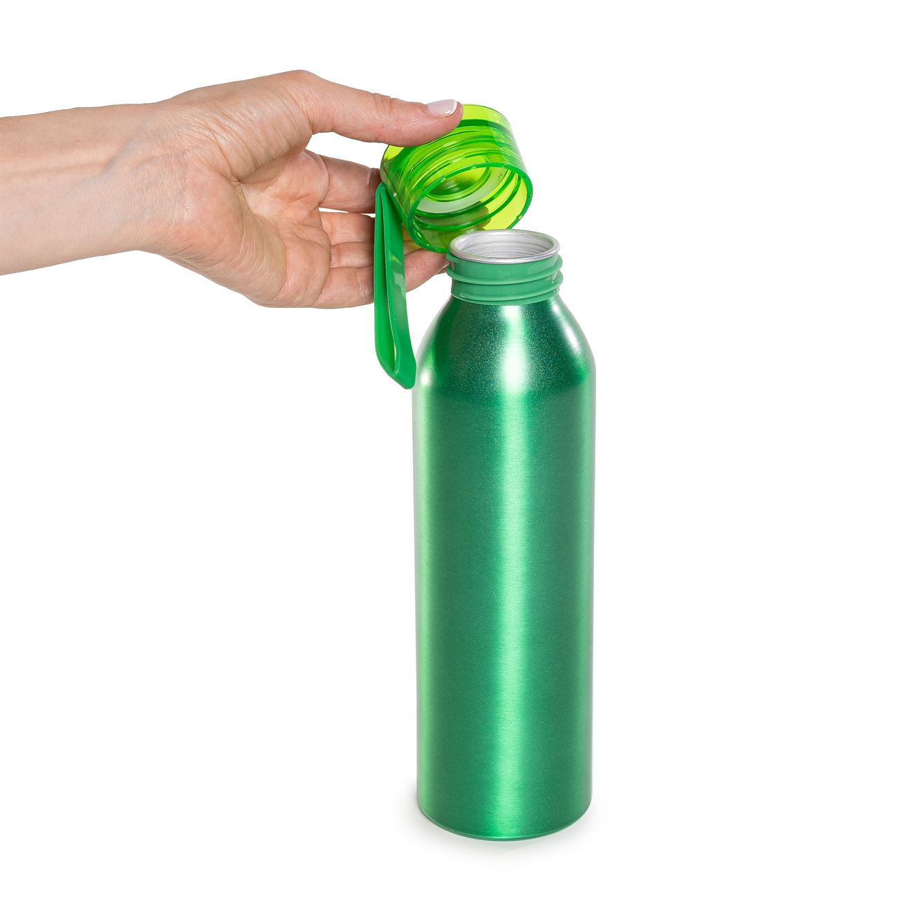 Botella de aluminio de 600ml pared simple. Tapa transparente a rosca con tira de agarre de silicona de 8 cm. Incluye caja de cartón blanca.