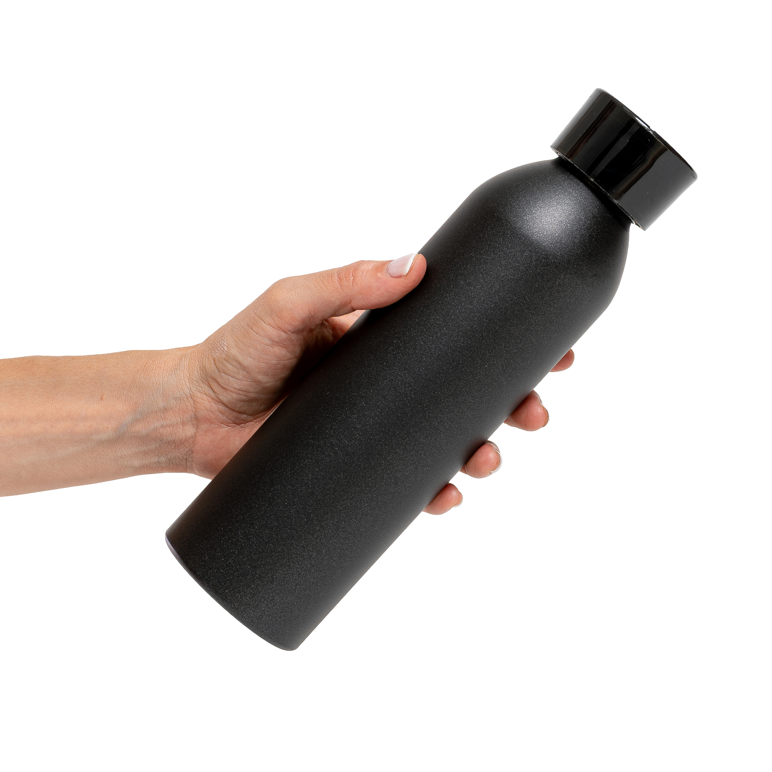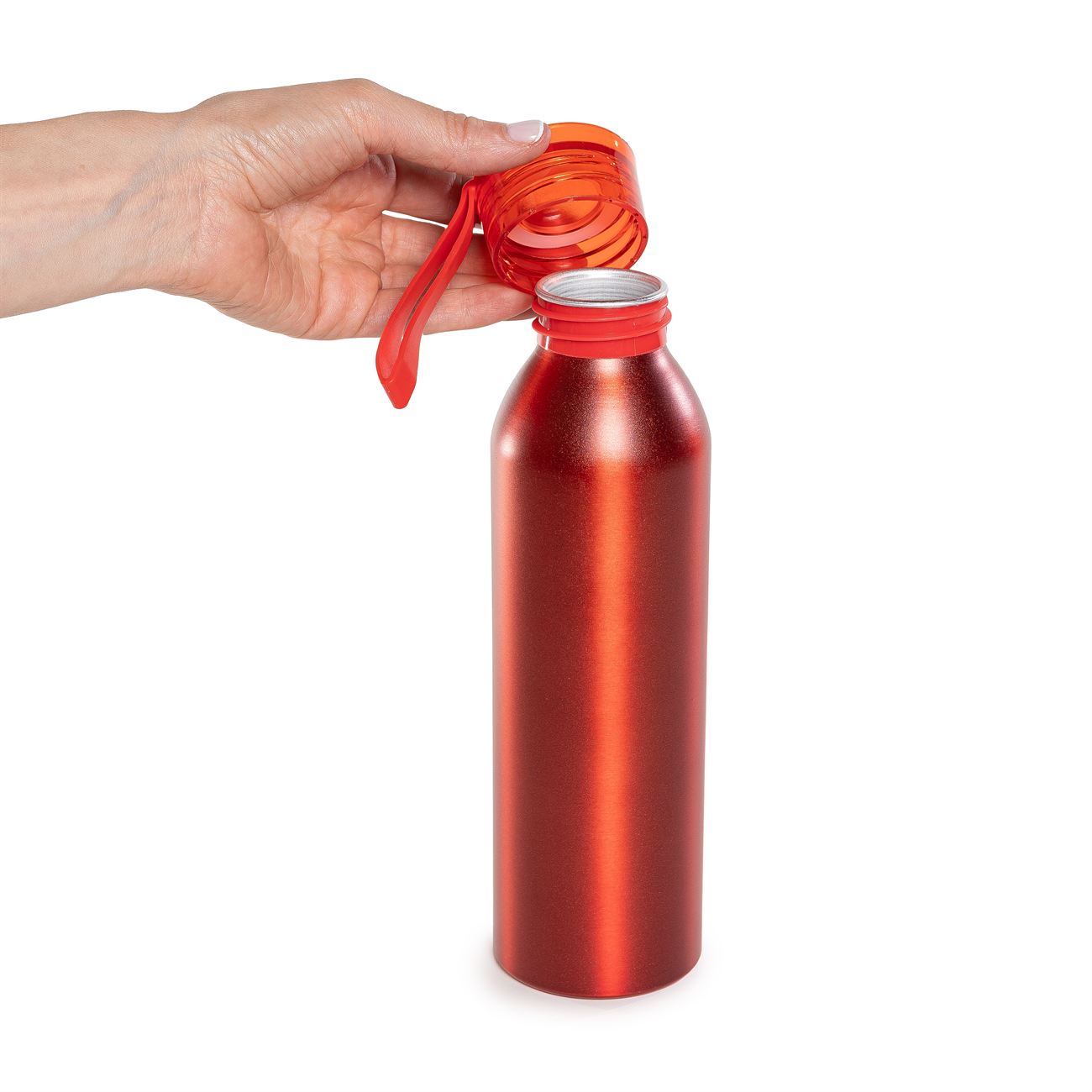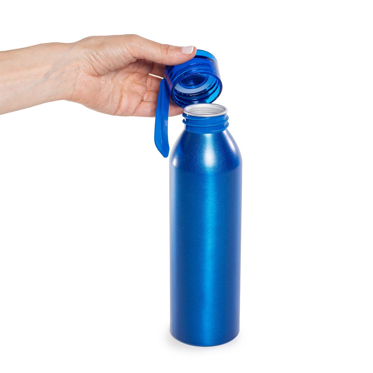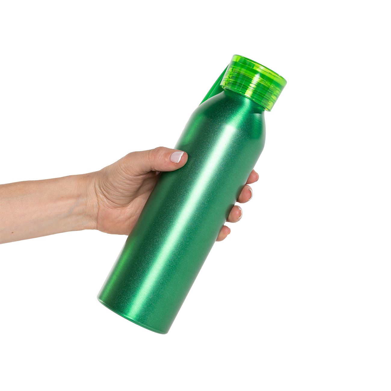 Botella de aluminio de 600ml pared simple. Tapa transparente a rosca con tira de agarre de silicona de 8 cm. Incluye caja de cartón blanca.