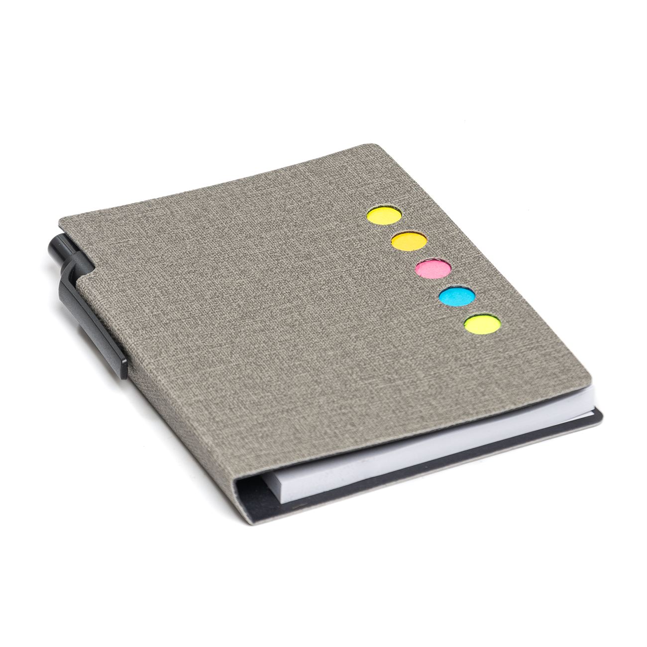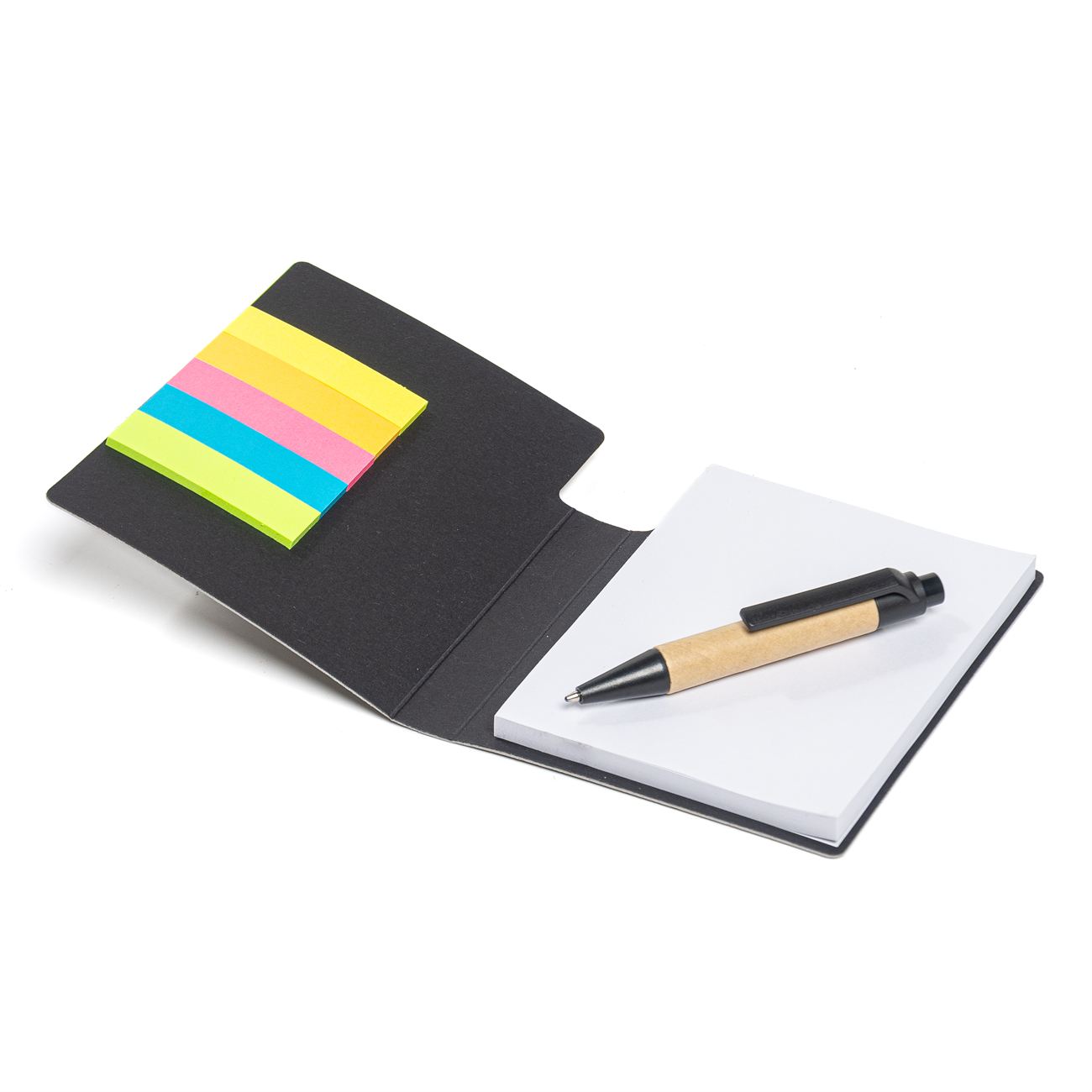 Memo Pad con Bolígrafo Descripción: Libreta de cartón con bolígrafo inserto, block blanco adhesivo de 50 hojas y señaladotes adhesivos. Dimensiones: 10.5*8.5*1cm de alto. Material: Papel y cartón recubierto de PVC.