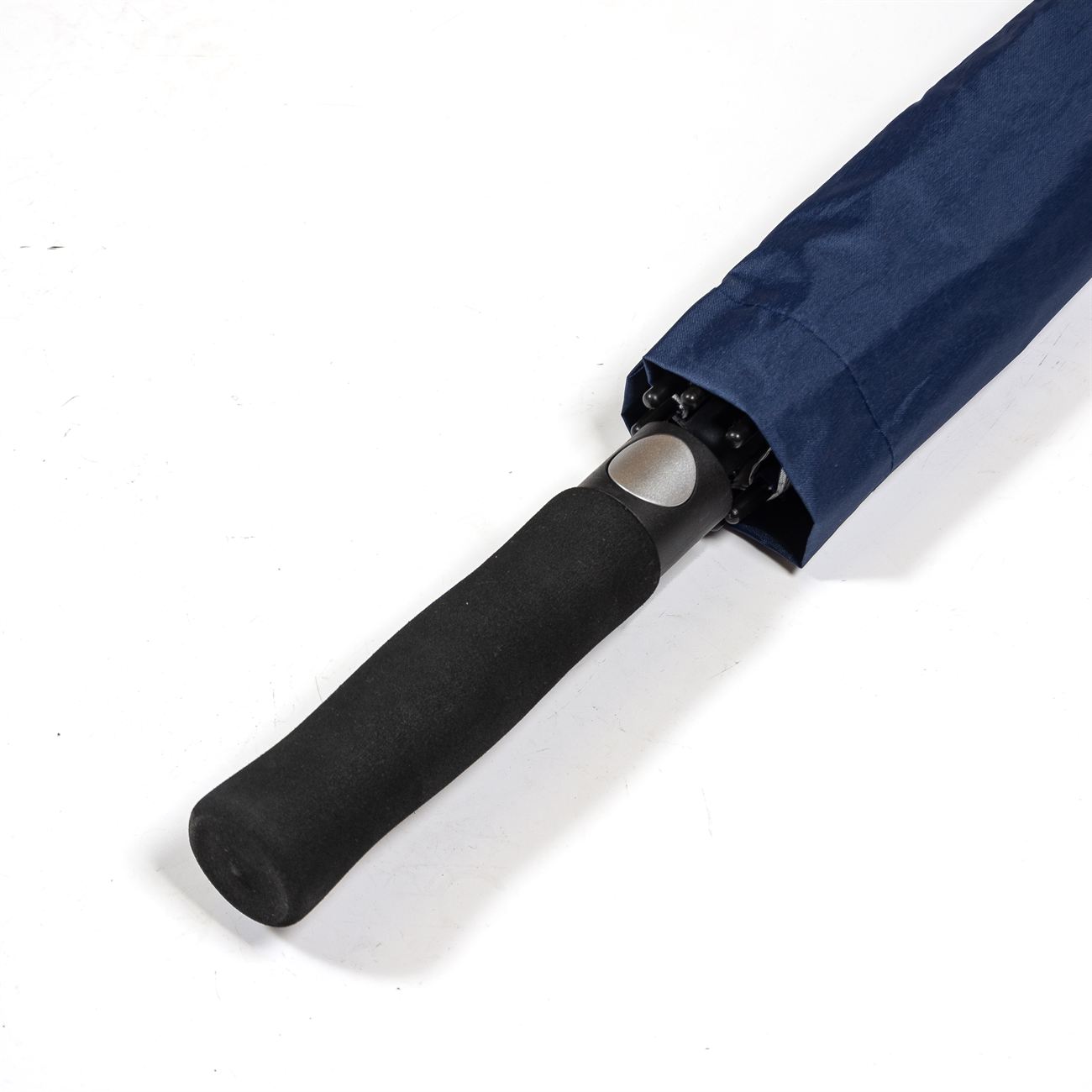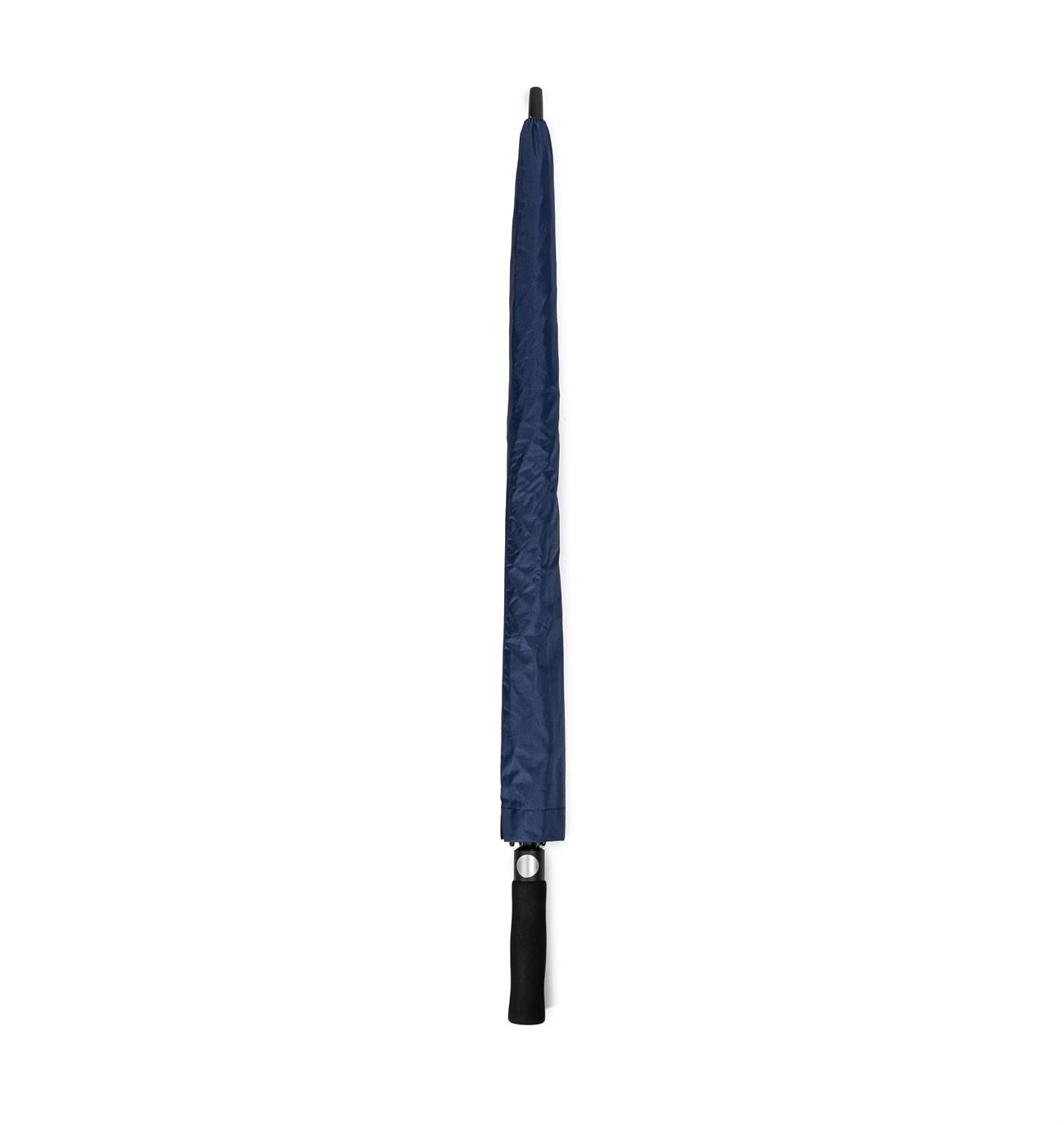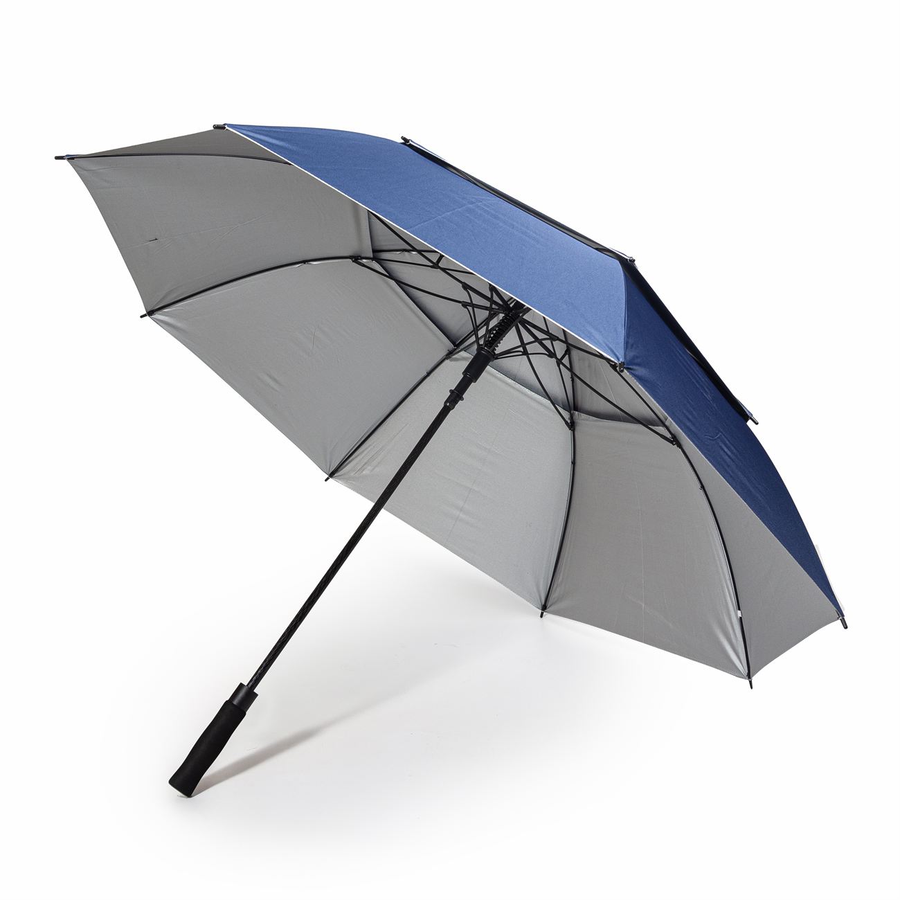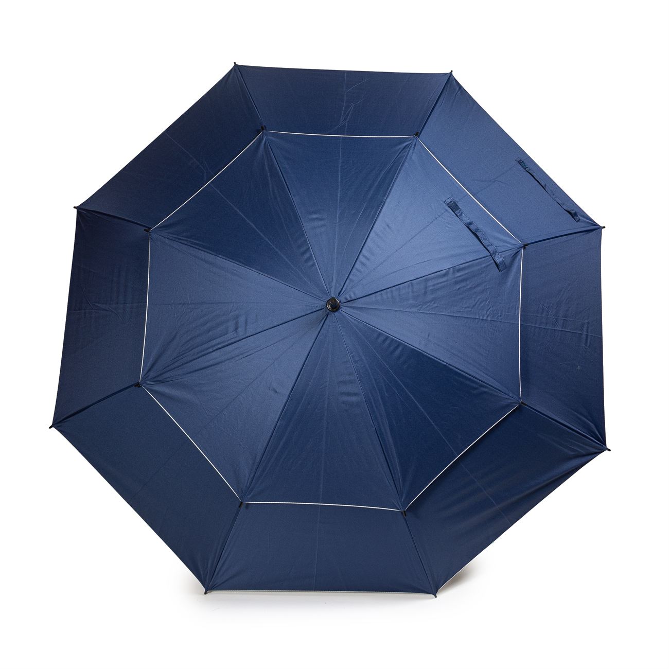 Descripción: Paraguas de Golf doble capa con apertura automática sistema antiviento. El paraguas esta compuesto por un sistema de ocho varillas dobles de fibra lo que le permite soportar vientos fuertes. Mango ergonómico de foam. Doble tira de cierre. Provee funda.