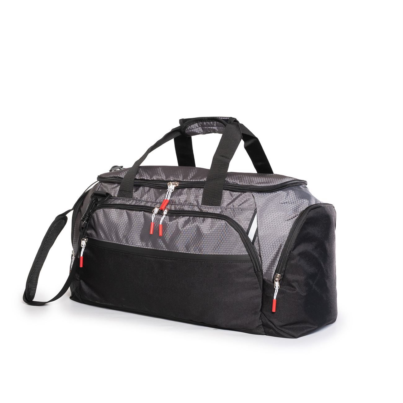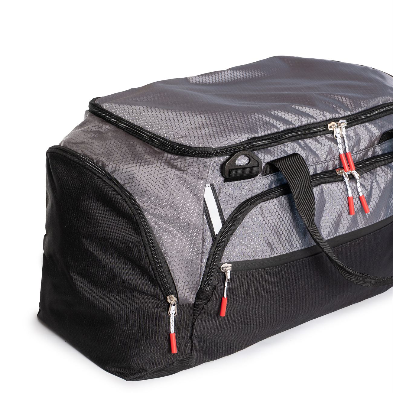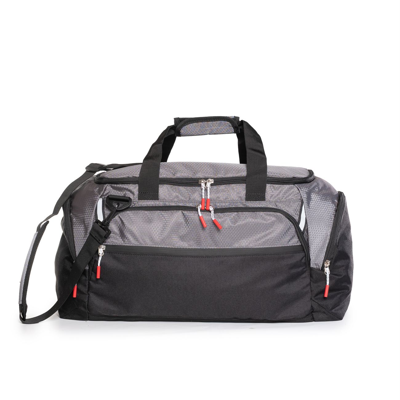 Manijas y correas con agarraderas acolchadas. Correa de colgar regulable. Bolsillos independientes en ambos laterales con cierre. Uno de ellos extensible hacia el interior. Todos los cierres traen tira cierre.