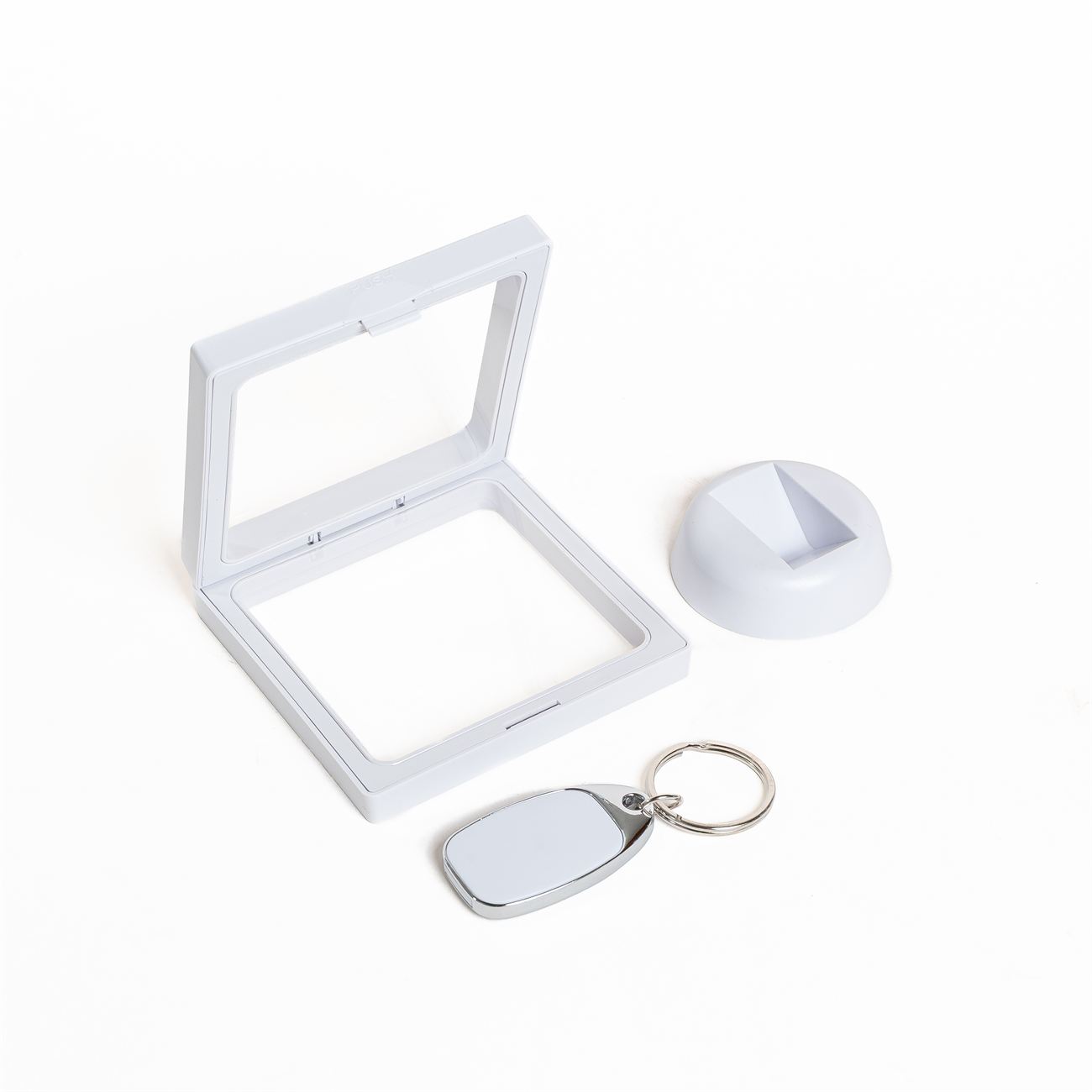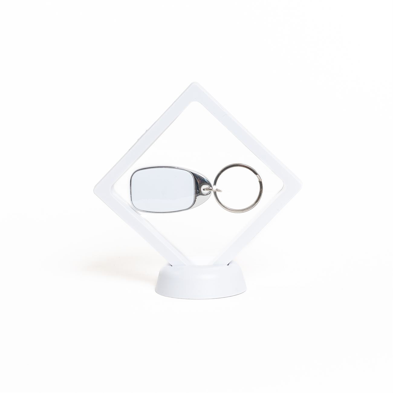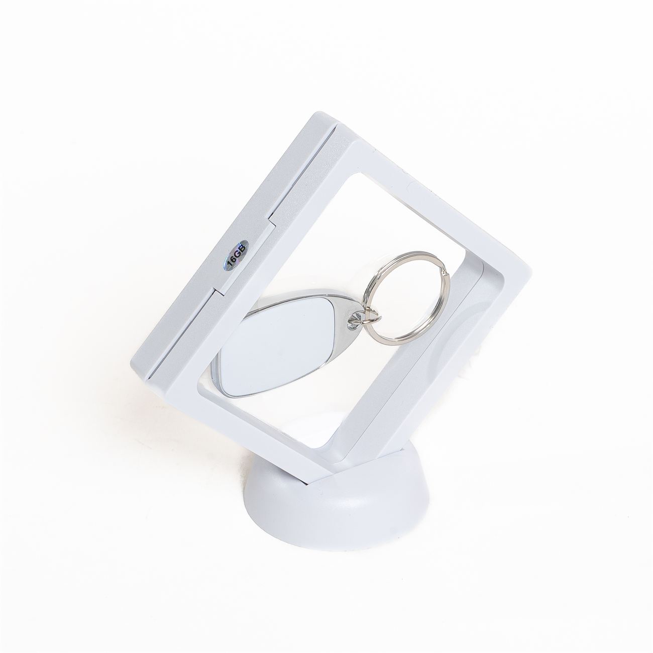 Descripción: Pendrive llavero de 16GB metálico con frente plastico blanco mate. Presentación en estuche plástico tipo sandwich, posee base sostenedora del estuche. Dimensiones: 5cm x 3cm x 0.5cm de ancho (sin el aro). Material: Metal y Plástico.