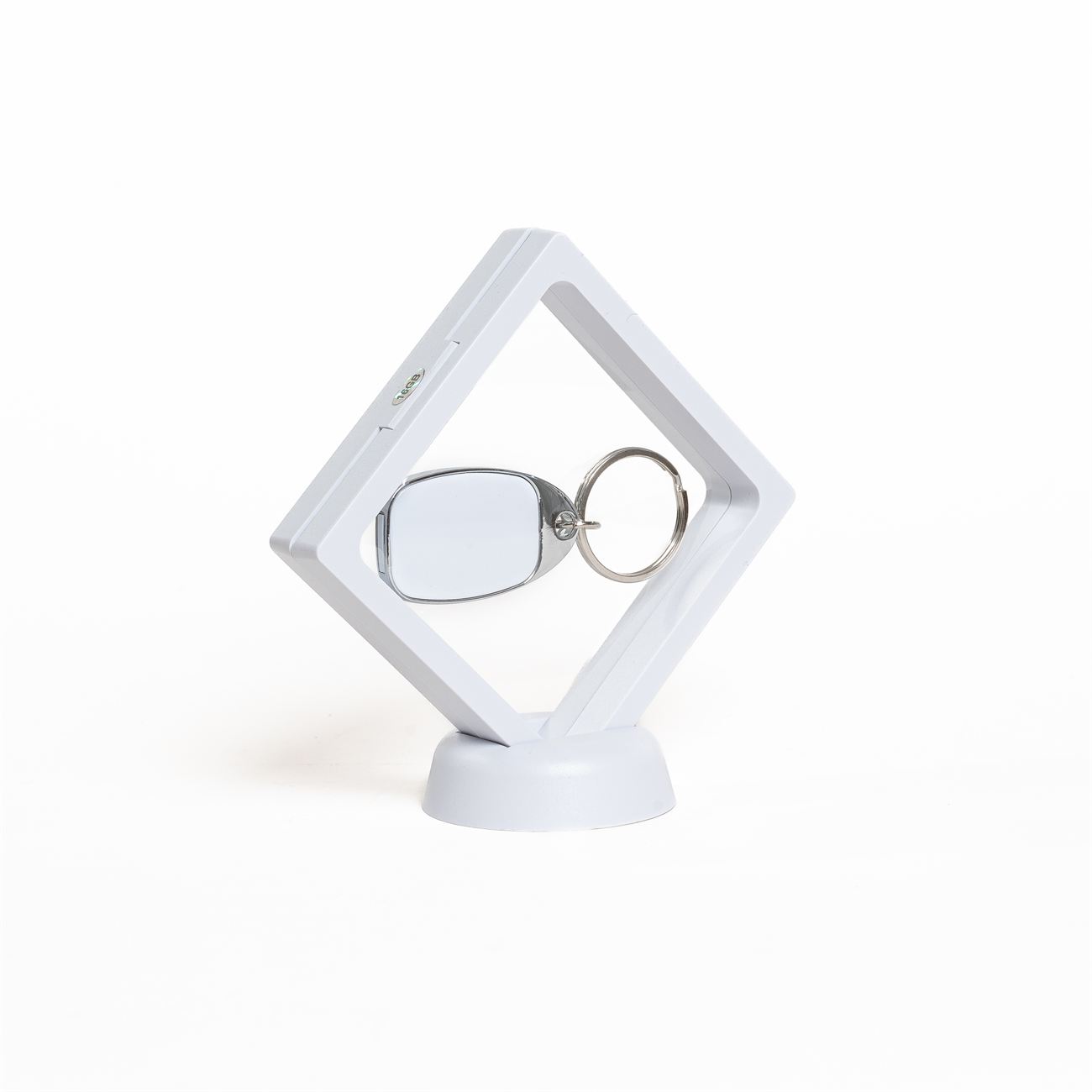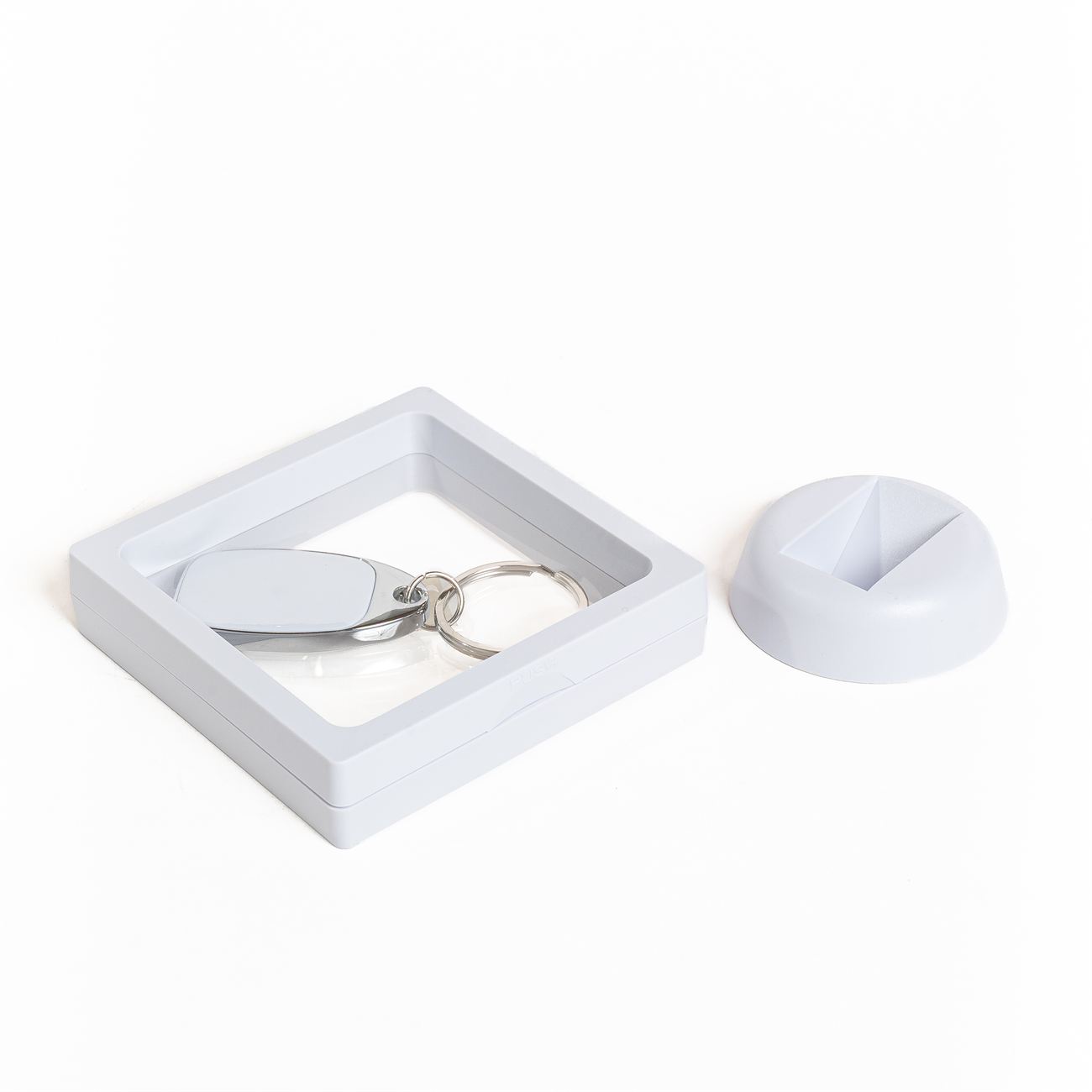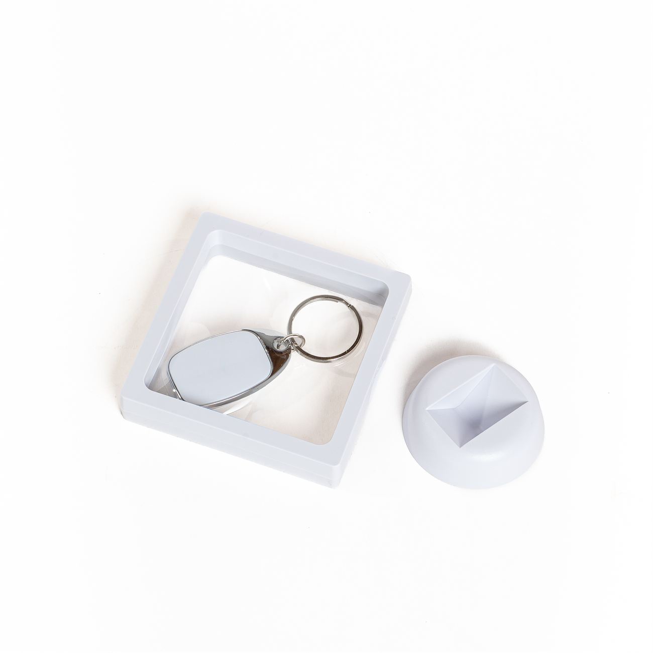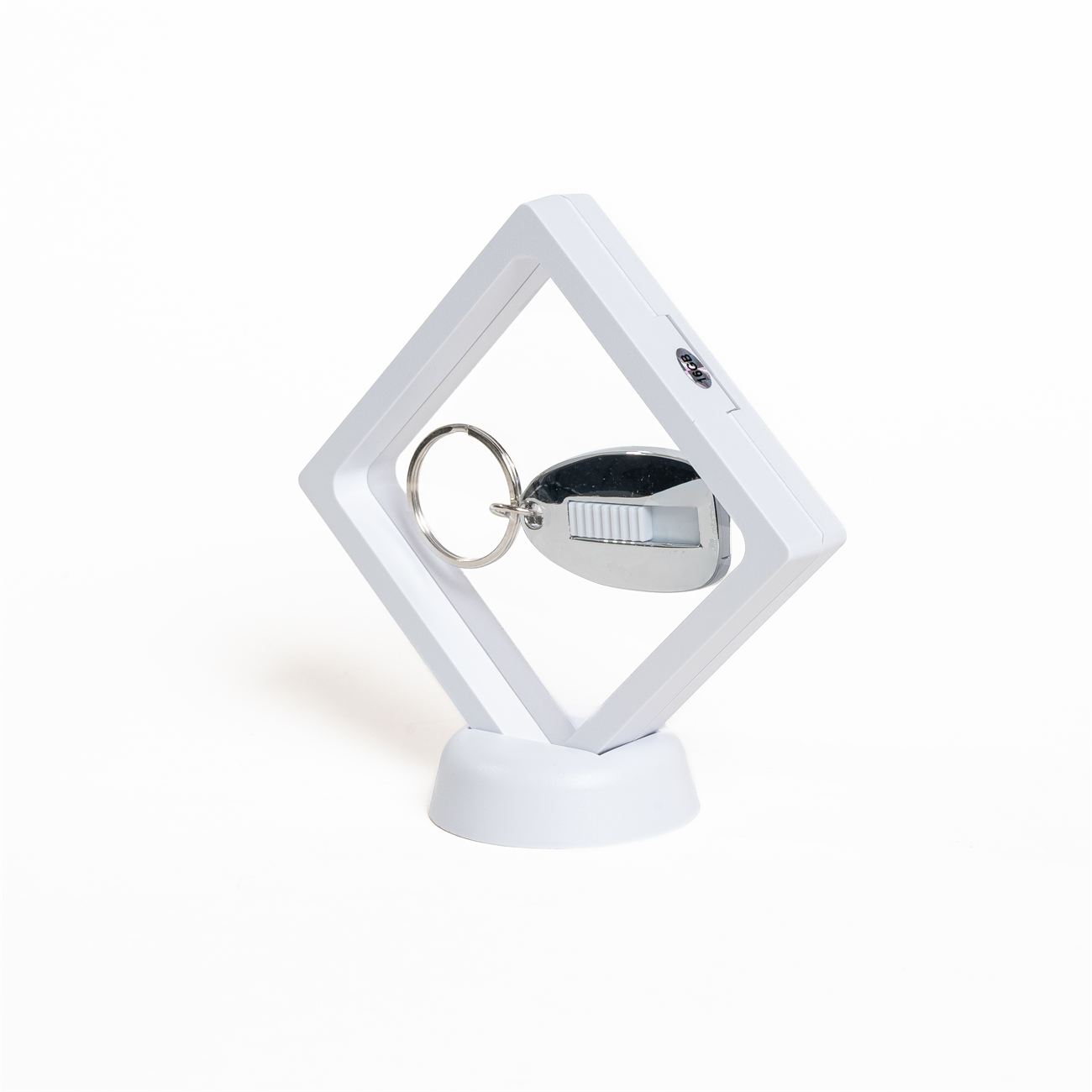 Descripción: Pendrive llavero de 16GB metálico con frente plastico blanco mate. Presentación en estuche plástico tipo sandwich, posee base sostenedora del estuche. Dimensiones: 5cm x 3cm x 0.5cm de ancho (sin el aro). Material: Metal y Plástico.