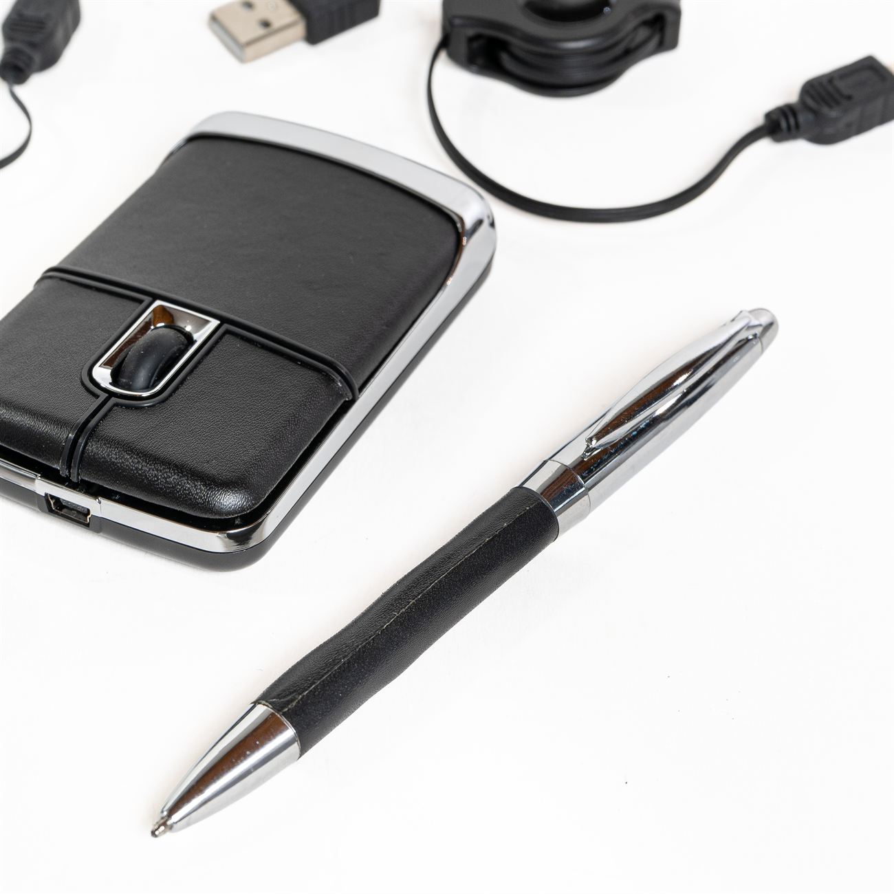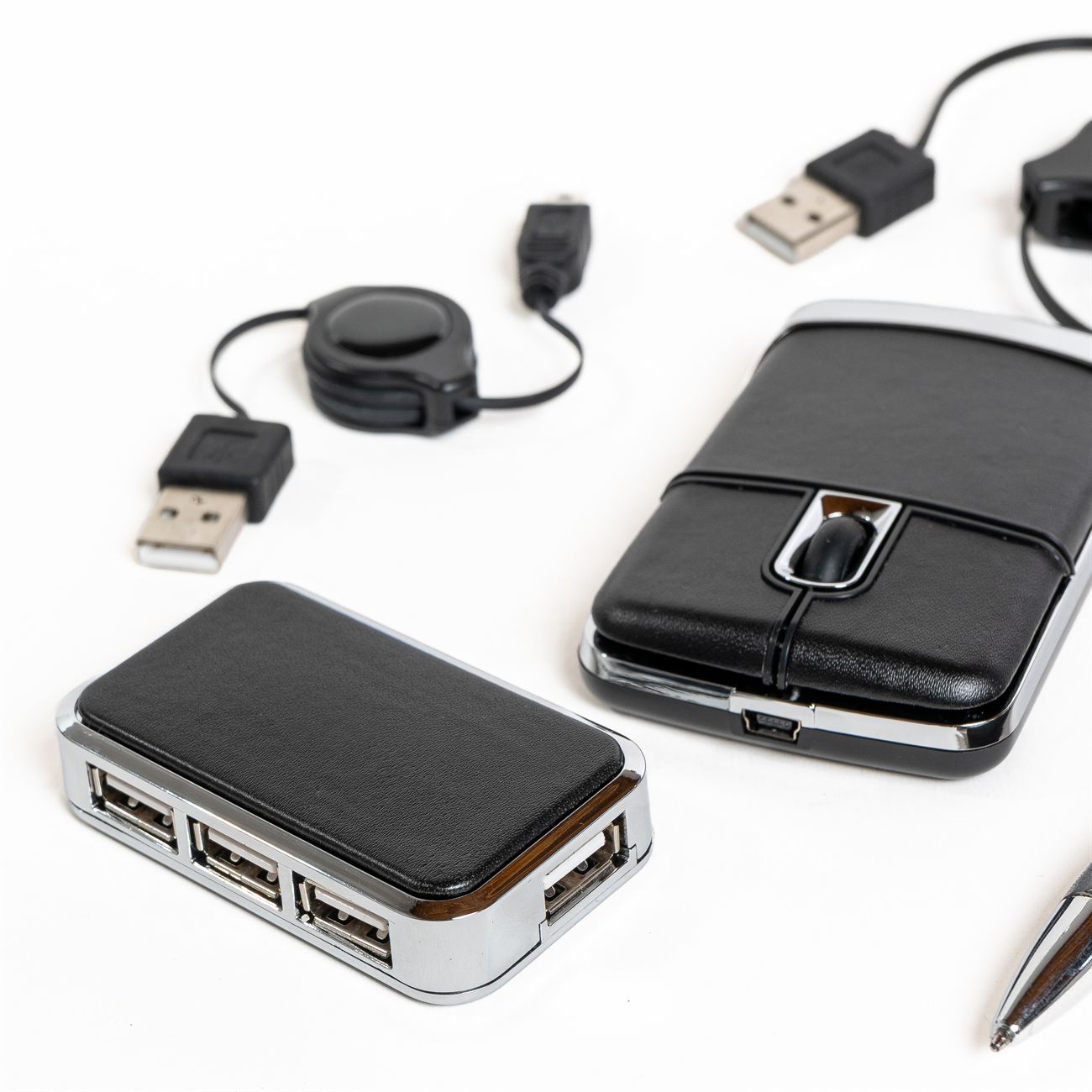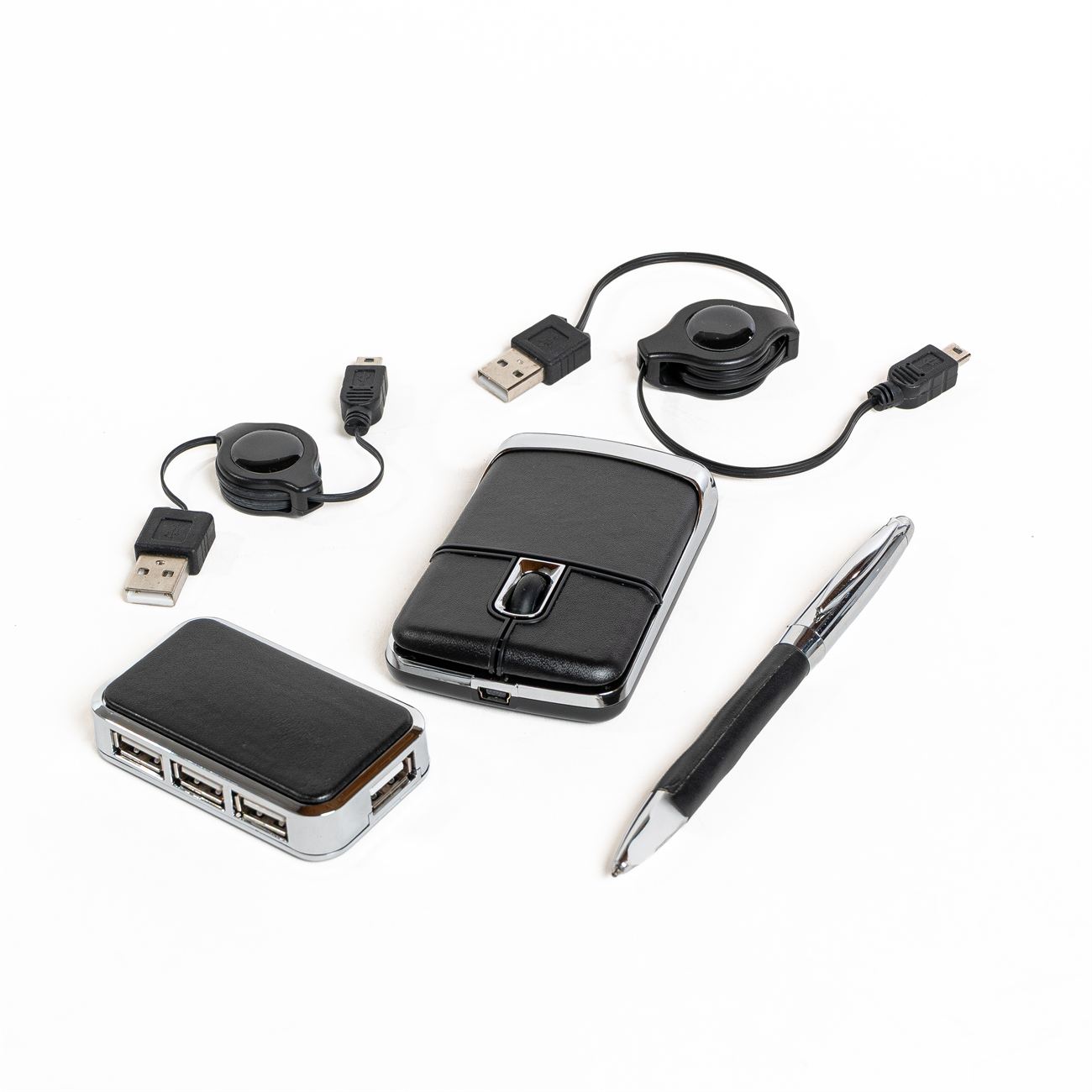Descripción: Set para notebook compuesto de un mouse óptico y un multipuesto USB revestidos en simil cuero, además contiene un bolígrafo metálico con simil cuero y dos conectores extensibles. Presentación en estuche con cierre de simil cuero con bolsillo interior.