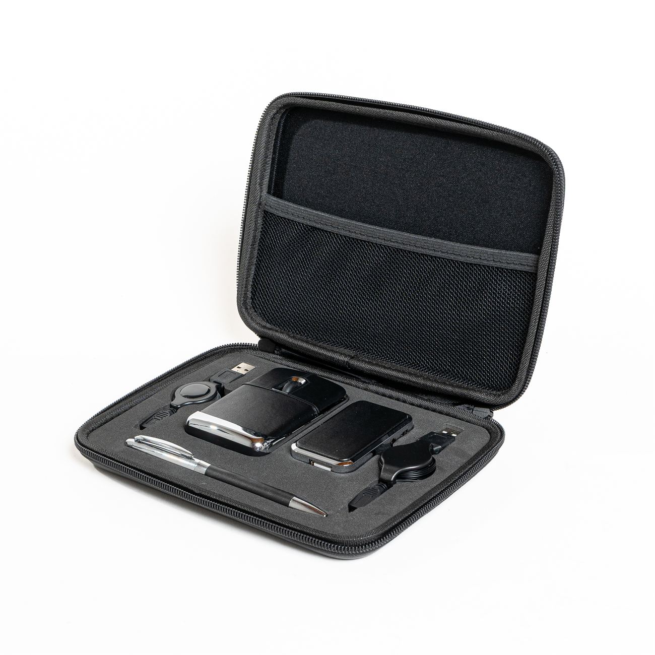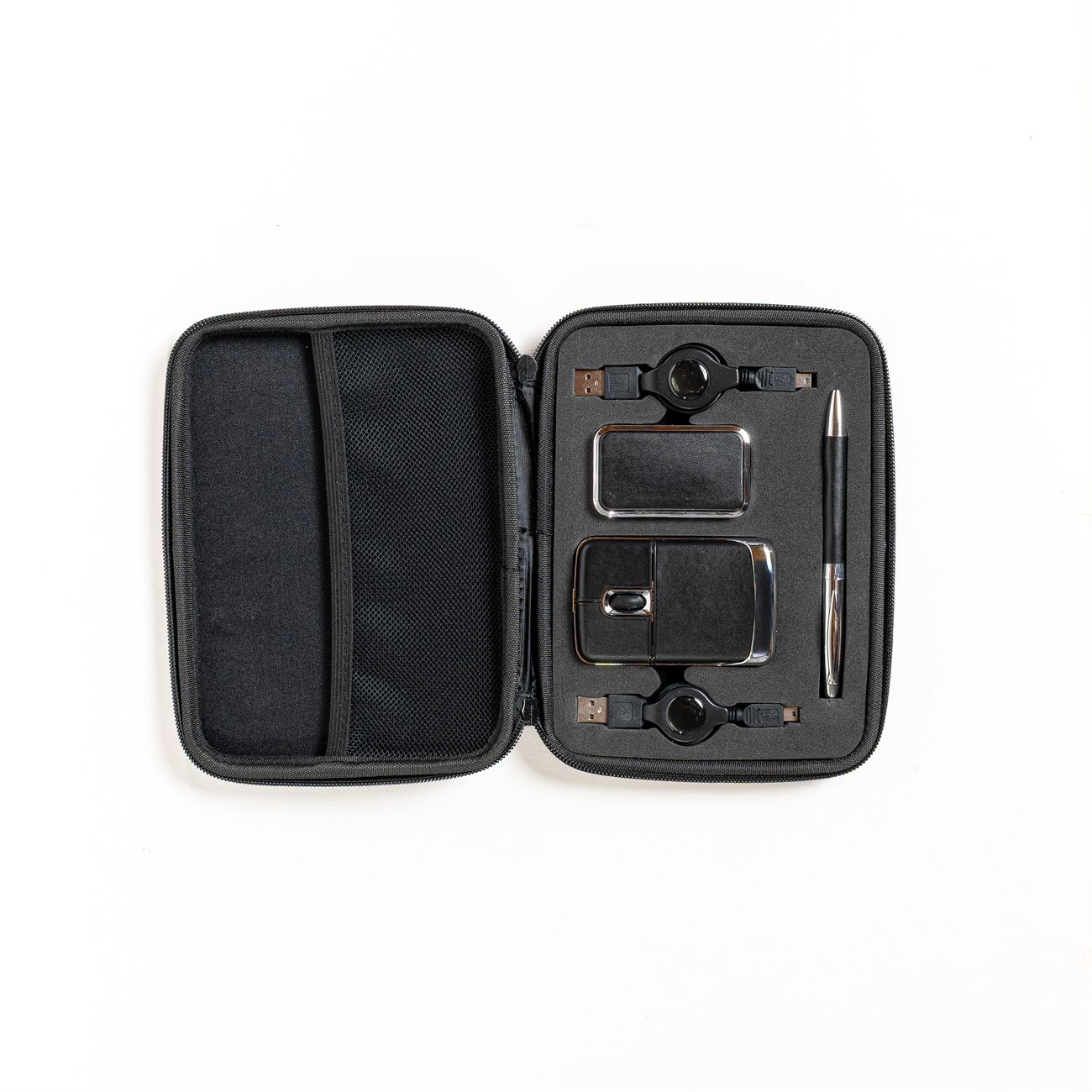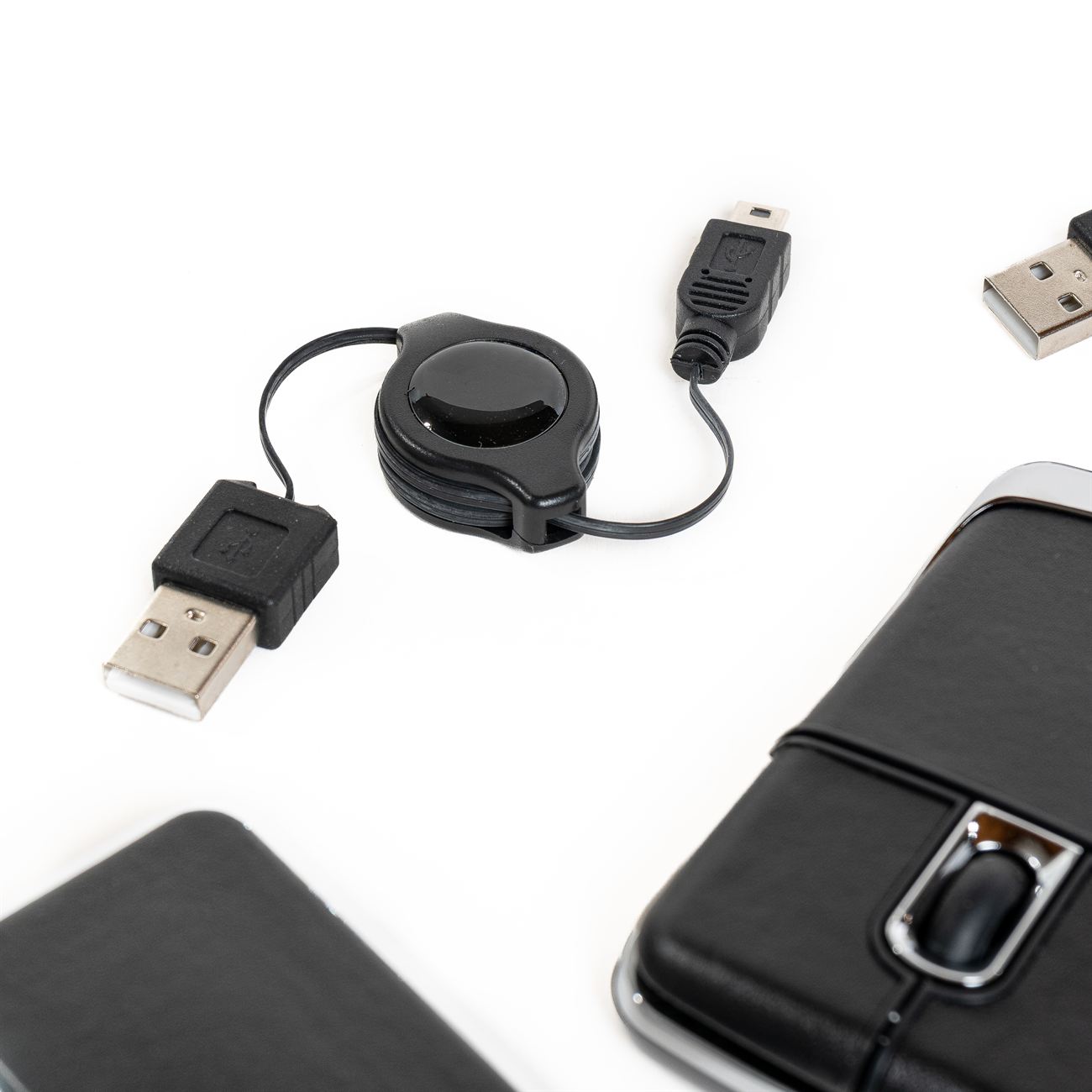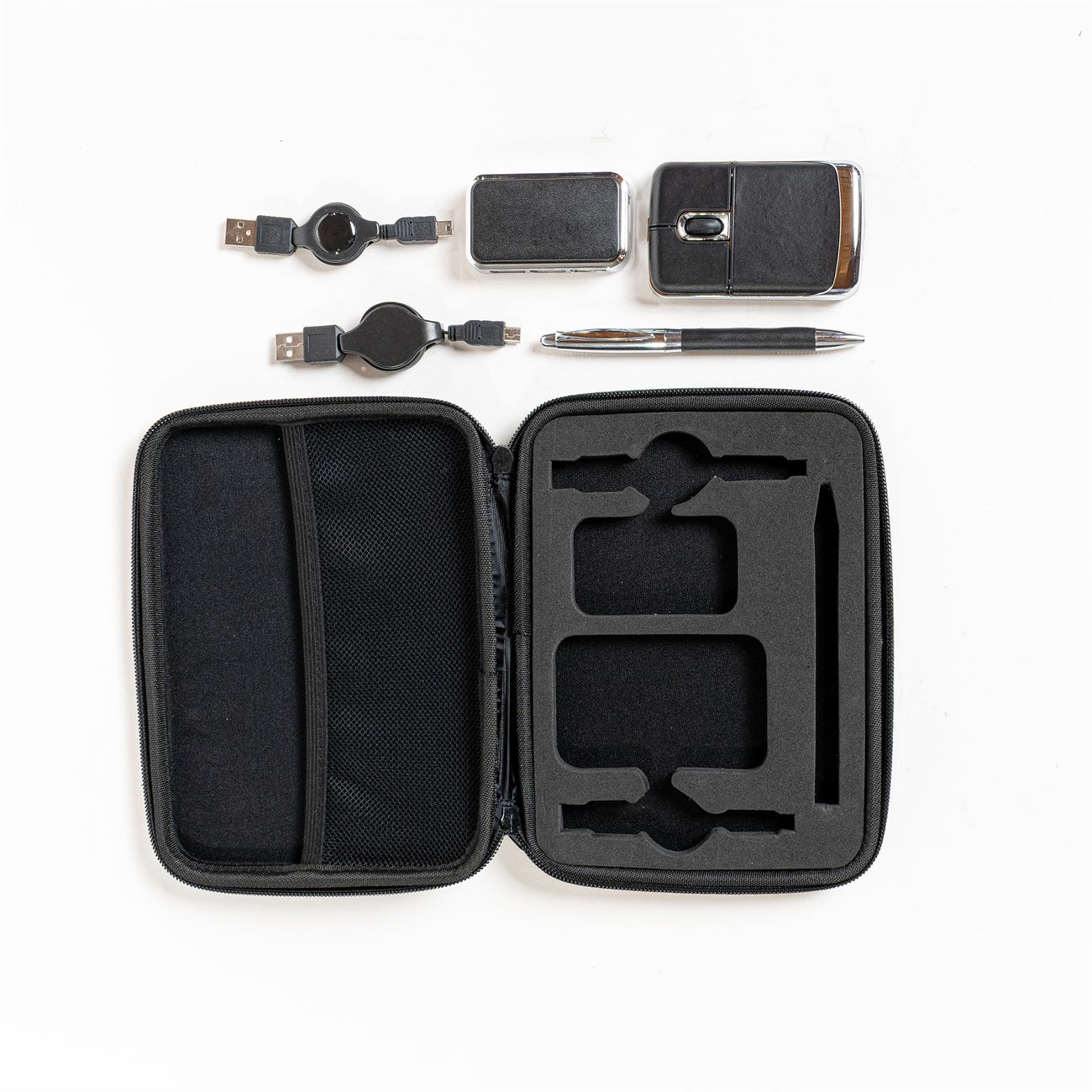 Descripción: Set para notebook compuesto de un mouse óptico y un multipuesto USB revestidos en simil cuero, además contiene un bolígrafo metálico con simil cuero y dos conectores extensibles. Presentación en estuche con cierre de simil cuero con bolsillo interior.