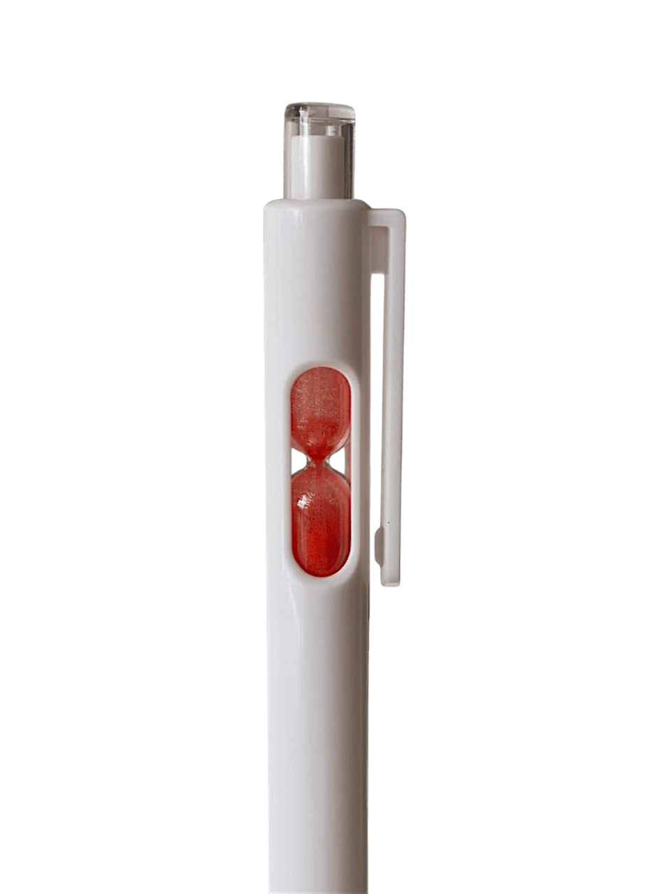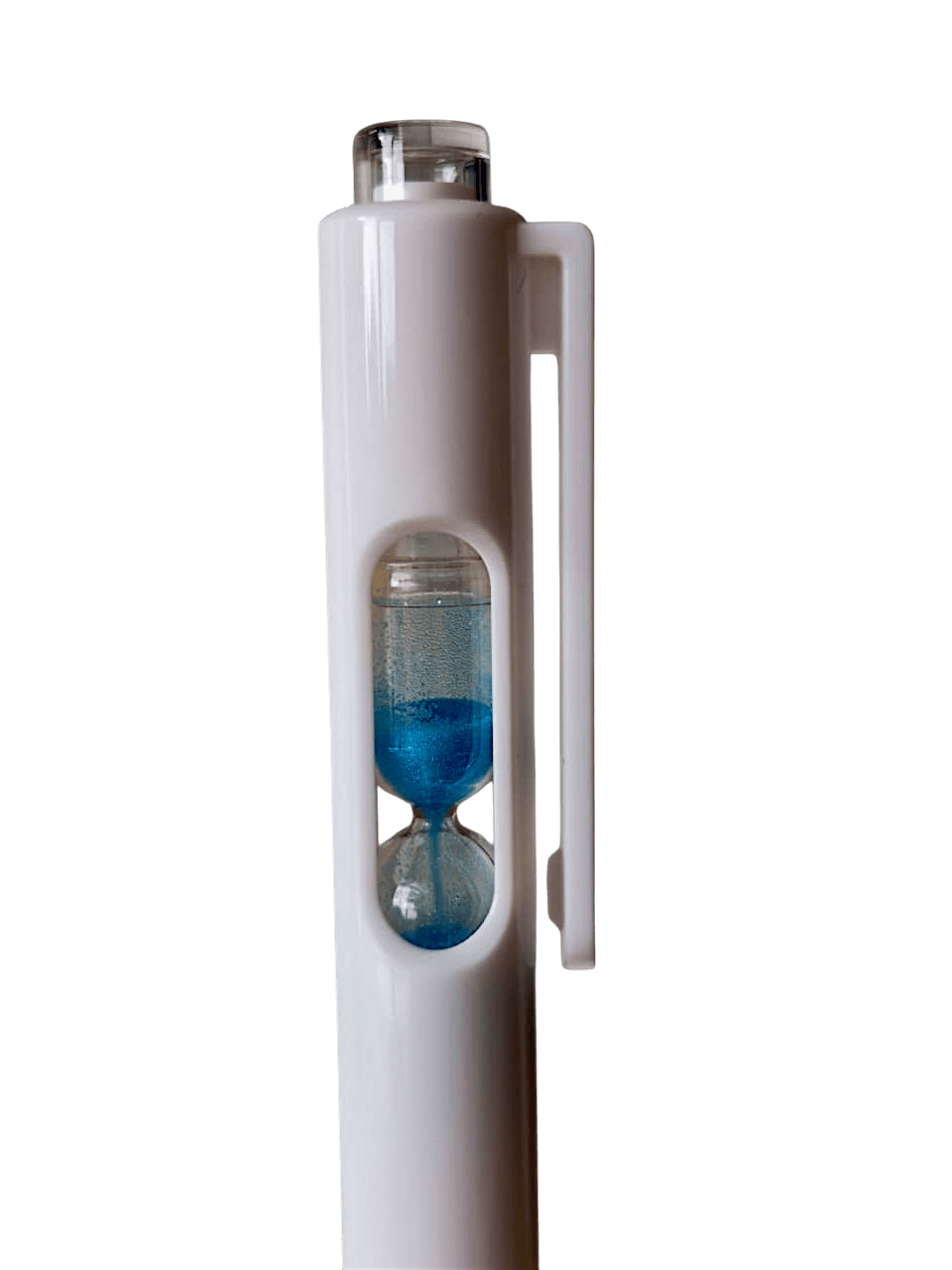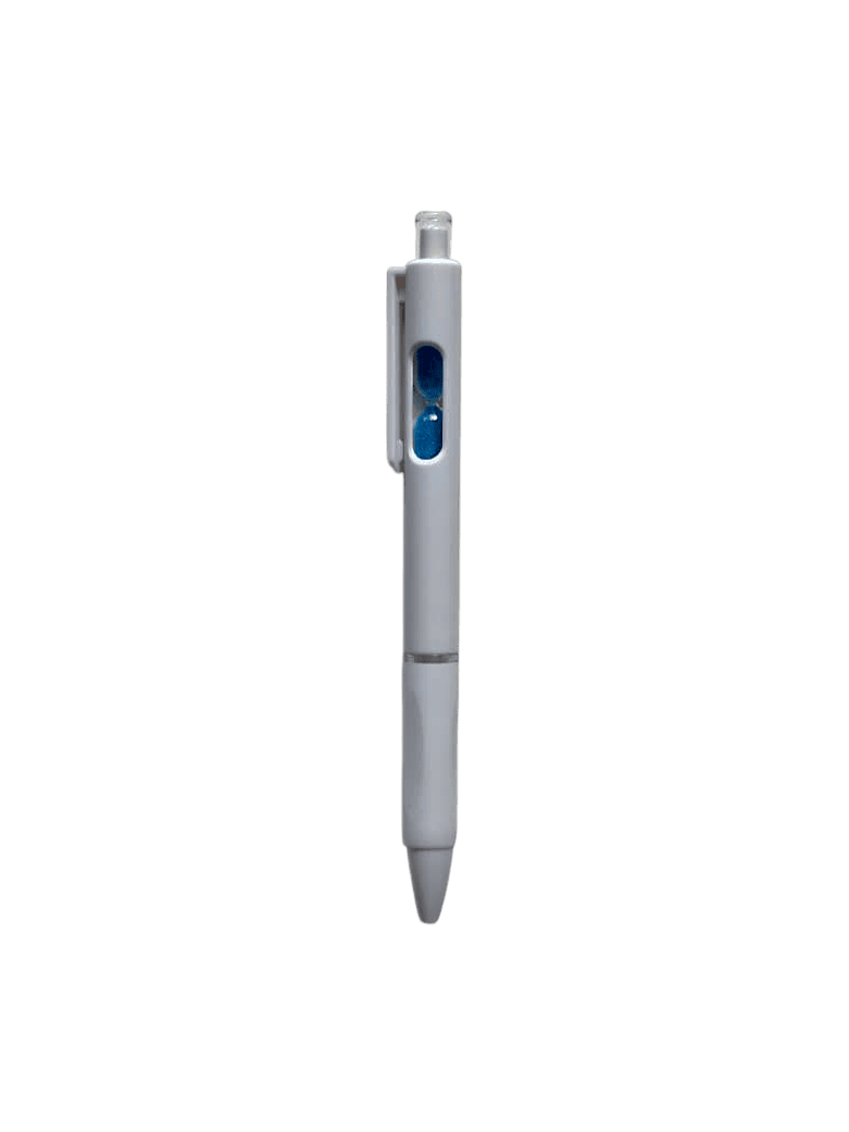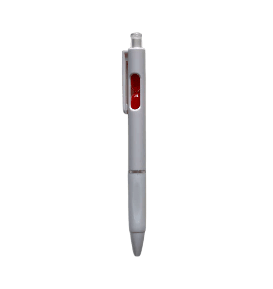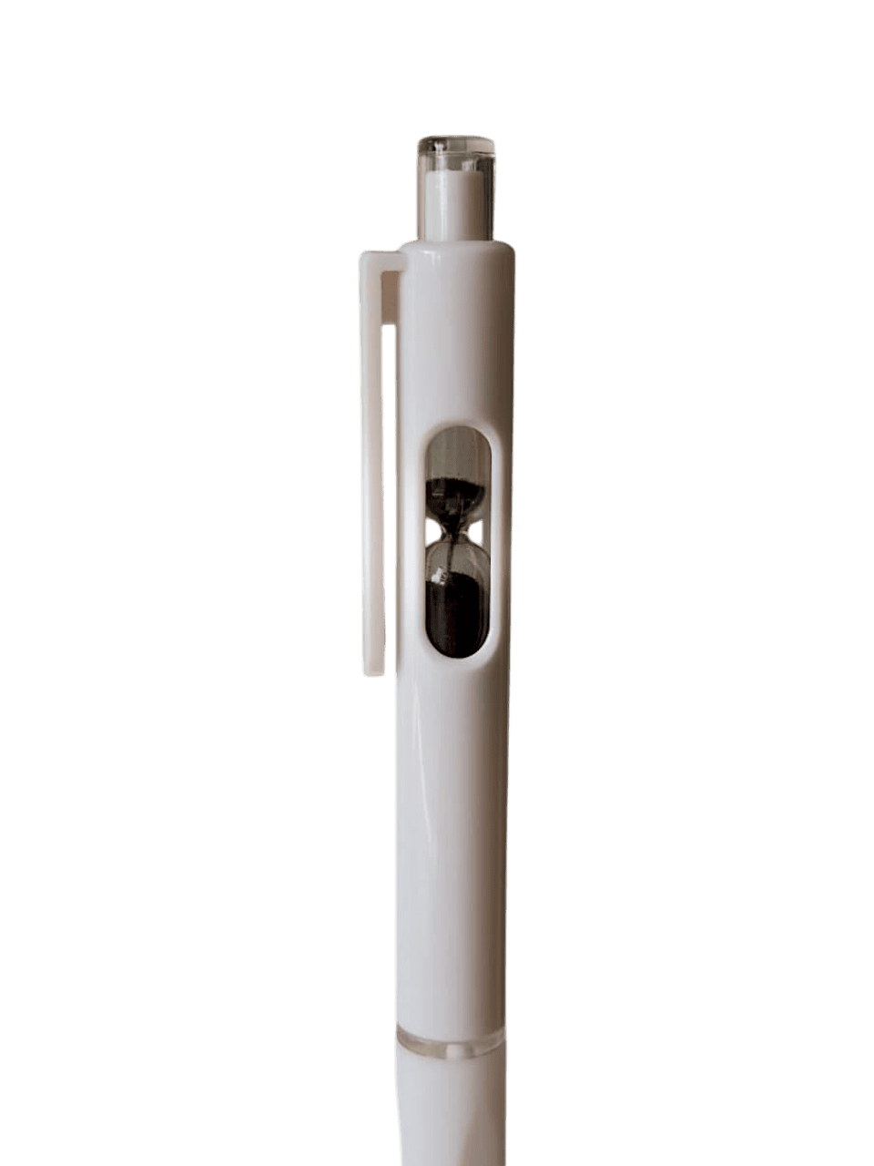 Bolígrafo retráctil con un pequeño reloj de arena en el interior. Cuerpo blanco, grip de goma, clip cristal y arena en varios colores.
