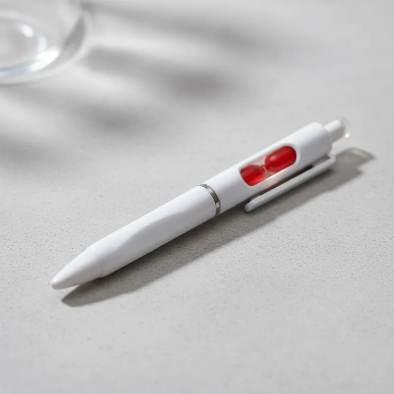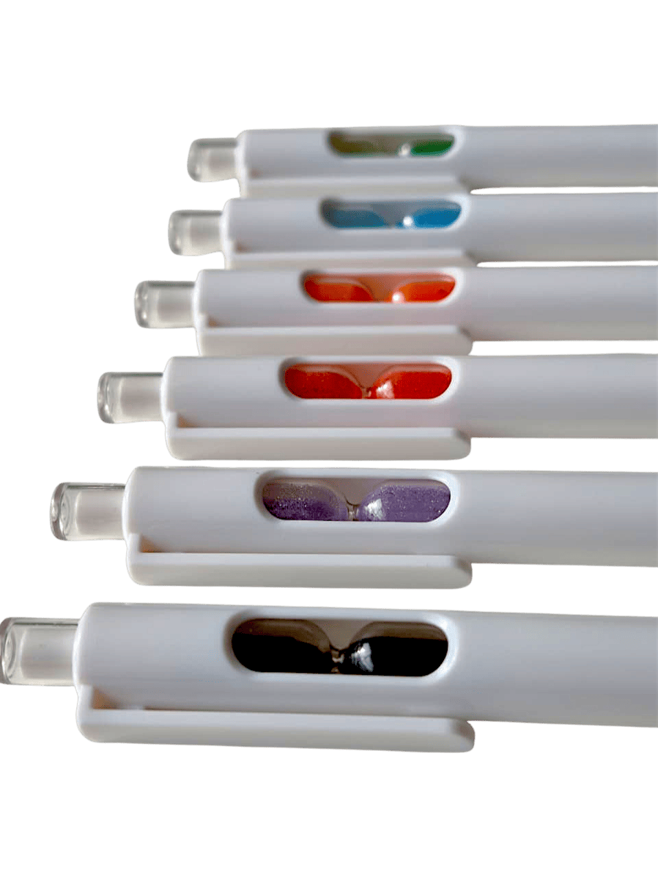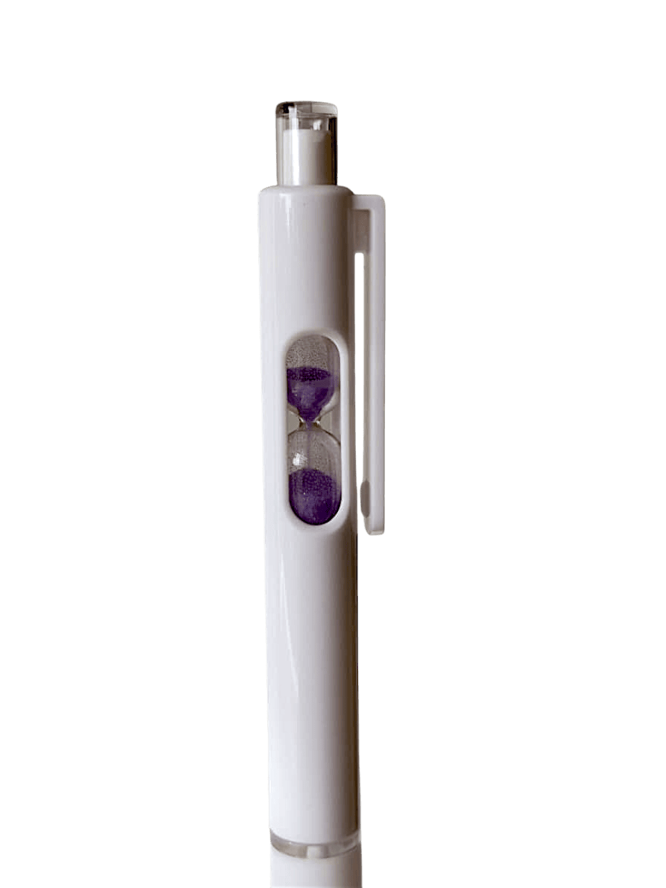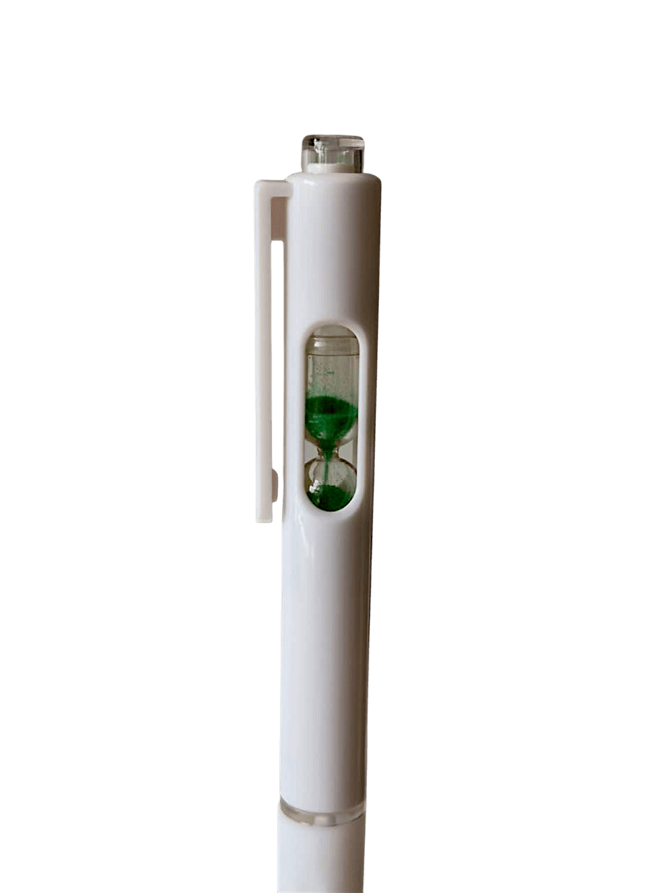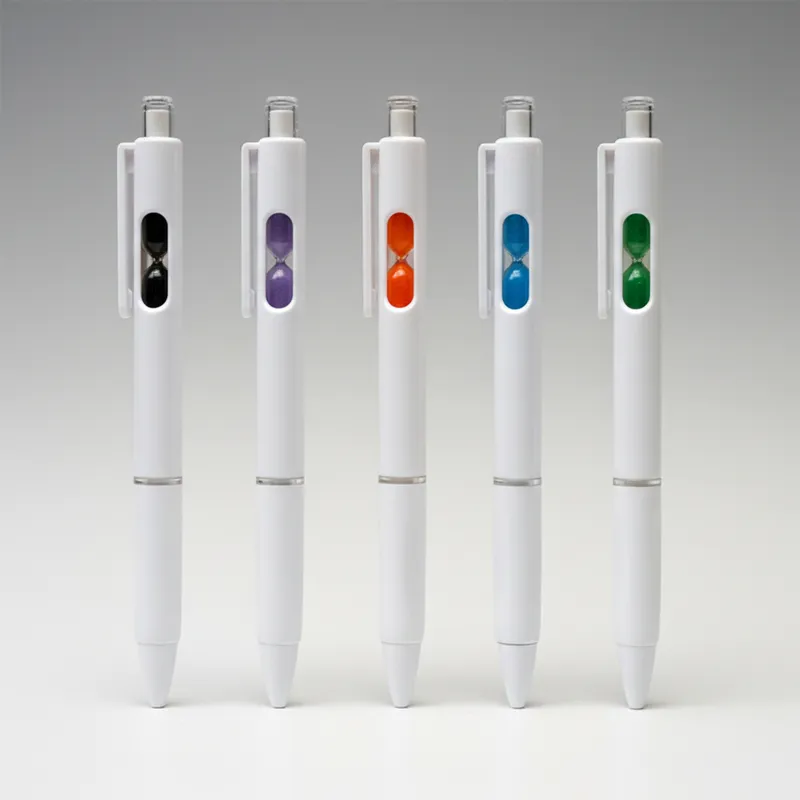 Bolígrafo retráctil con un pequeño reloj de arena en el interior. Cuerpo blanco, grip de goma, clip cristal y arena en varios colores.