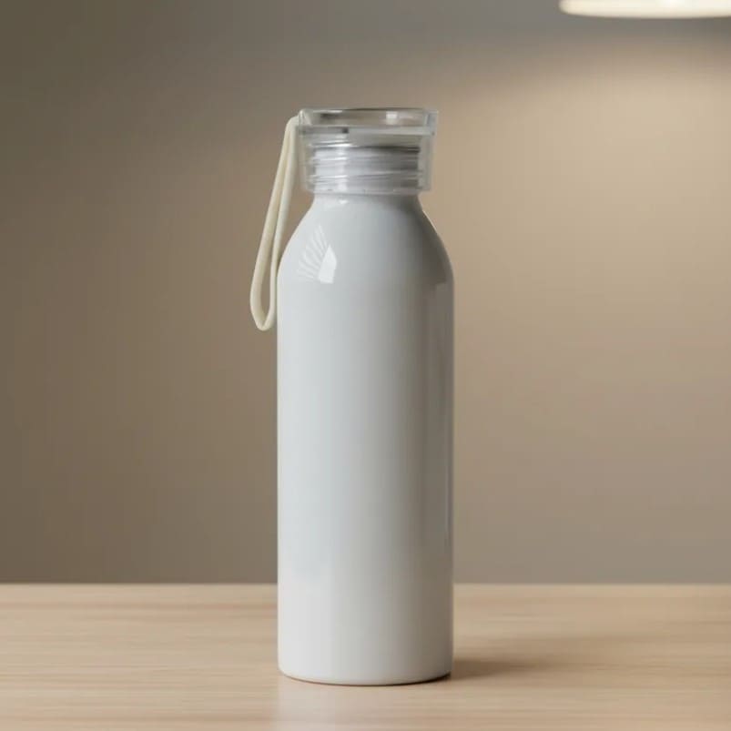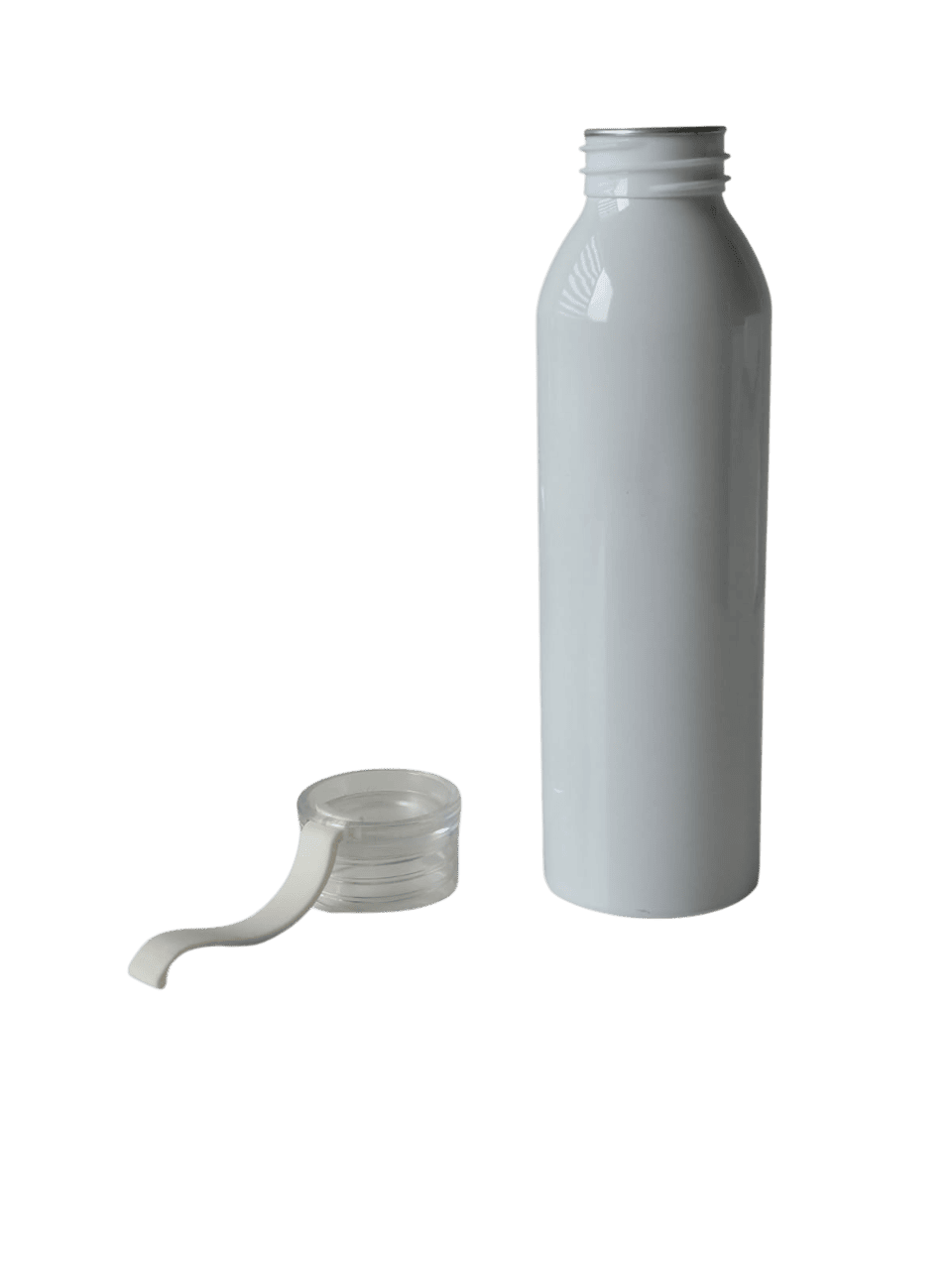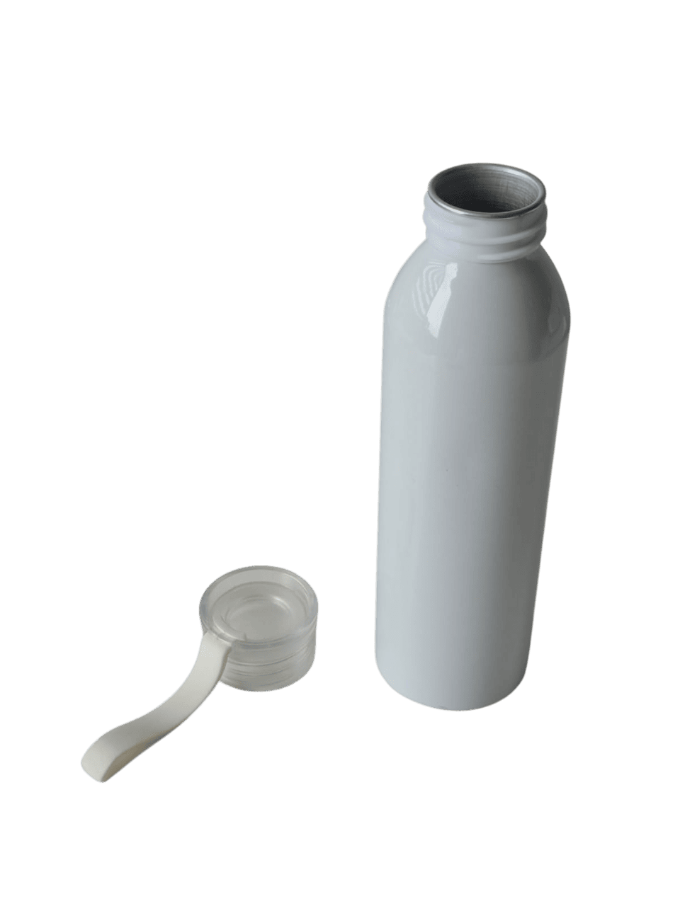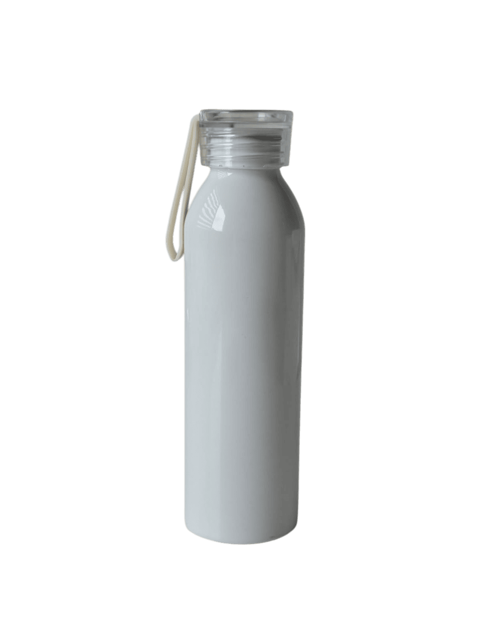 Botella de aluminio de 600ml pared simple. Tapa transparente a rosca con tira de agarre de silicona de 8 cm. Incluye caja de cartón blanca.